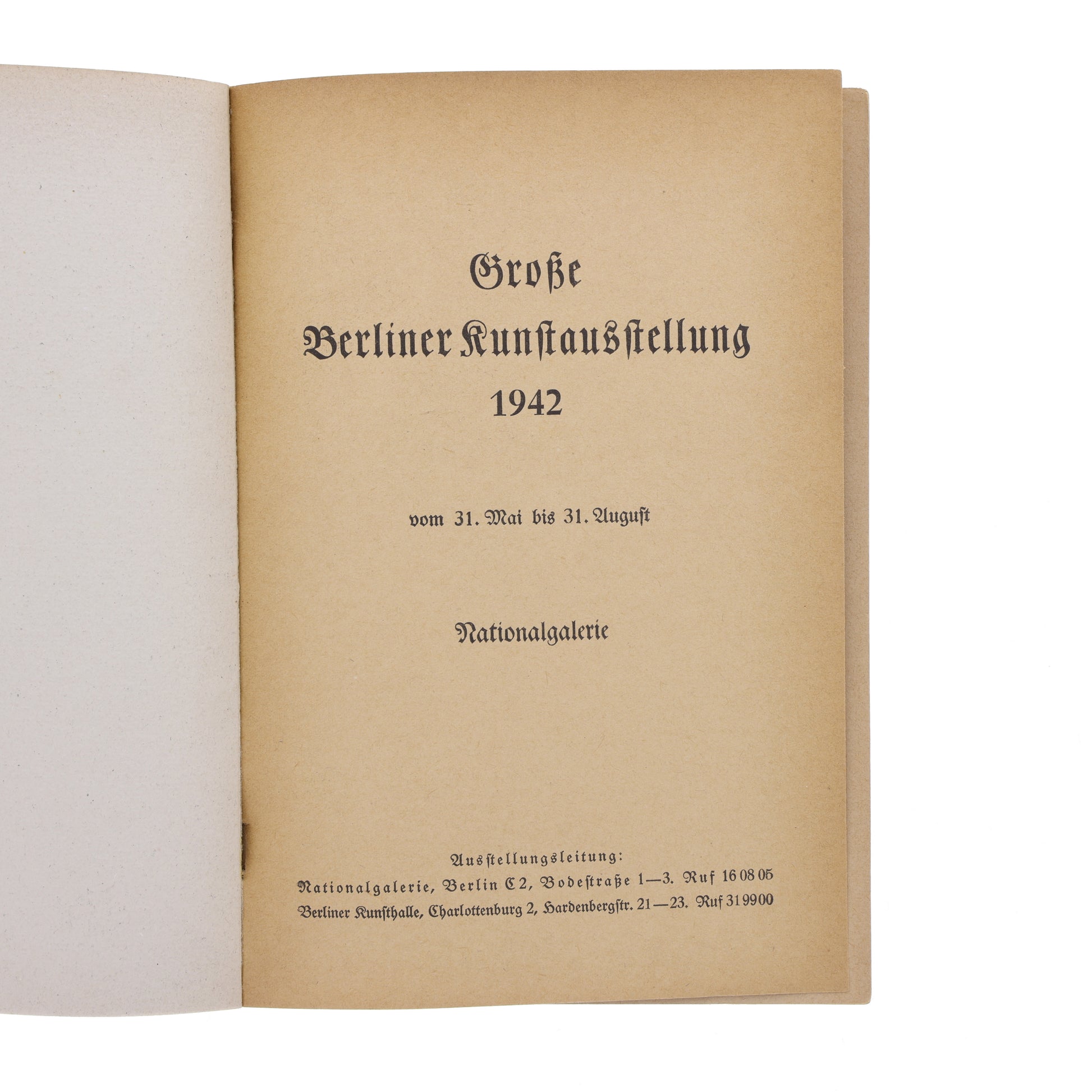The Grosse Berliner Kunstausstellung was an annual art exhibition held in Berlin's Nationalgalerie. This book is especially interesting as it documents the 1942 exhibition, while the Third Reich was fully involved in Operation Barbarossa. Featured are some of the exhibition's most notable pieces, including those by Arno Breker (1900–1991), a sculptor, whose works were the antithesis of Entartete Kunst, or degenerate art.