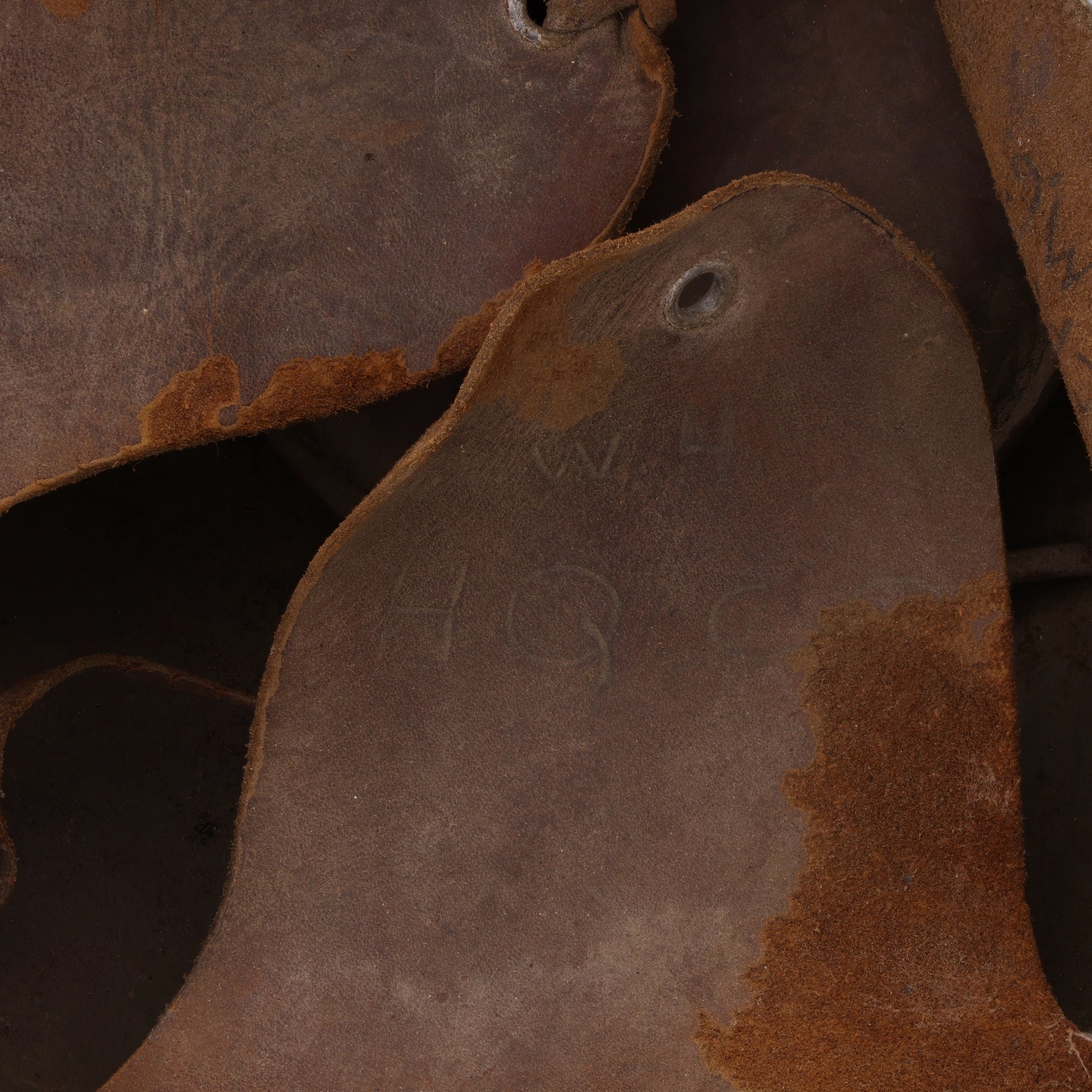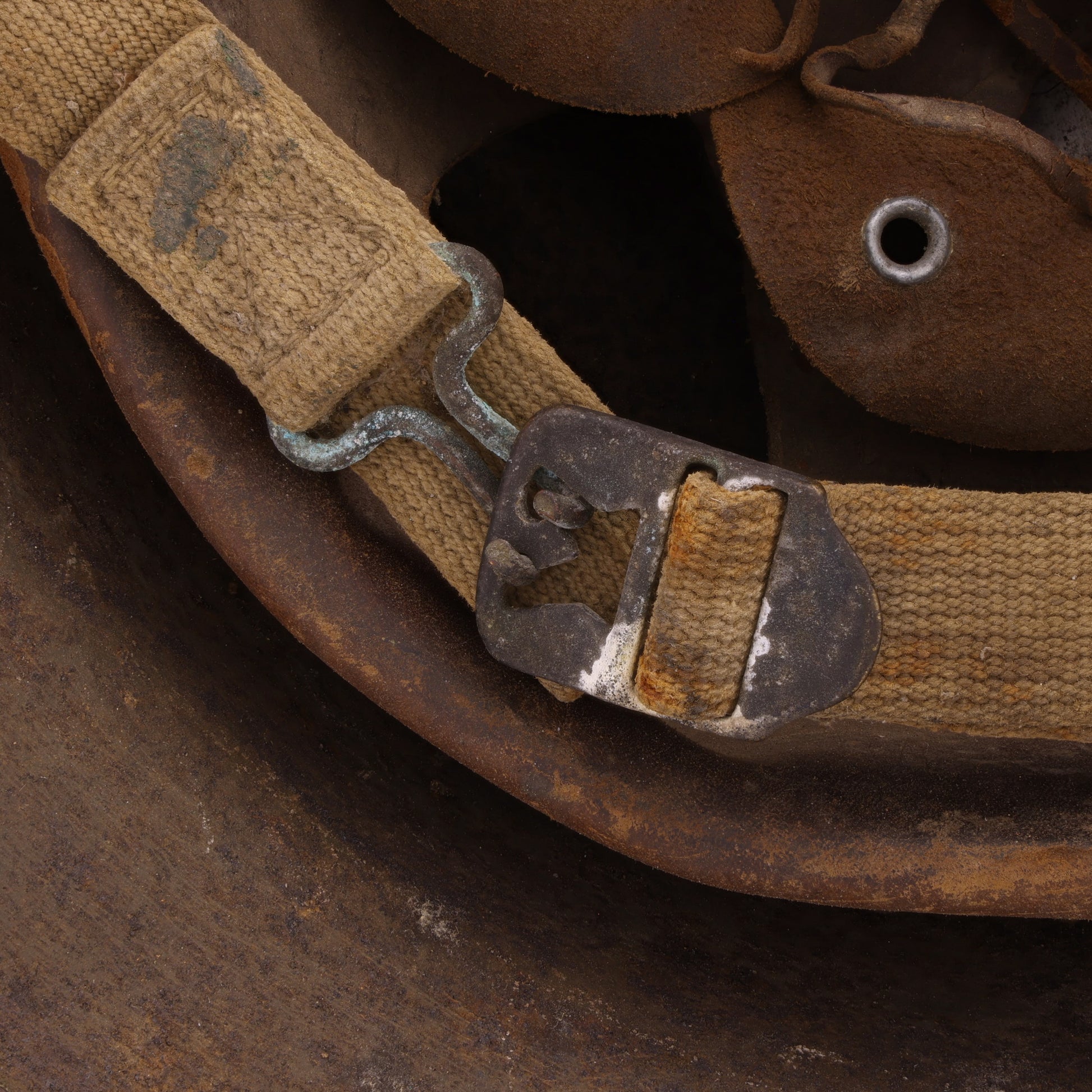 This is an original WWI U.S. M1917 helmet that was converted to an M1917A1 "Kelly" during a reconditioning process that first began in 1936, prior to McCord Radiator & Manufacturing Co.'s new production line of M1917A1 helmets in 1941. This particular example's lot number of "_79" is partially concealed beneath its field repaint; however, we can be certain it is of WWI U.S. manufacture given the overlapping brim and domed rivet heads. The helmet retains its original olive drab field repaint and sand texture. Its original leather liner and OD#3 (khaki) chinstraps are still present. The chinstraps exhibit the early cast-brass buckle and box stitching, while the liner retains its original, but torn, leather drawstring and crown pad. The leather is inscribed with the original owner's rank and initials, "CPL RMG", and a headquarters marking, "W.H., HQ Co."