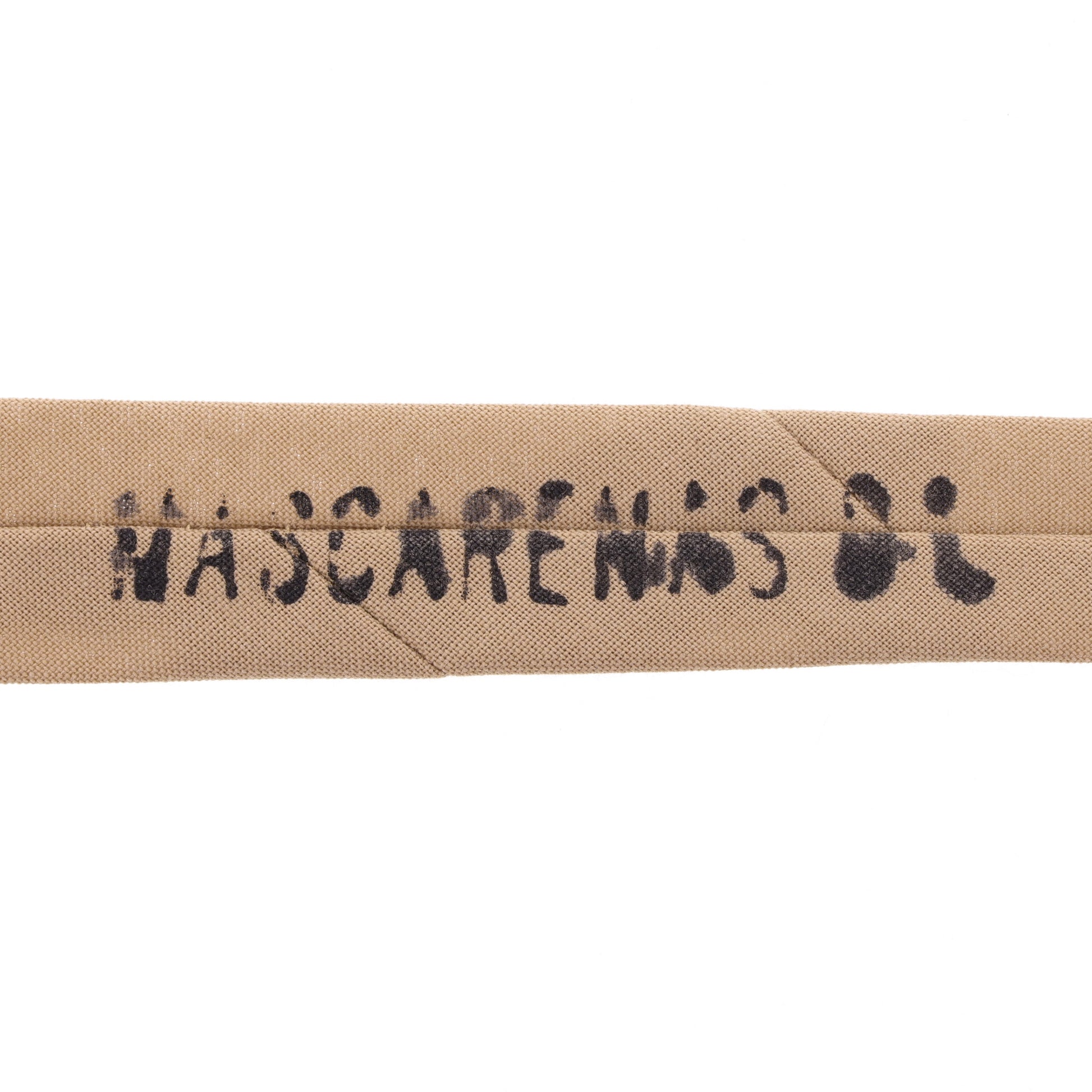 This original Vietnam War U.S. Army necktie was manufactured by Lighthouse for the Blind, Inc. in 1975. It is constructed of a khaki wool/polyester blend, and is even identified to its original owner, an apparent "G. L. Nascarenas". It measures approximately 3 inches at its widest point and 53 inches in length.