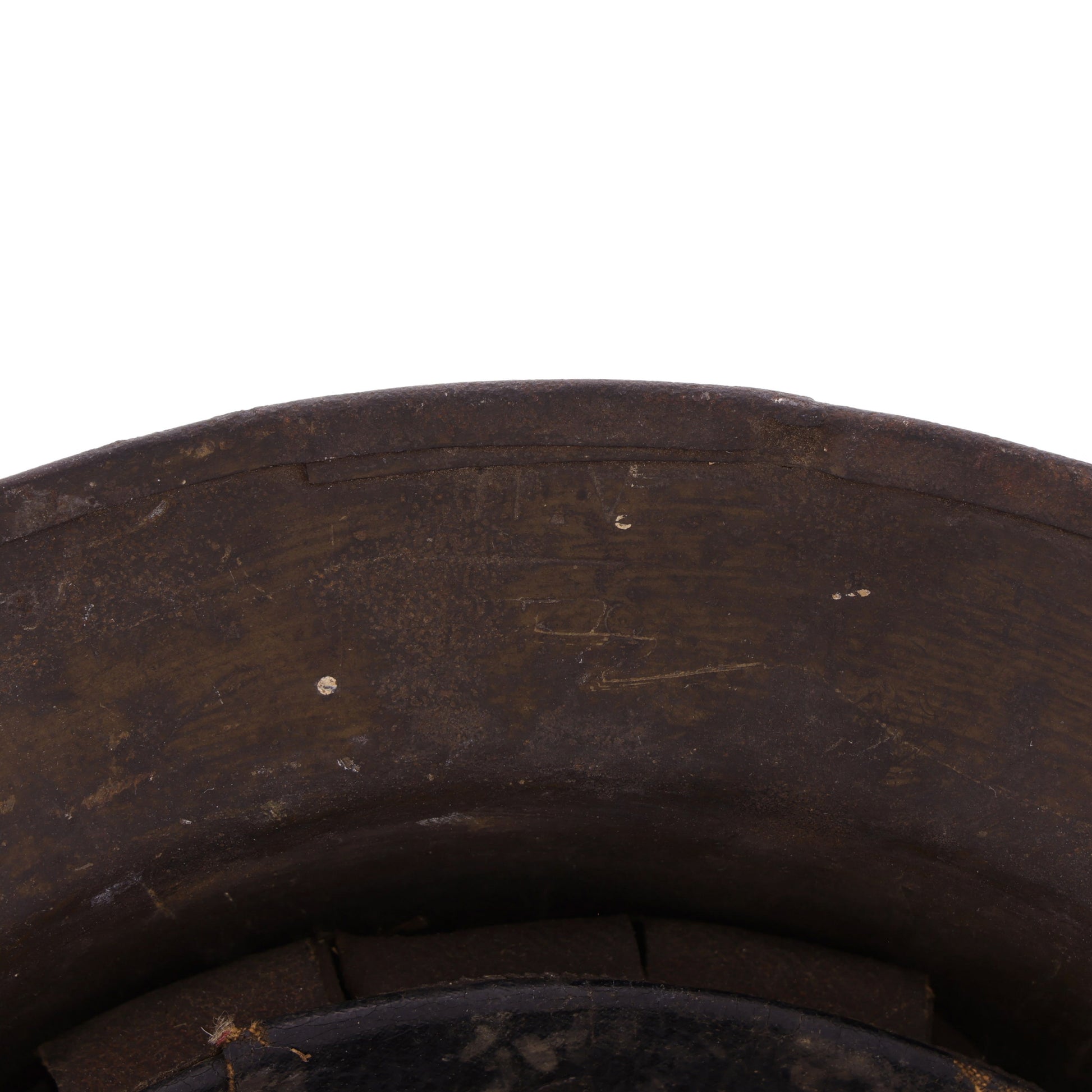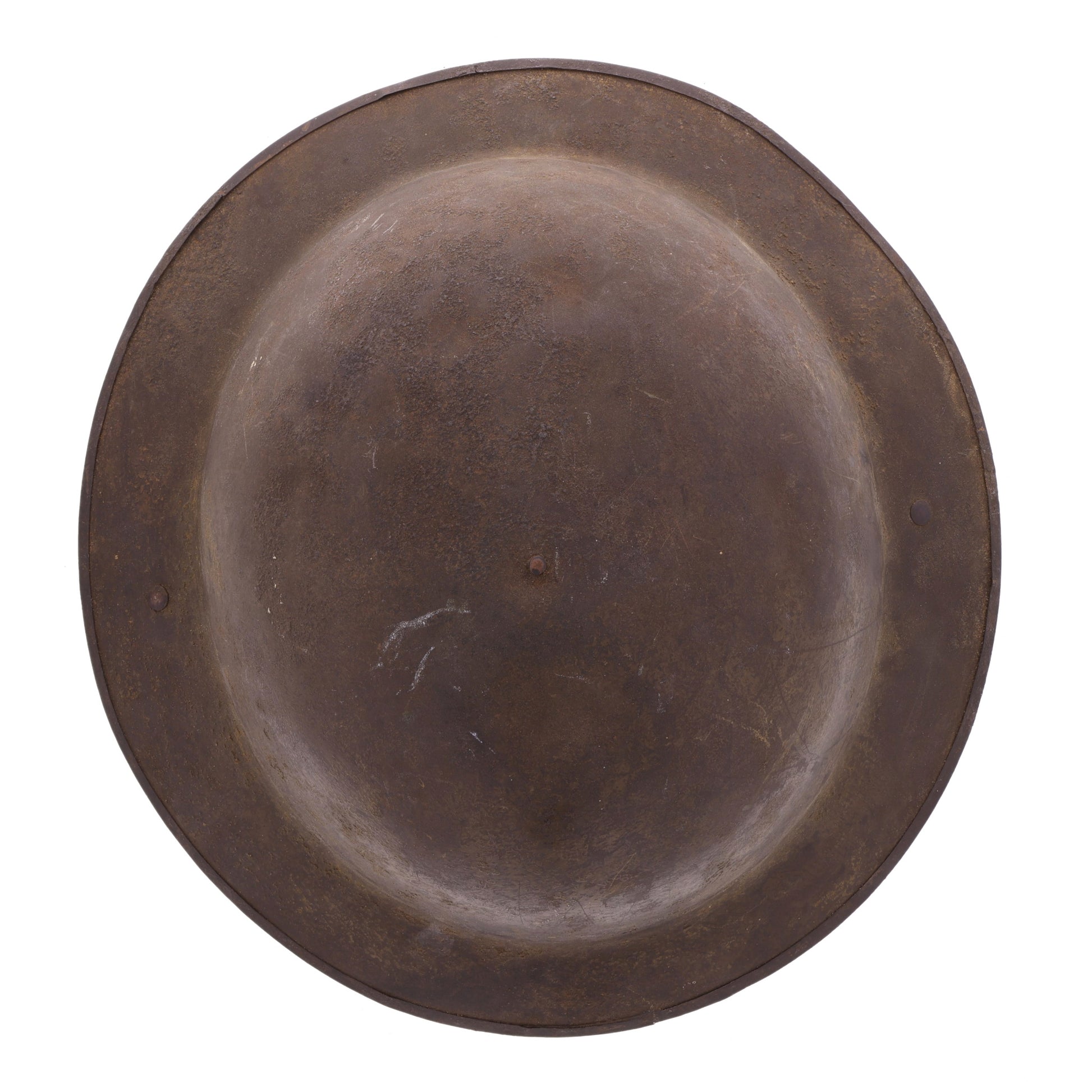 This is an original WWI British Mark I "Brodie" helmet. It retains its original brush-applied apple green factory finish. The helmet's interior brim is marked "HV 38", denoting production by William Hutton & Sons Ltd. of Sheffield, England, with steel provided by Vickers Limited, also of Sheffield. Its original oil cloth liner is still present; however, its leather chinstrap has unfortunately torn near the chinstrap loops, which are secured by split rivets. A rubber ring is present in the crown's interior. These were introduced in mid-1917 to provide an additional buffer between the wearer’s head and the top of the helmet.