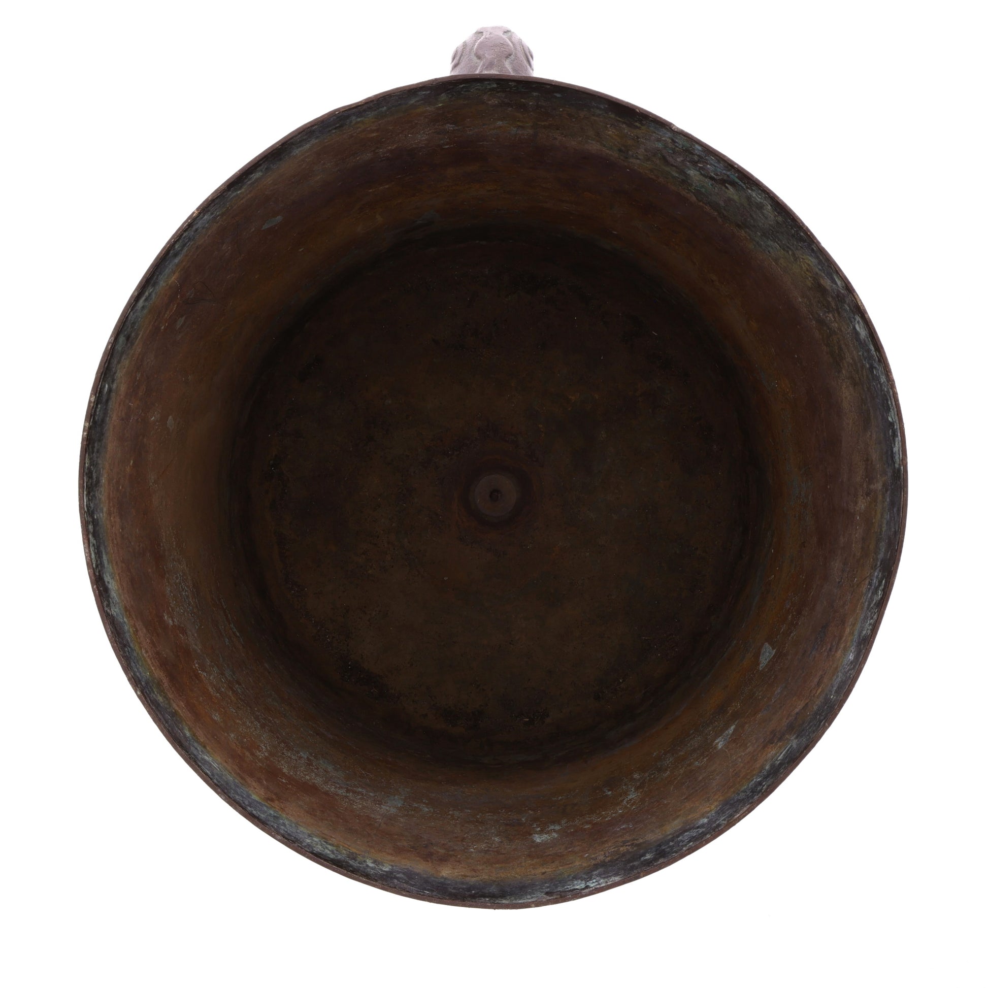Unfortunately, this piece of trench art is missing one of its two decorative elephant's trunk handles and the brass has oxidized over time.