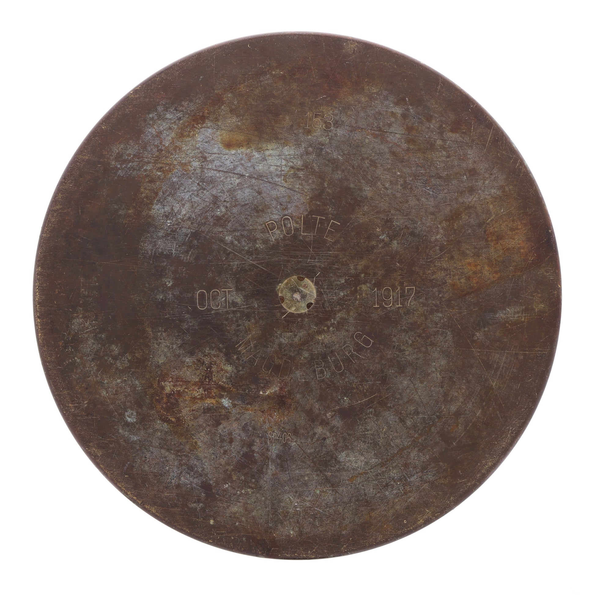This is an original, and rather large WWI Imperial German brass 21cm Mörser Model 1910 artillery shell that was modified, likely at war's end, to serve as a champagne bucket with the addition of originally two decorative elephant's trunk handles. The shell's bottom is marked "POLTE, OCT 1917, MAGDEBURG", which denotes October 1917 production by Polte Armaturen- und Maschinenfabrik OHG of Magdeburg, Germany. Beneath these markings is an inspection stamping of "SP406". It measures approximately 9 inches wide and 9 inches tall.