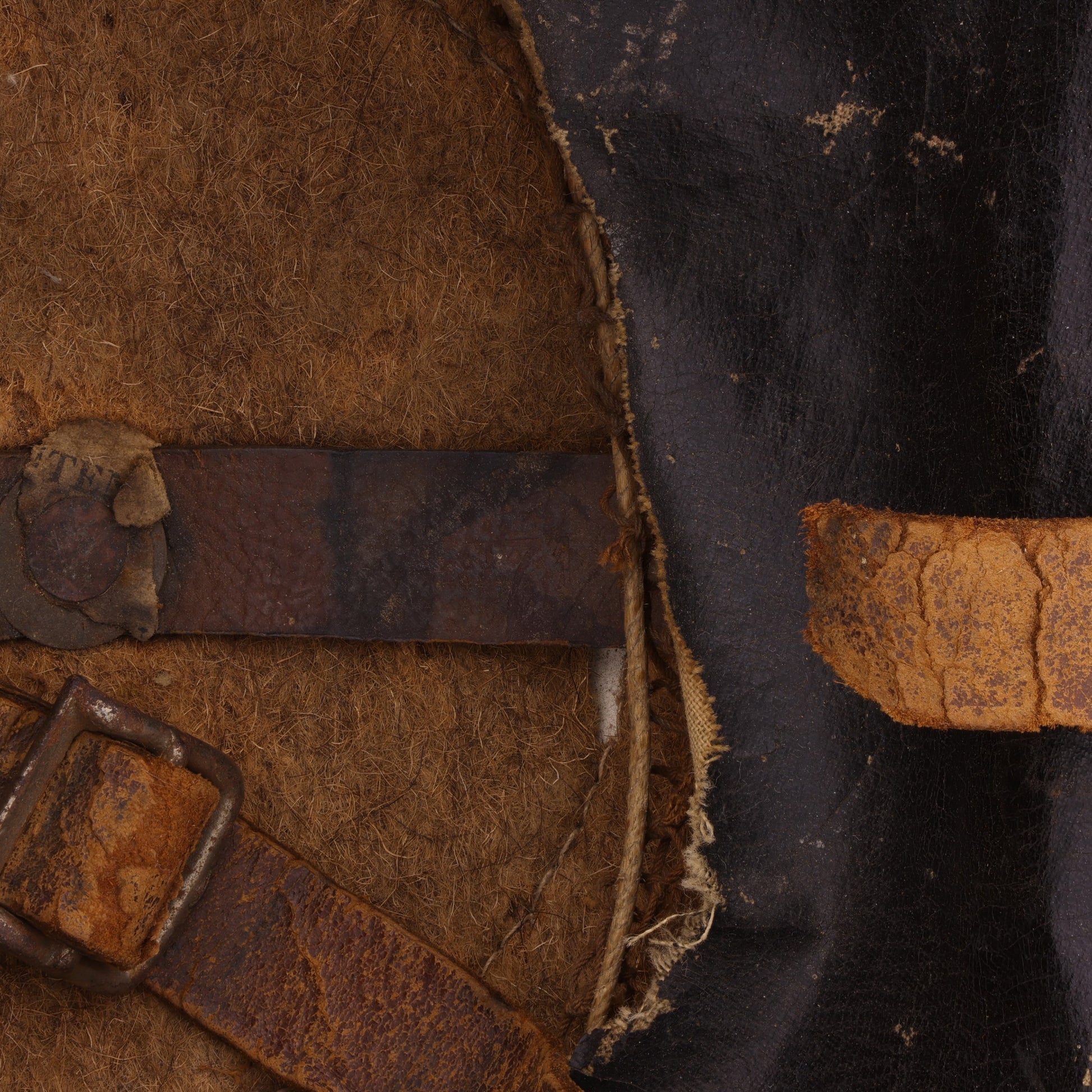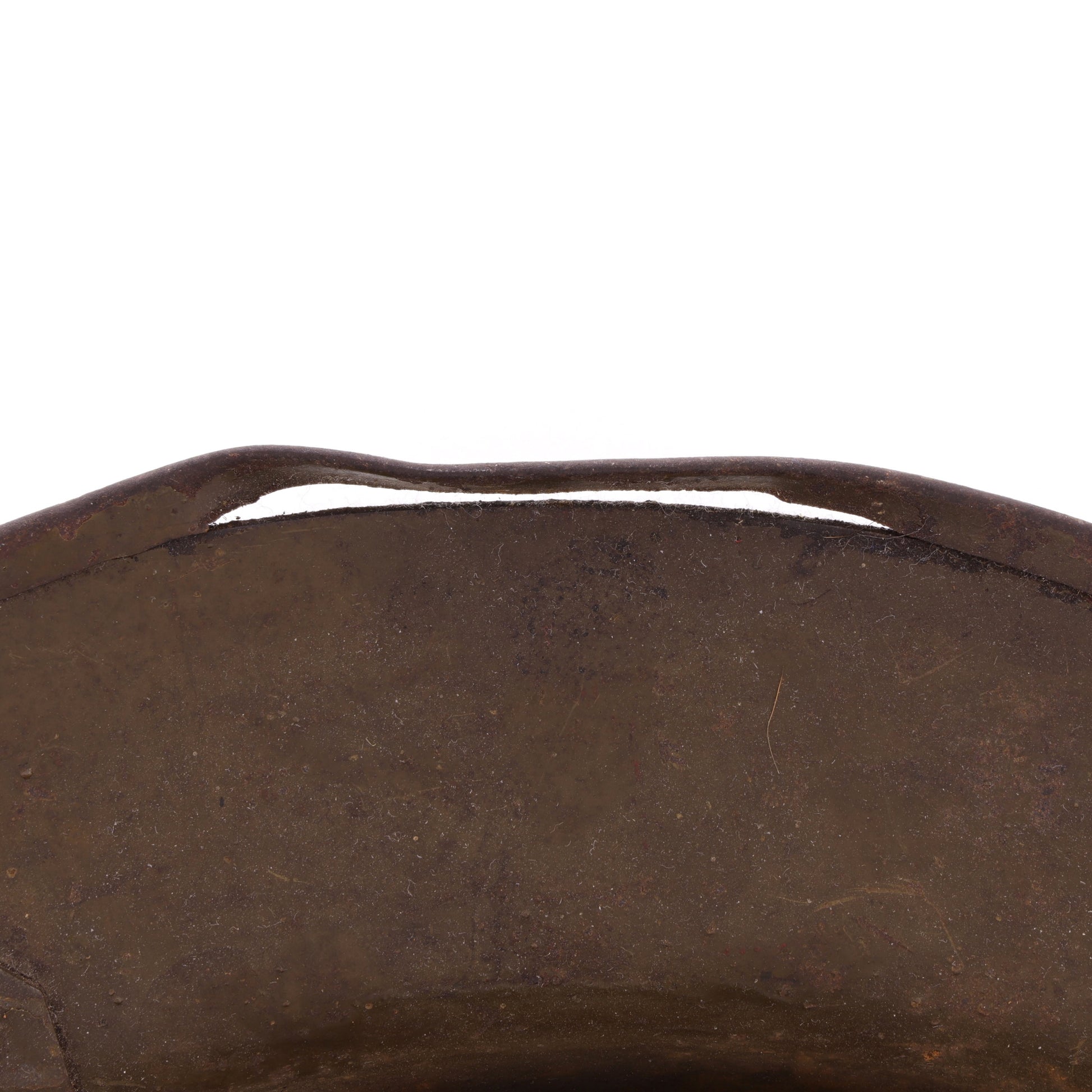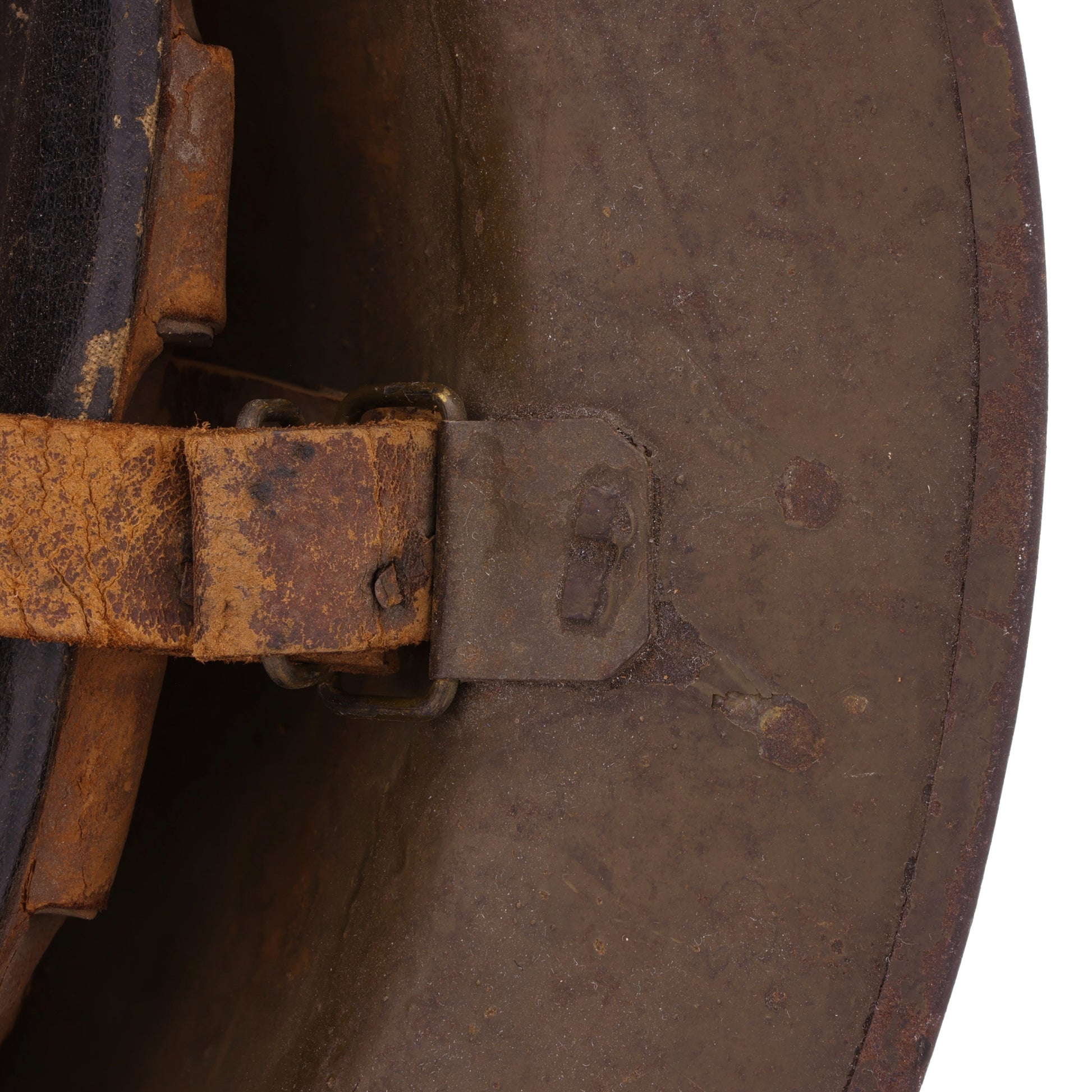 For being well over 100 years old, this helmet is in fair condition. The factory finish is exceptional; however, the leather chinstrap is unfortunately torn, and the helmet's rim is dented.