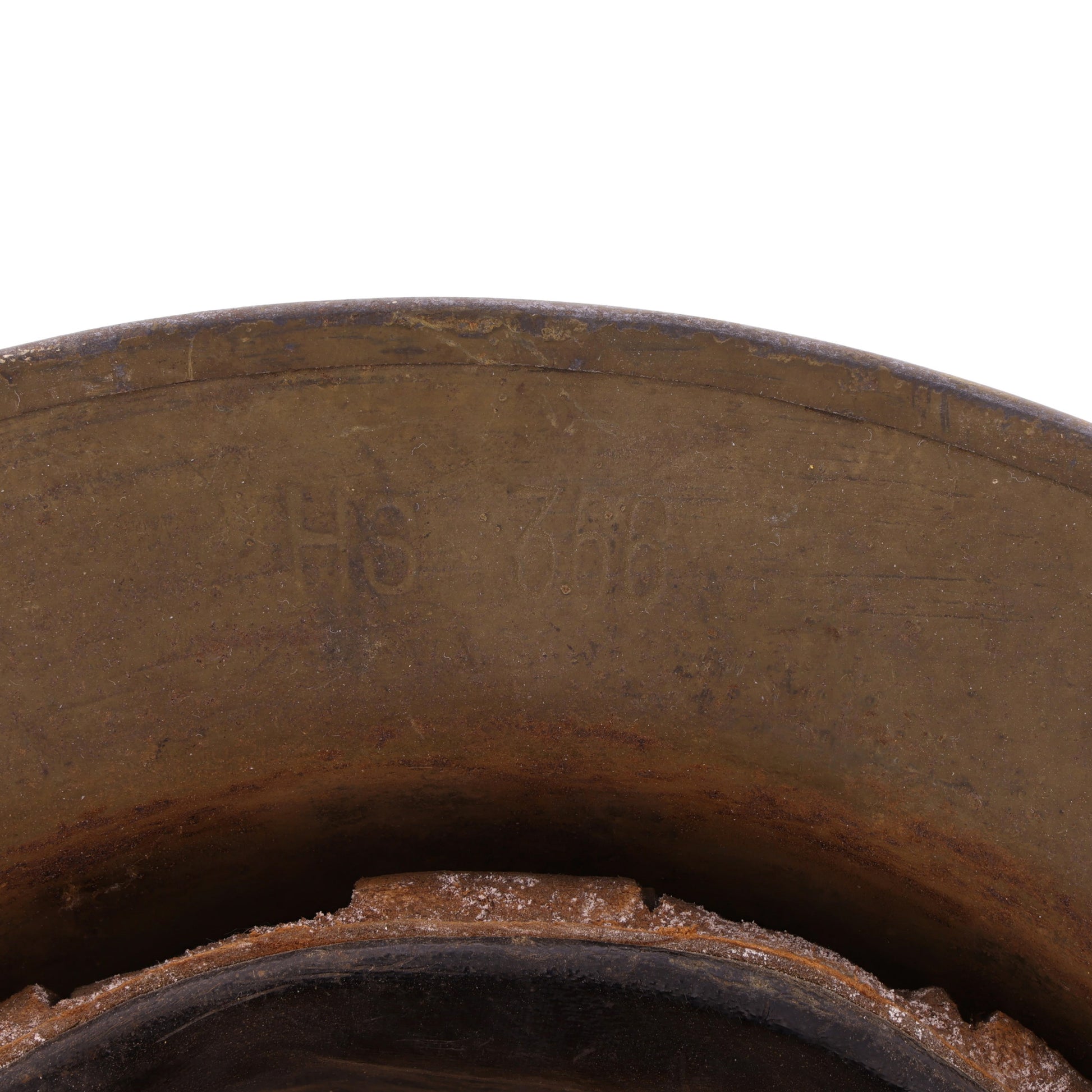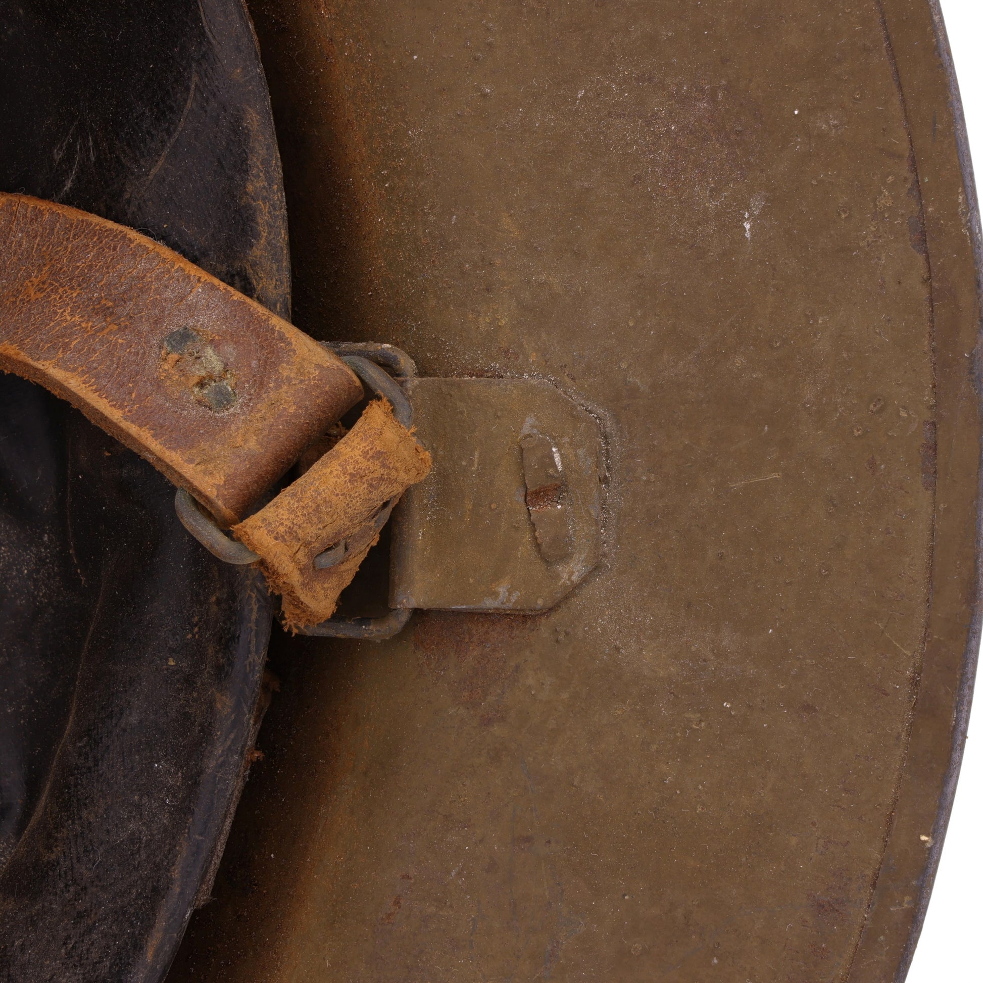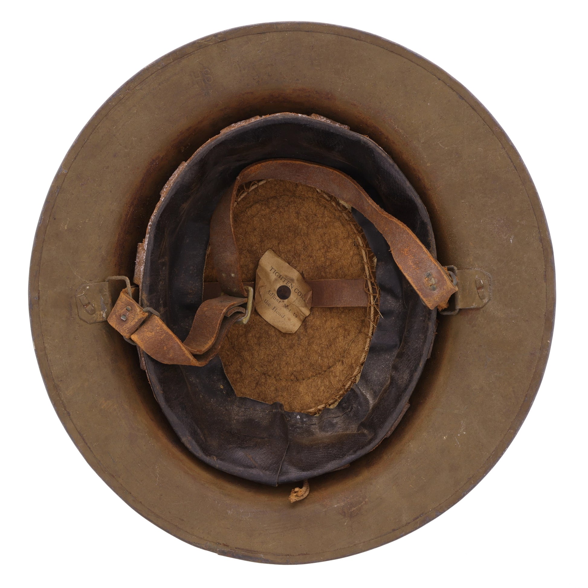 This is an original WWI U.S. M1917 "Brodie" helmet of British manufacture. Before the U.S. began production of the M1917 helmet, it acquired from the British a supply of 400,000 Mark I helmets. This particular example's interior brim is marked "HS 366", denoting production by Hadfield Ltd. of Sheffield, England. The helmet retains its original sawdust textured olive drab factory finish. Its original oil cloth liner and leather chinstrap are still present, and the chinstrap loops are secured by split rivets.
