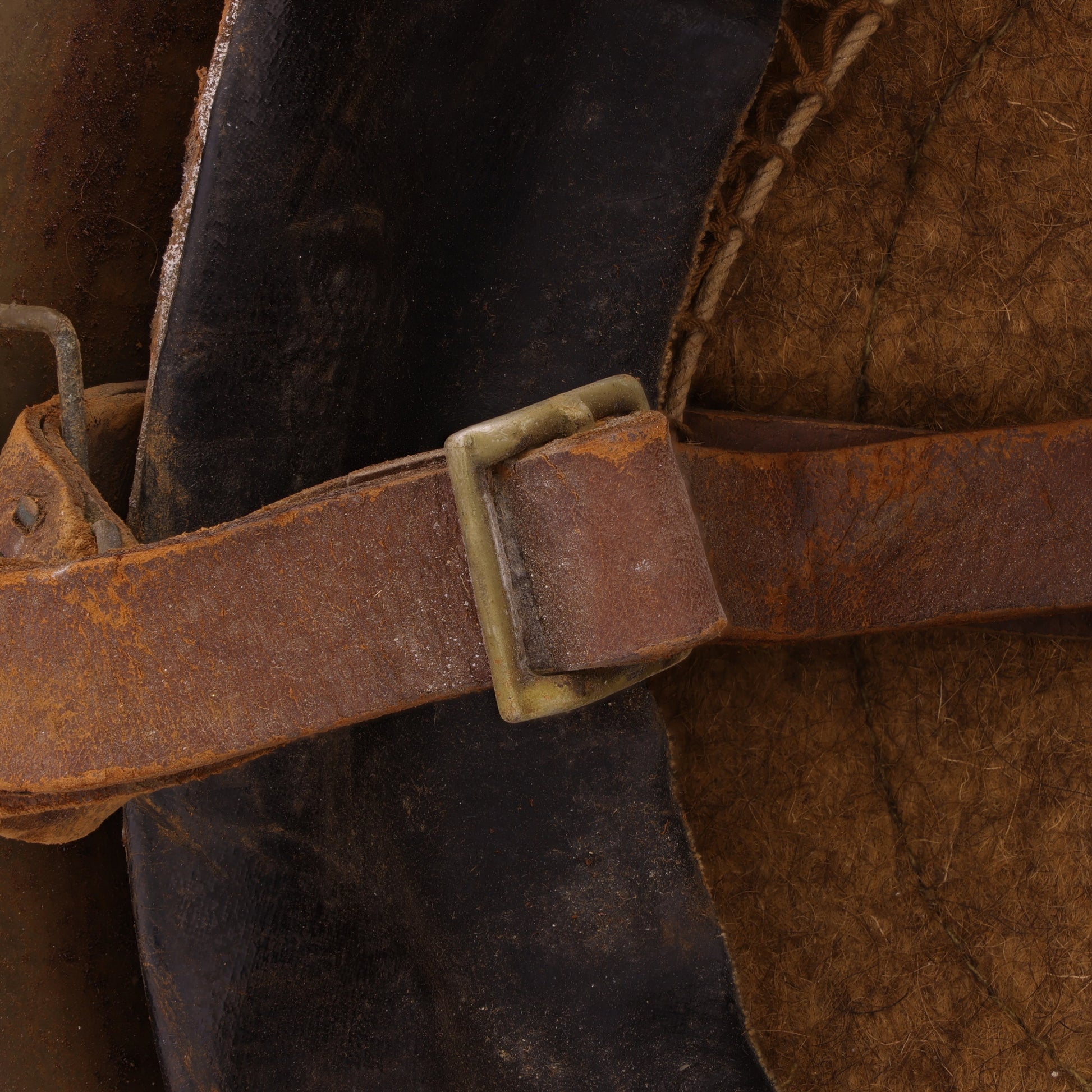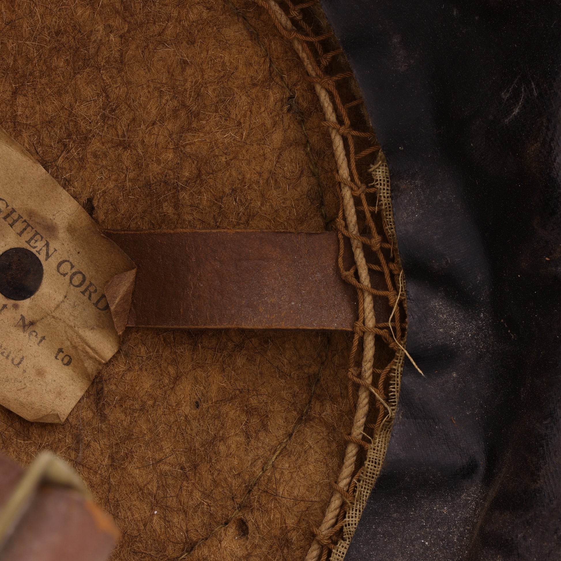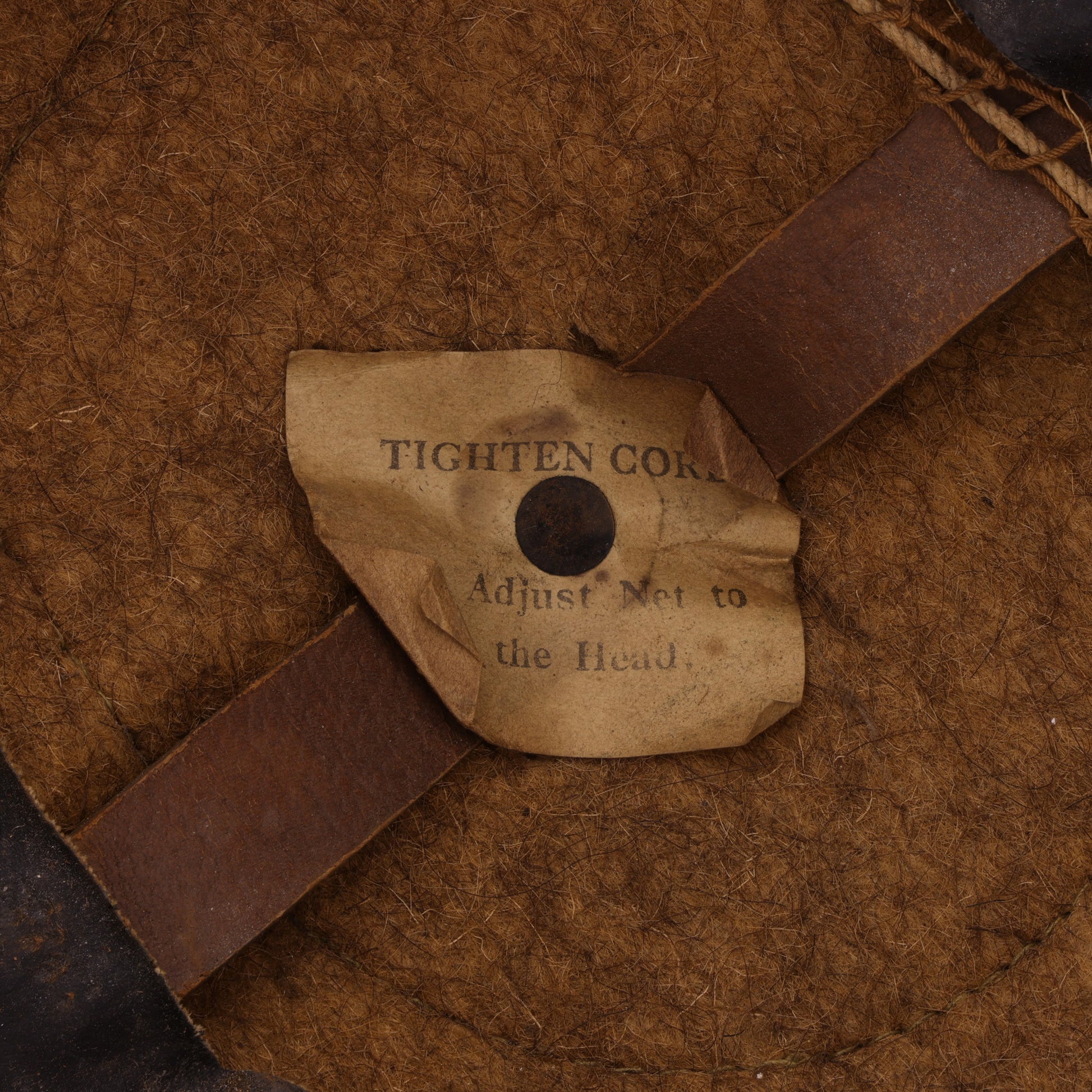 For being well over 100 years old, this helmet is in excellent condition. The factory finish is exceptional, the oil cloth liner and leather chinstrap are fully intact, and the liner even retains its original instruction label.