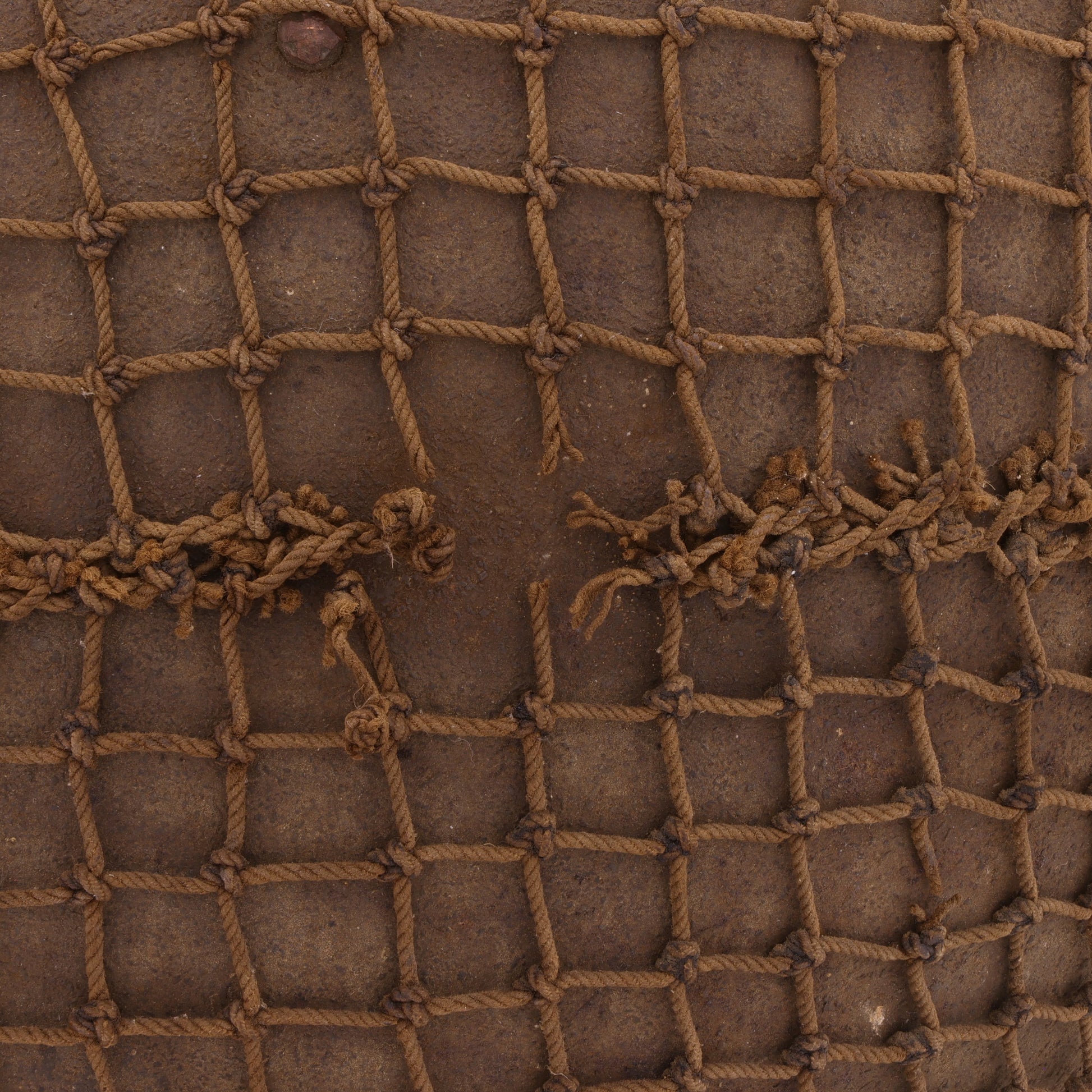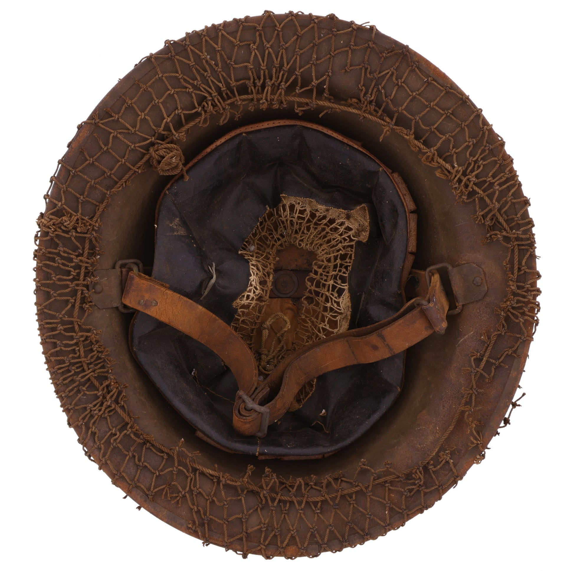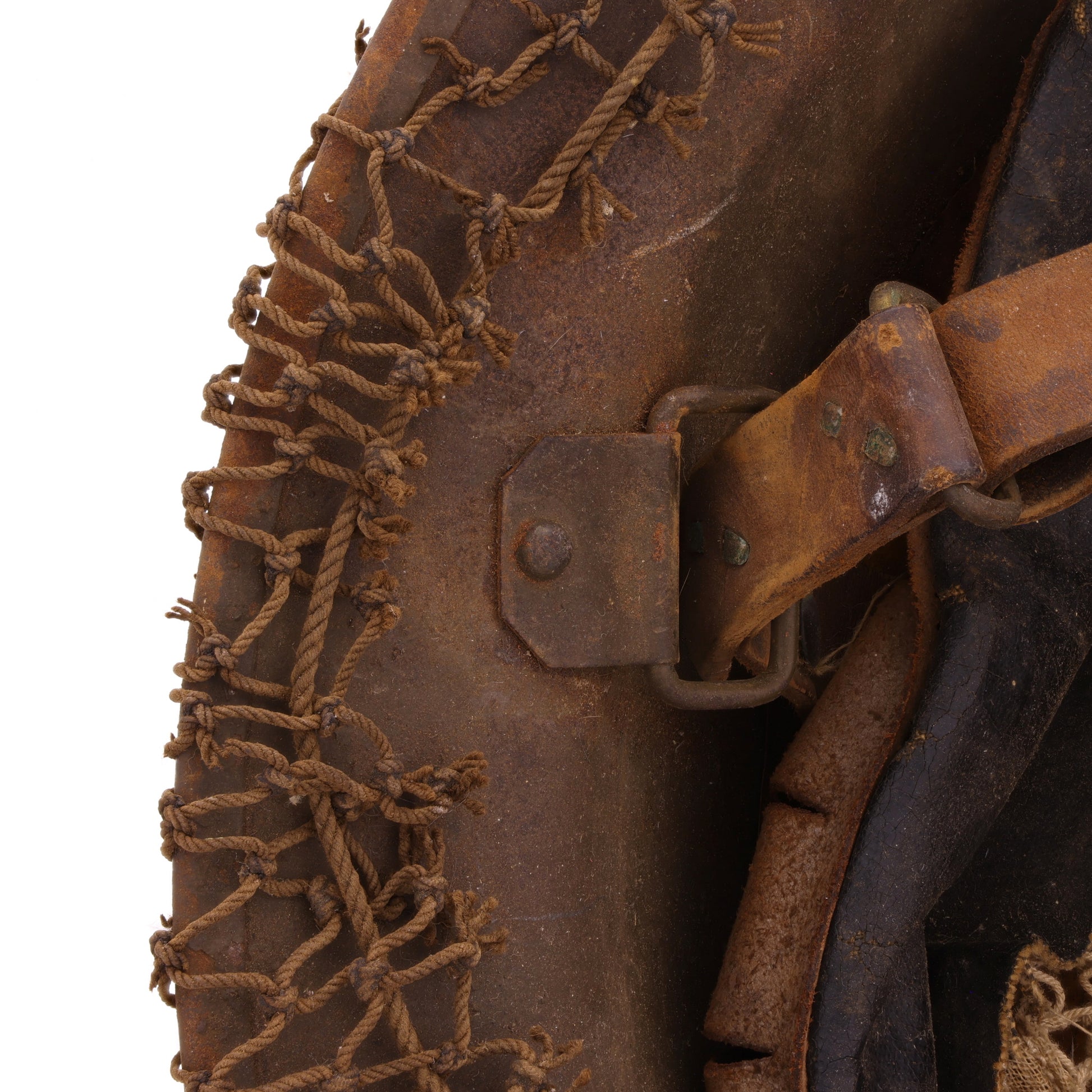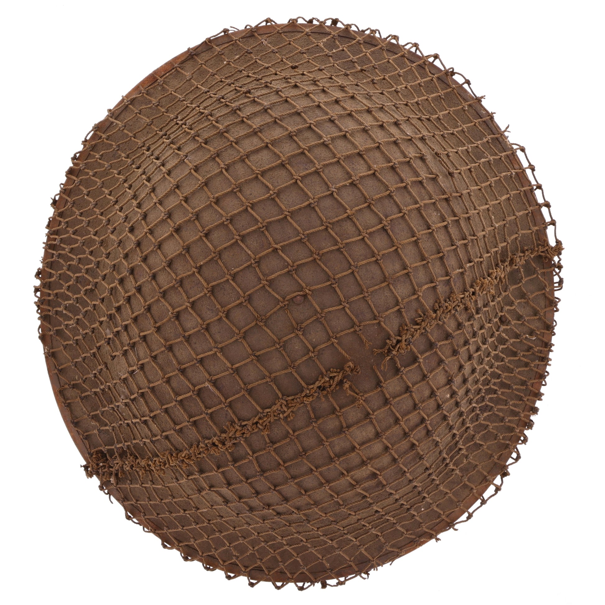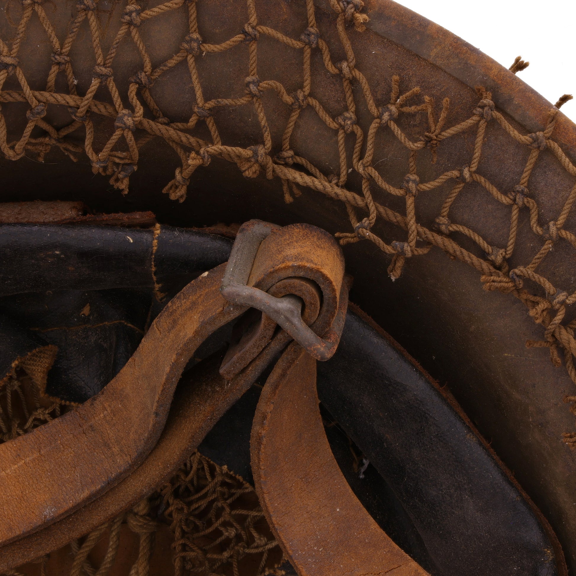 This is an original WWI U.S. M1917 "Brodie" helmet. Its interior brim is marked with the lot number "ZA255". Unfortunately, this particular manufacturer has yet to be positively identified; however, we can be certain it is of U.S. production due to the domed rivets securing the chinstrap loops (British-made helmets utilized split pins). The helmet retains its original textured olive drab factory finish. Its original oil cloth liner and leather chinstrap are still present. Interestingly, it appears as though masking tape was used on the felt crown pad, perhaps to further insulate the wearer's head. The helmet is decorated with a rather unique camouflage net, consisting of two apparent pieces of 1/2" knotted material spliced together. While some burlap helmet covers were used during WWI, nets have yet to be documented. As such, we cannot state definitively when it was applied, however it certainly appears to have been on the helmet for quite some time.