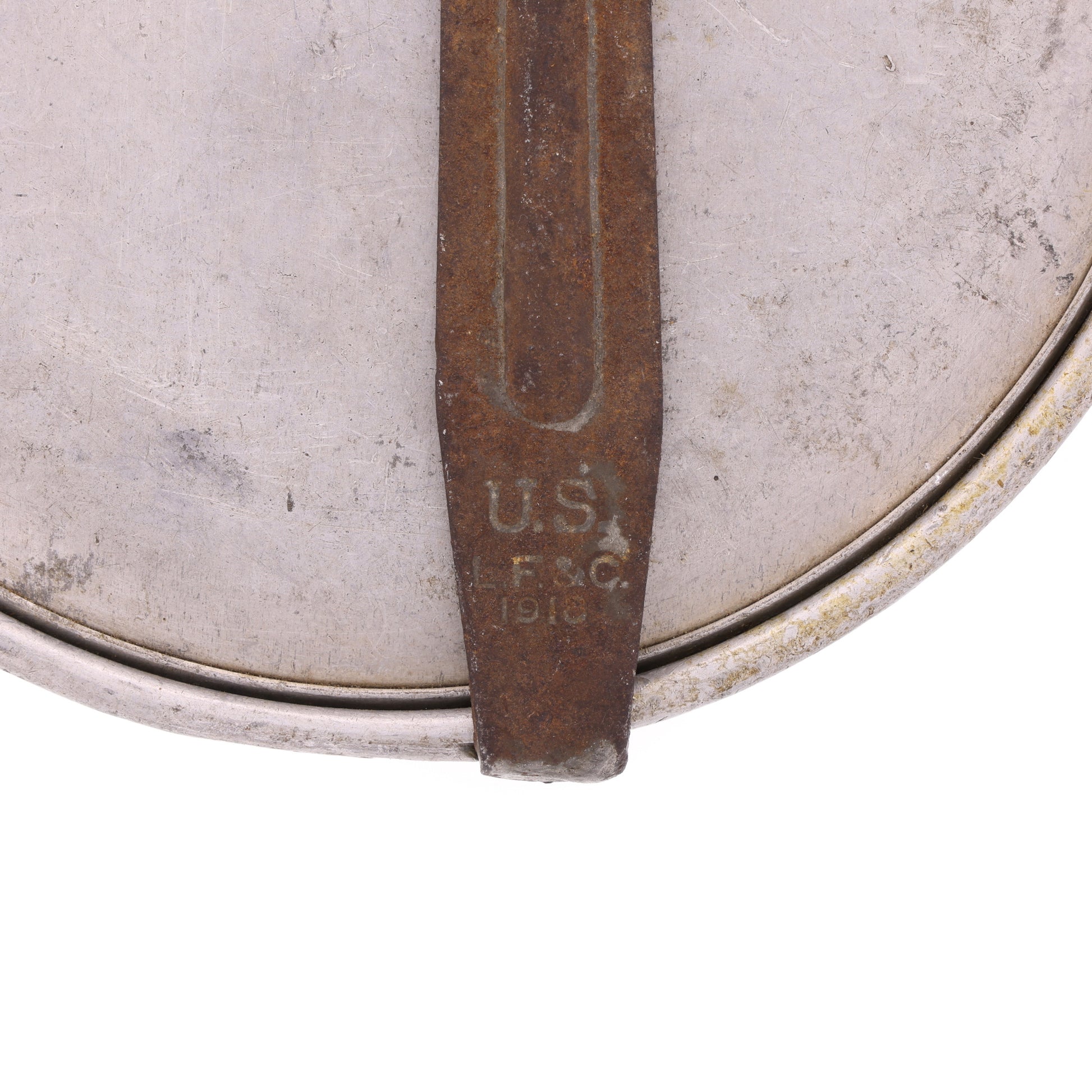 This original WWI U.S. M1918 aluminum mess kit was manufactured by Landers, Frary & Clark of New Britain, Connecticut in 1918. Interestingly, the bottom shows discoloration from when its original owner cooked with it over an open flame.