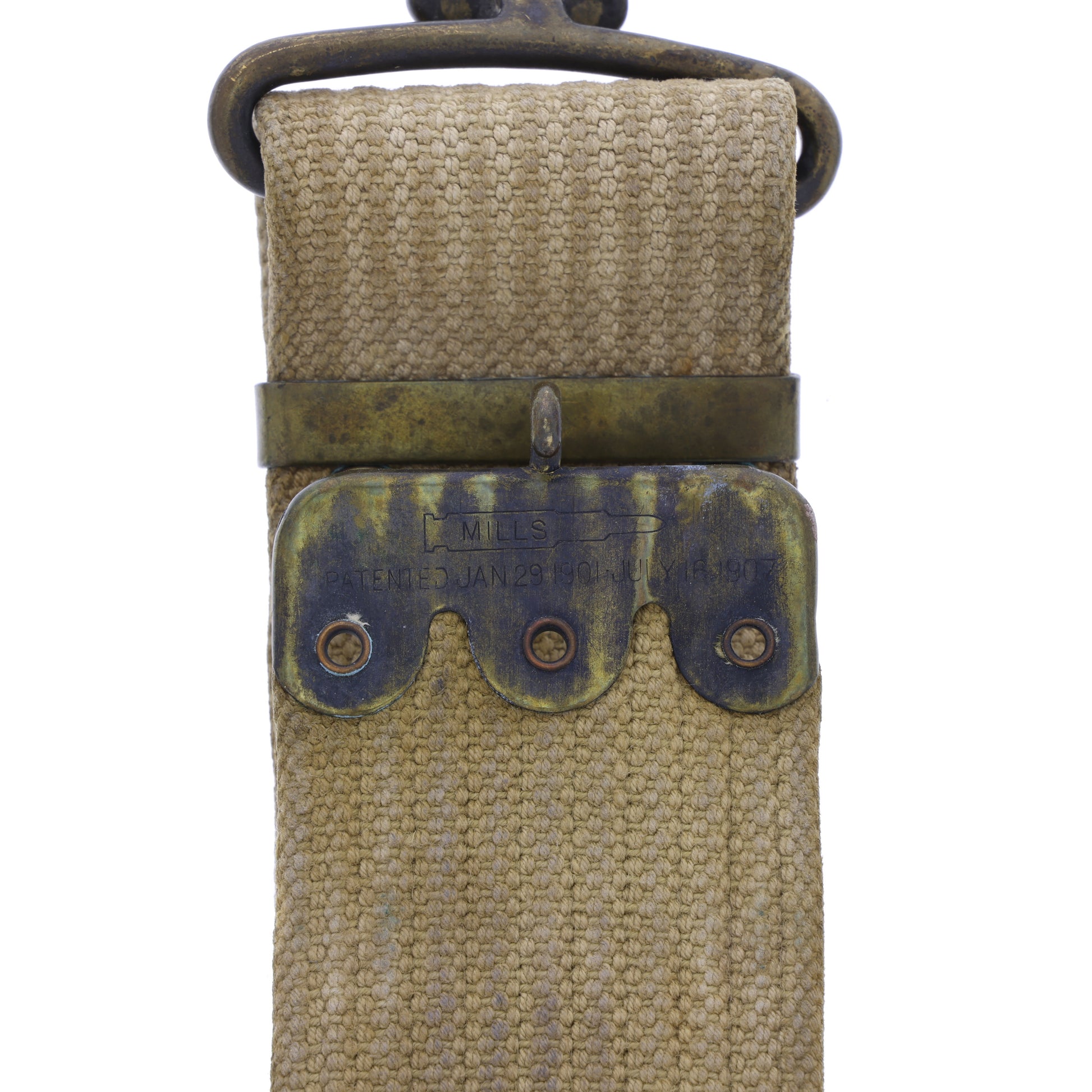 This is an original WWI U.S. pistol belt, manufactured by Mills Woven Cartridge Belt Co. Its innovative design provided durability and adjustability, making it an essential addition to any officer's kit. The brass hardware is patent dated both January 29, 1901, and July 16, 1907, while the only marking visible on the webbing is the since crossed out name of its prior owner, "Brown".