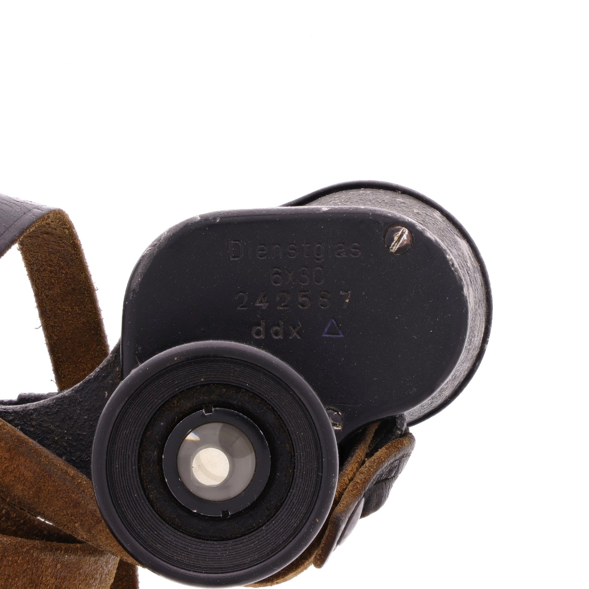 This is an original pair of WWII German dienstglas 6x30 binoculars. These were produced by Voigtländer & Sohn of Braunschweig, Germany, and bear the factory code marking of "ddx", along with the serial number of "242587". The small blue "△" located to the right of the factory code signified that these binoculars were treated with a special lubricant allowing them to withstand temperatures down to -40°Cs and as high as 50°Cs. This marking was introduced in 1943 but was most commonly seen on binoculars produced during 1944. They come with their original leather carrying strap intact, however one retaining stud does not appear to have been properly fastened.