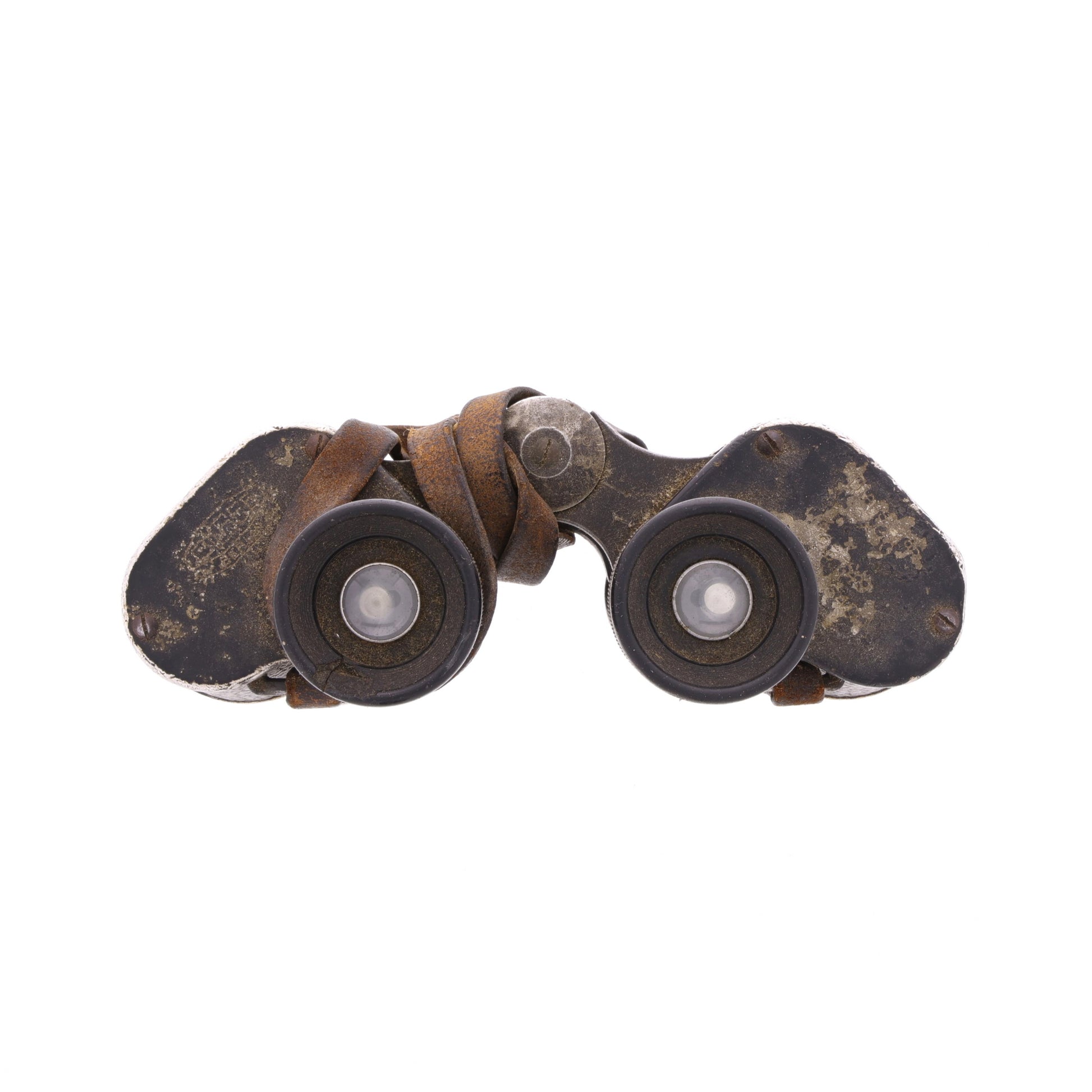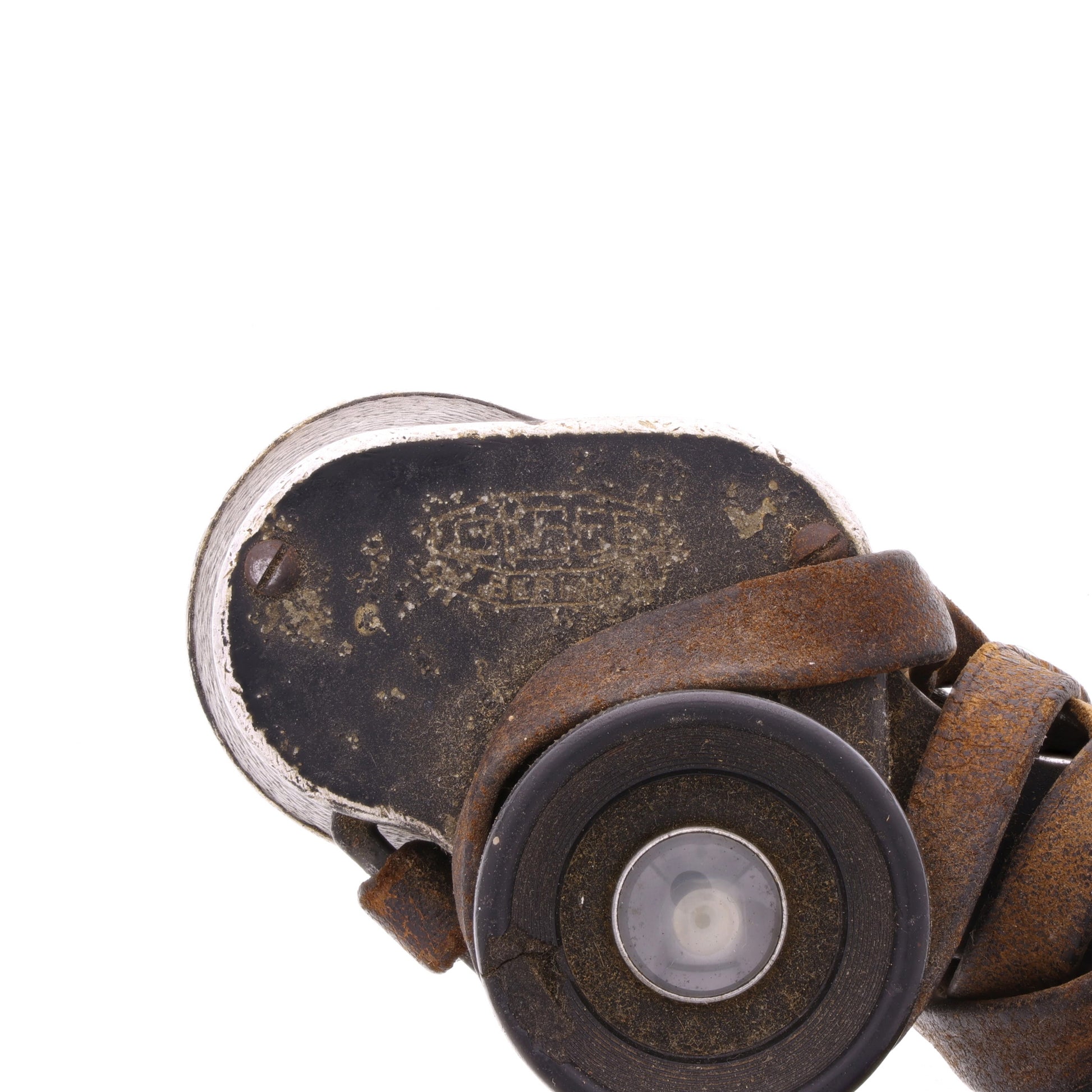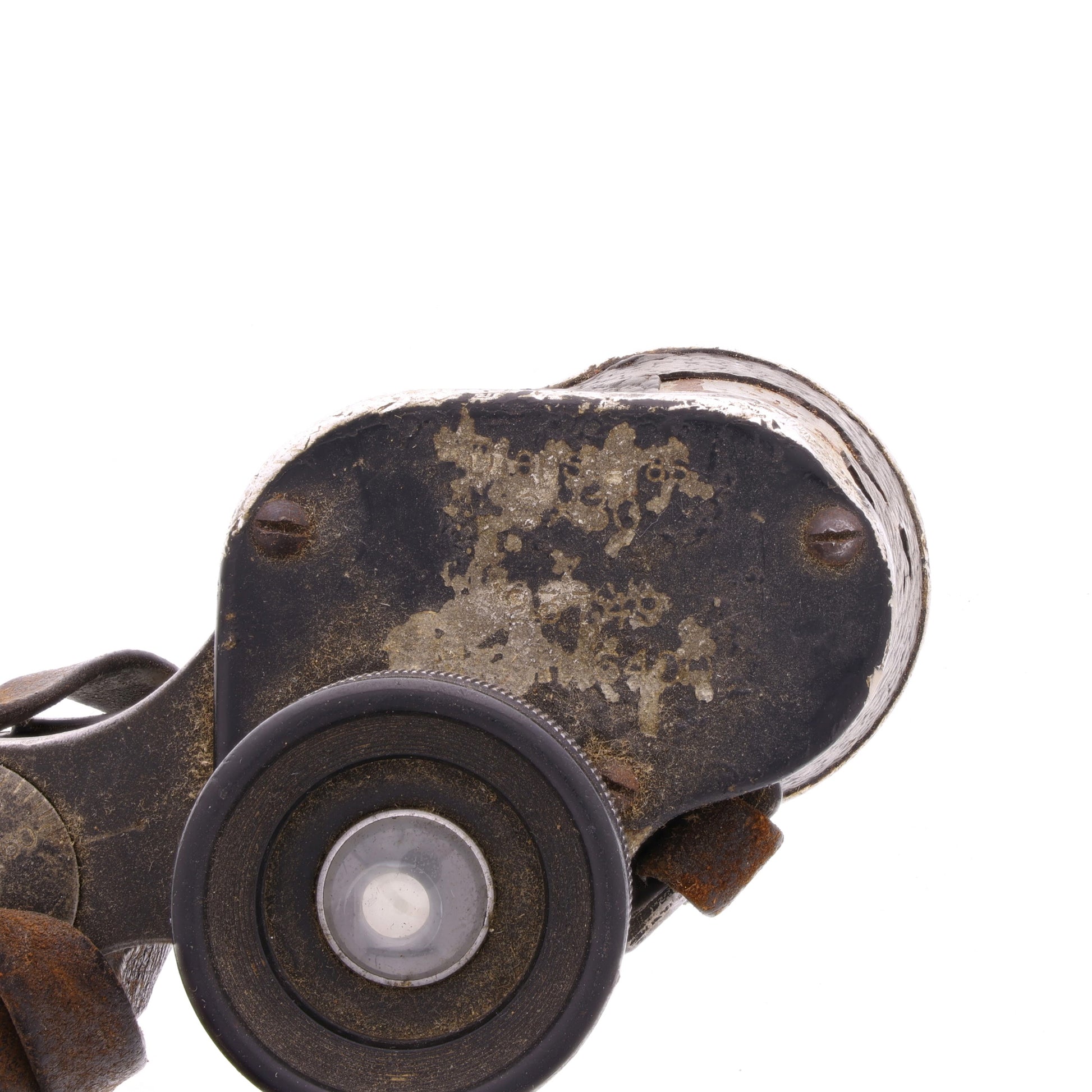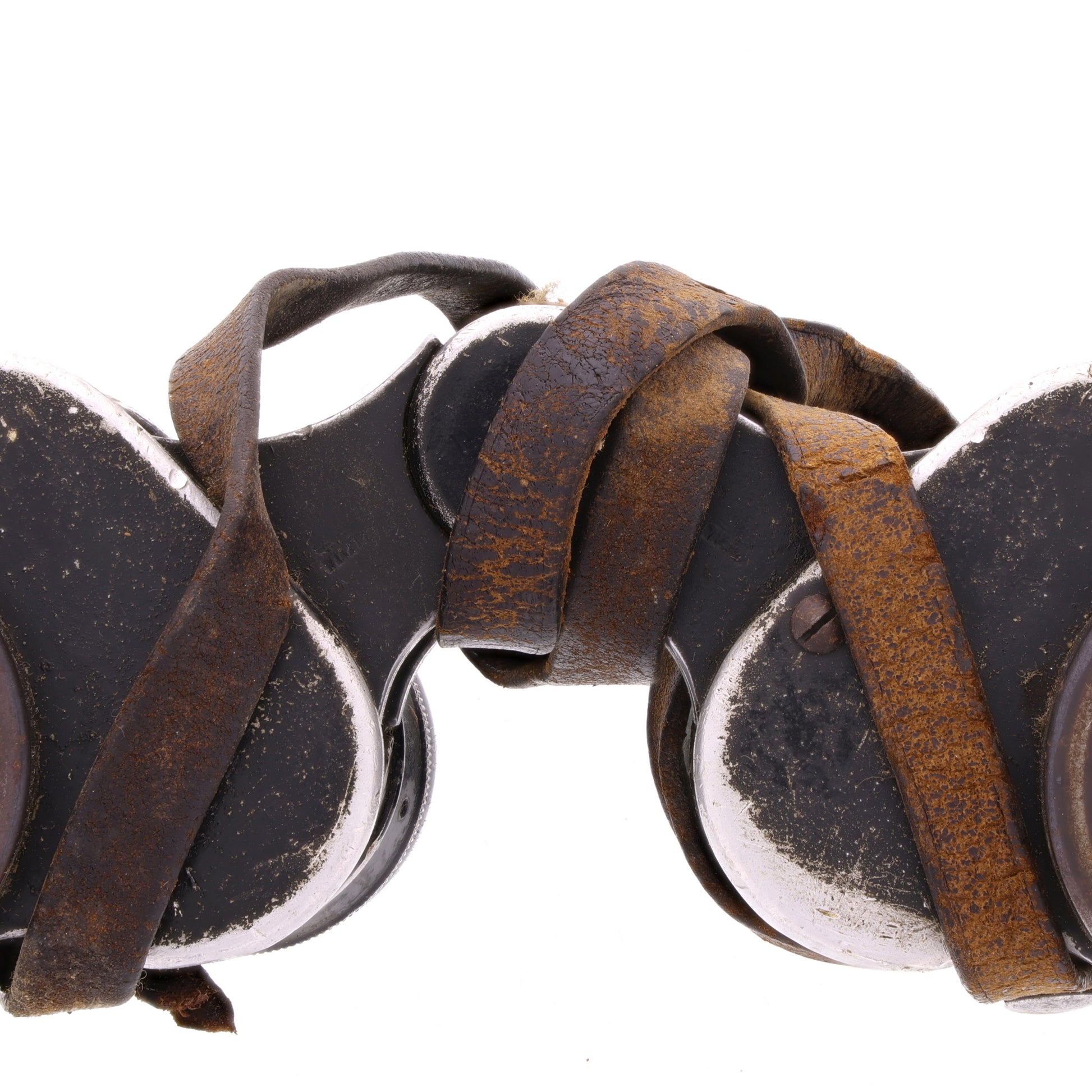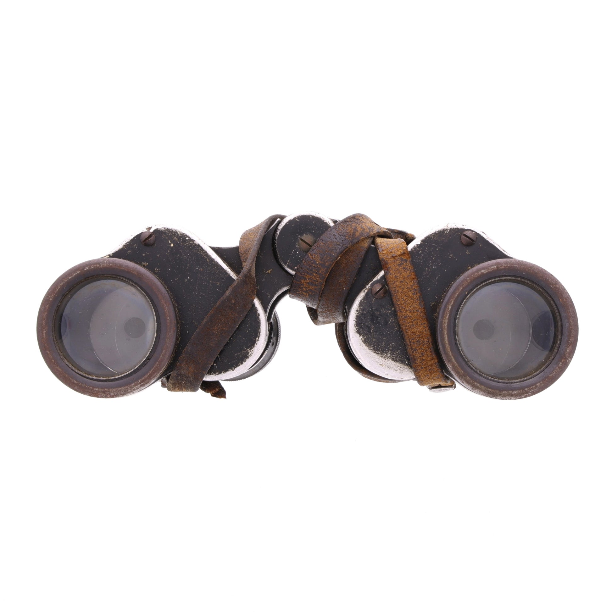 These binoculars are in well used condition, with quite clear optics given their age, however, the factory markings are heavily worn, the vulcanite (imitation leather) covering has deteriorated with use, the leather carrying strap is unfortunately damaged, and the user's left bakelite eyecup is chipped.