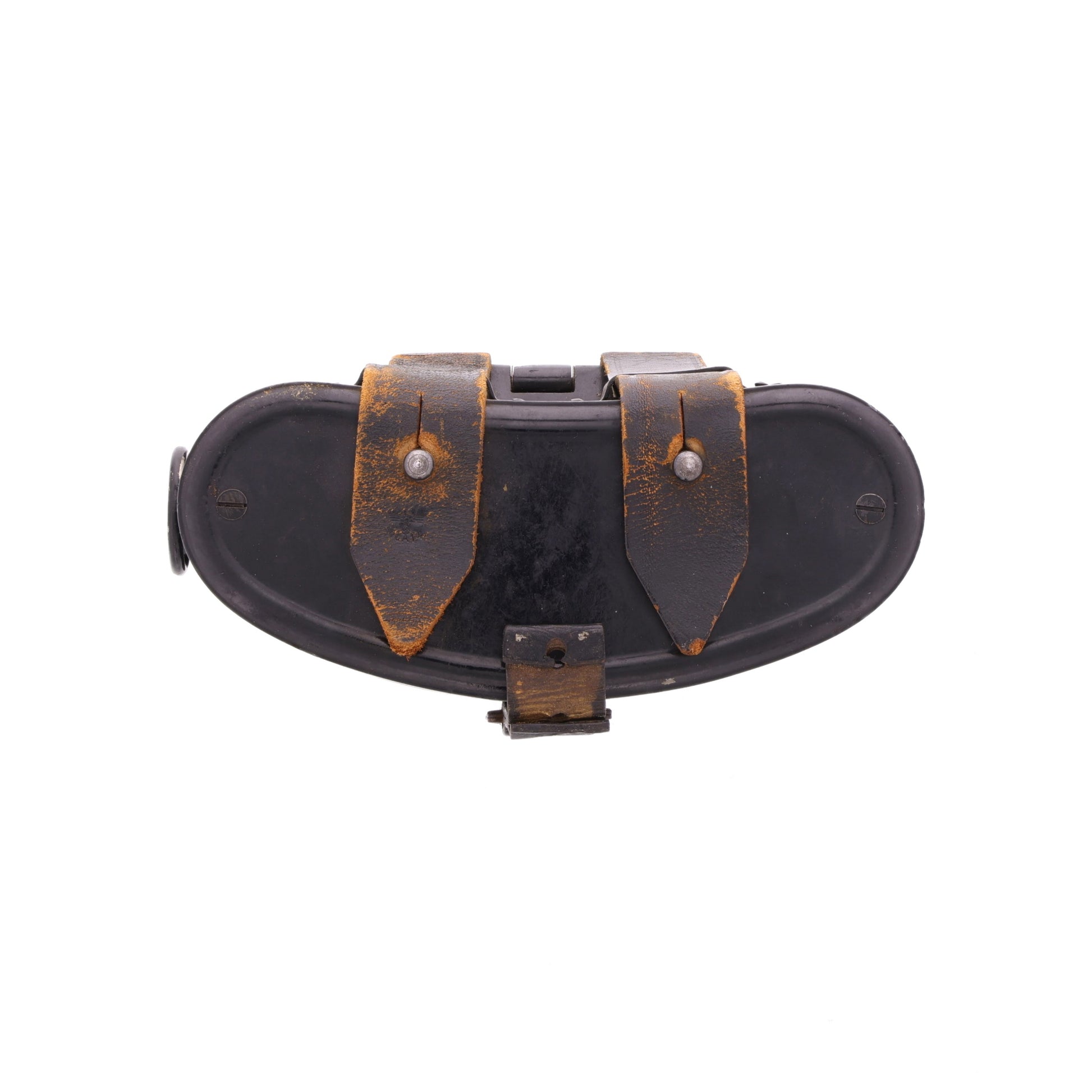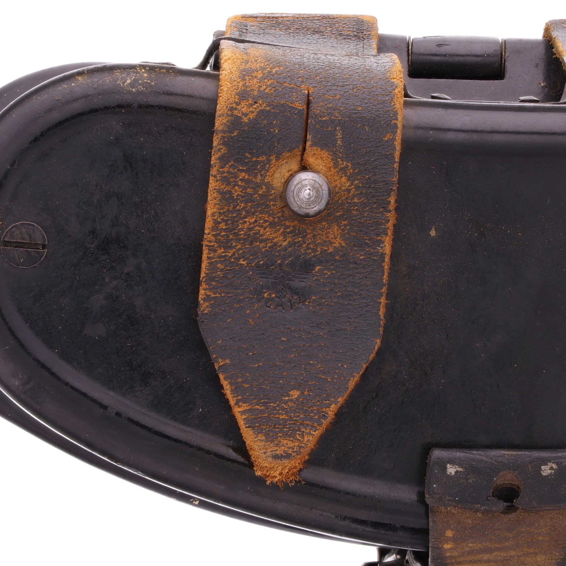 Bakelite dienstglas cases often have torn leather straps; however, this example's straps are still intact and pliable. There is a series of small cracks near one of the carrying strap's hangers.