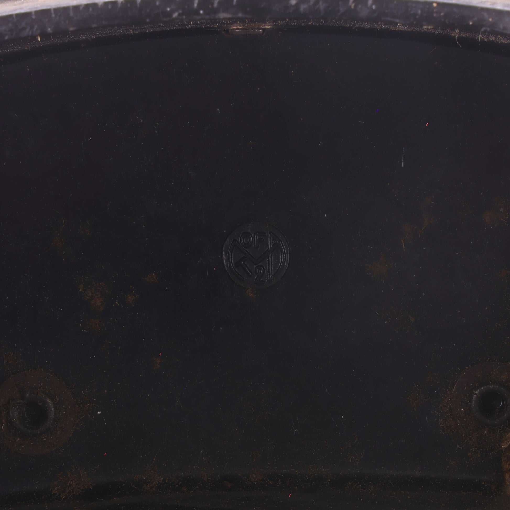 This is an original WWII German dienstglas bakelite case for the 6x30 binoculars. Its interior is marked "T2", which denotes Type 2 materials (synthetic resin with asbestos and other organic fillers). The stylized "MD" was the official proof marking of the Materialpruefungsamt, a phenolic resin manufacturers' guild. The "OF" marking is that of its manufacturer, which unfortunately has yet to be positively identified. One of its leather straps is embossed with the Waffenamt "WaA14".