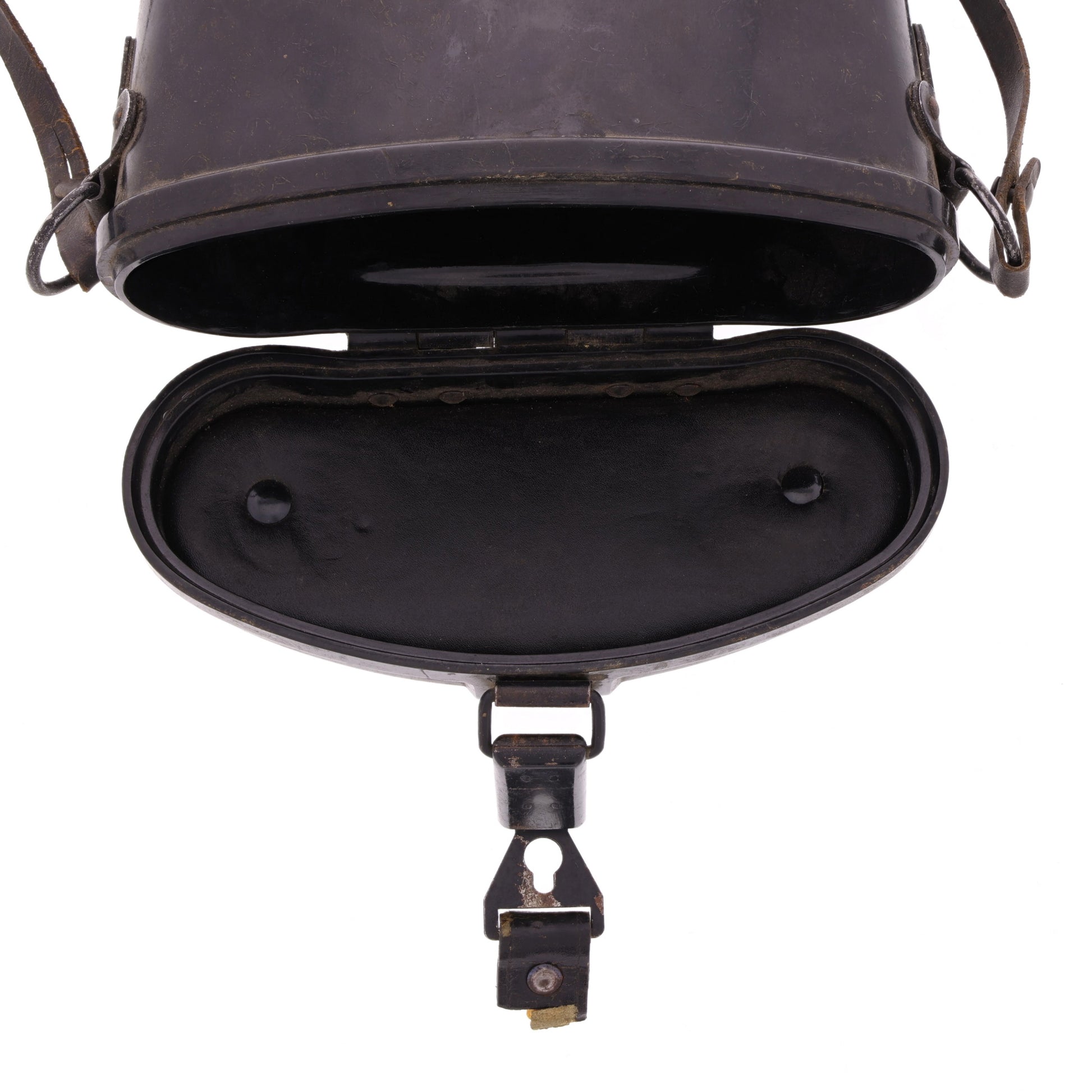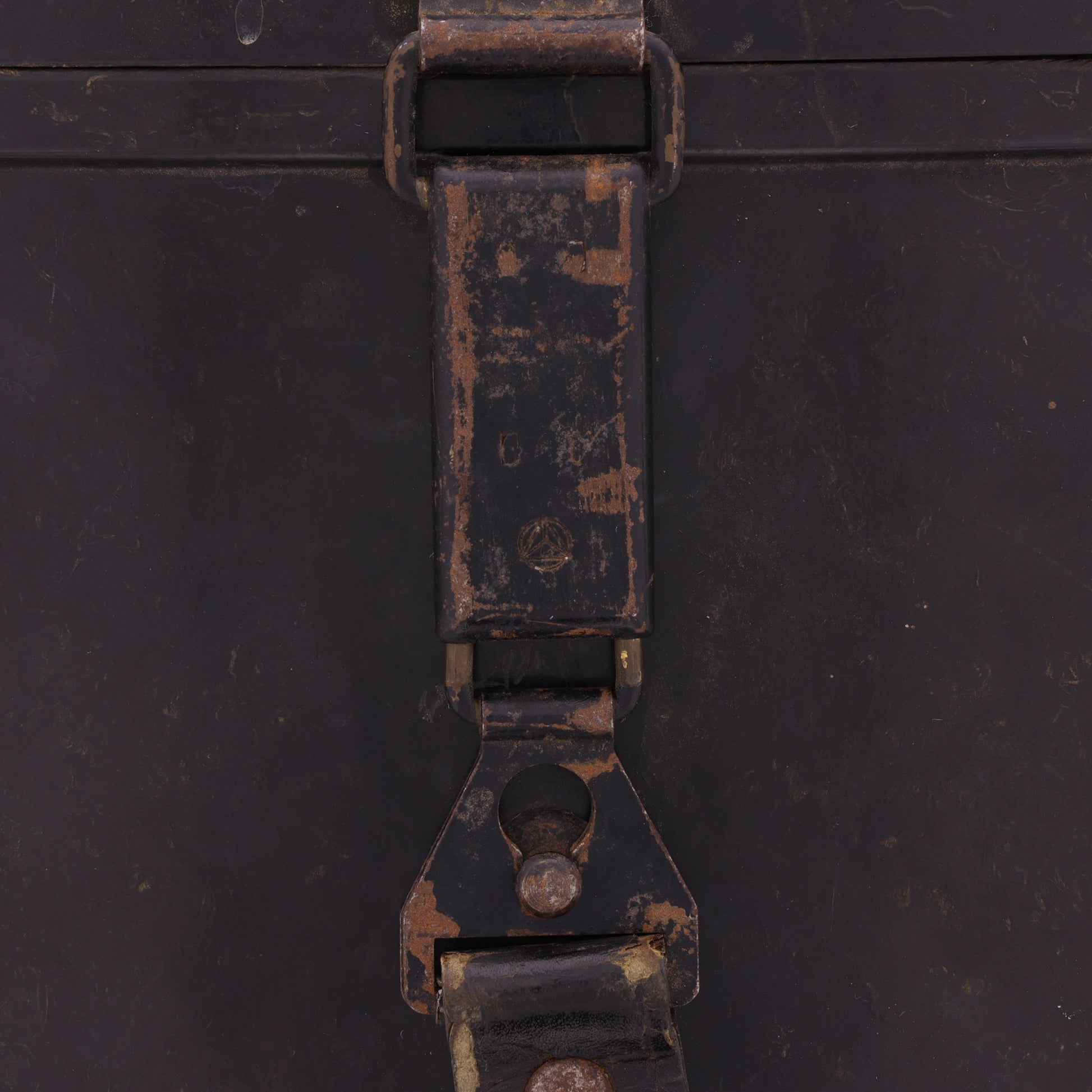 Bakelite dienstglas cases are often heavily cracked; however, this example's only damage appears to be its torn preßstoff pull tab and leather straps over the back hinge.