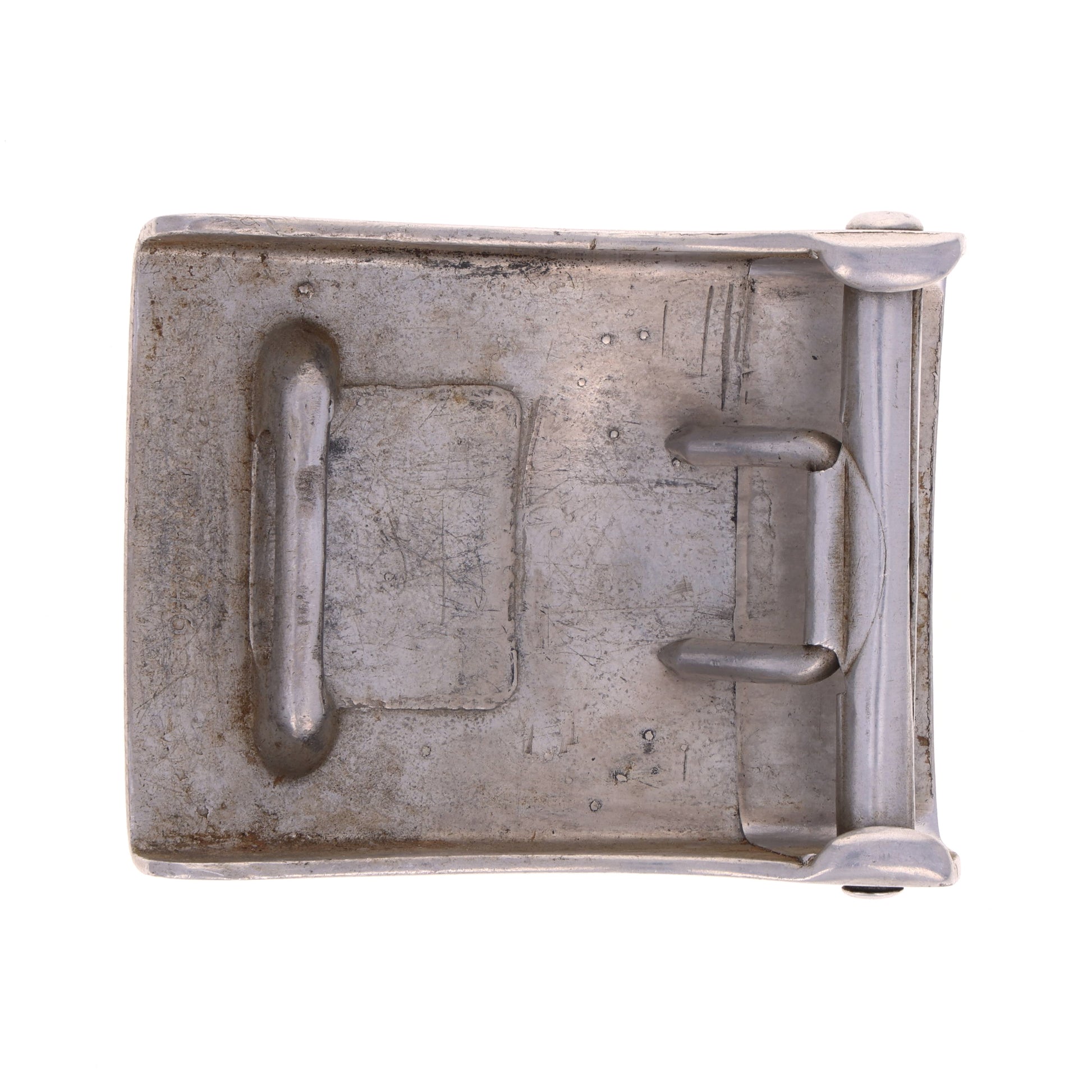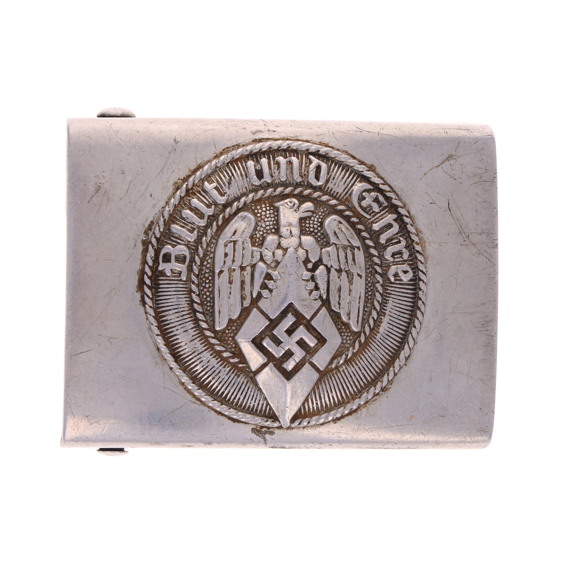 This is an original WWII German Hitler Jugend, or Hitler Youth belt buckle in aluminum. The front bears the motto "Blut und Ehre", or "Blood and Honor", while the reverse is faintly marked "RZM M4/46", denoting production by Wilhelm Schröder & Co. of Lüdenscheid, Germany. These were produced by injecting molten aluminum into a mold, which resulted in a cast buckle with a flat back and a fully integrated catch, unlike the stamped steel examples which often broke.