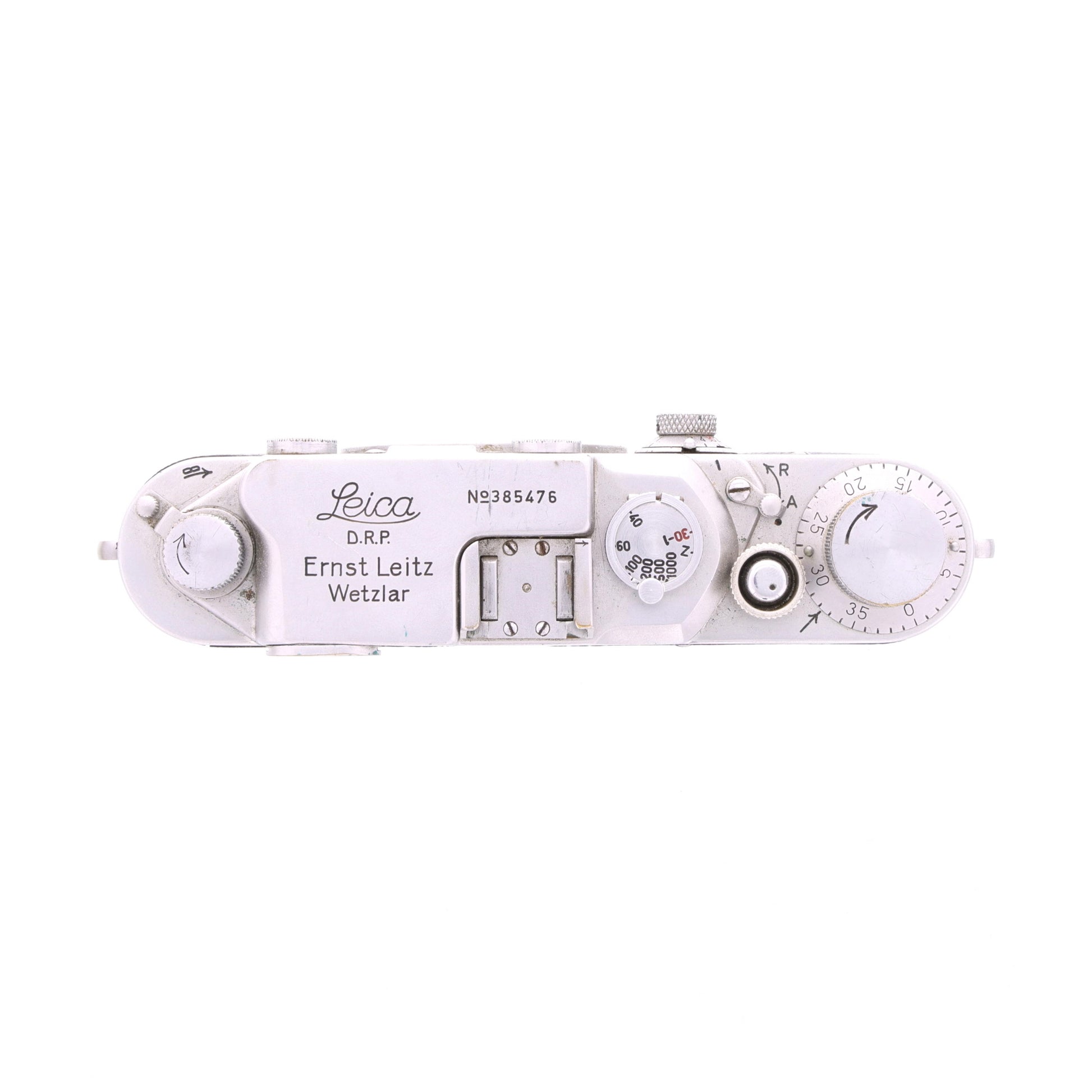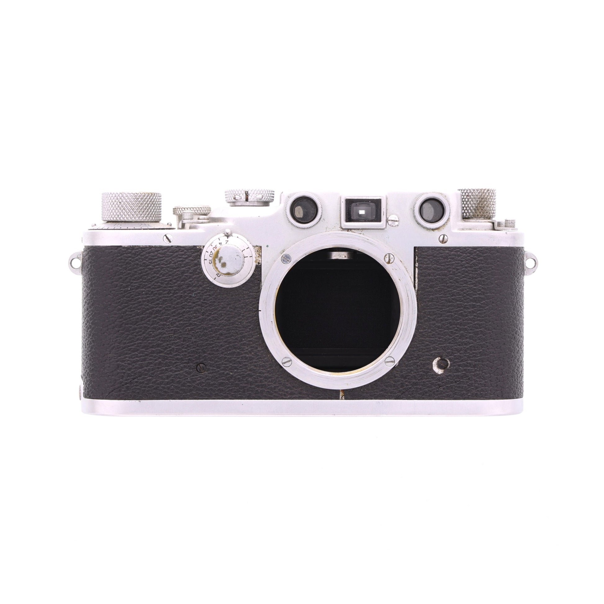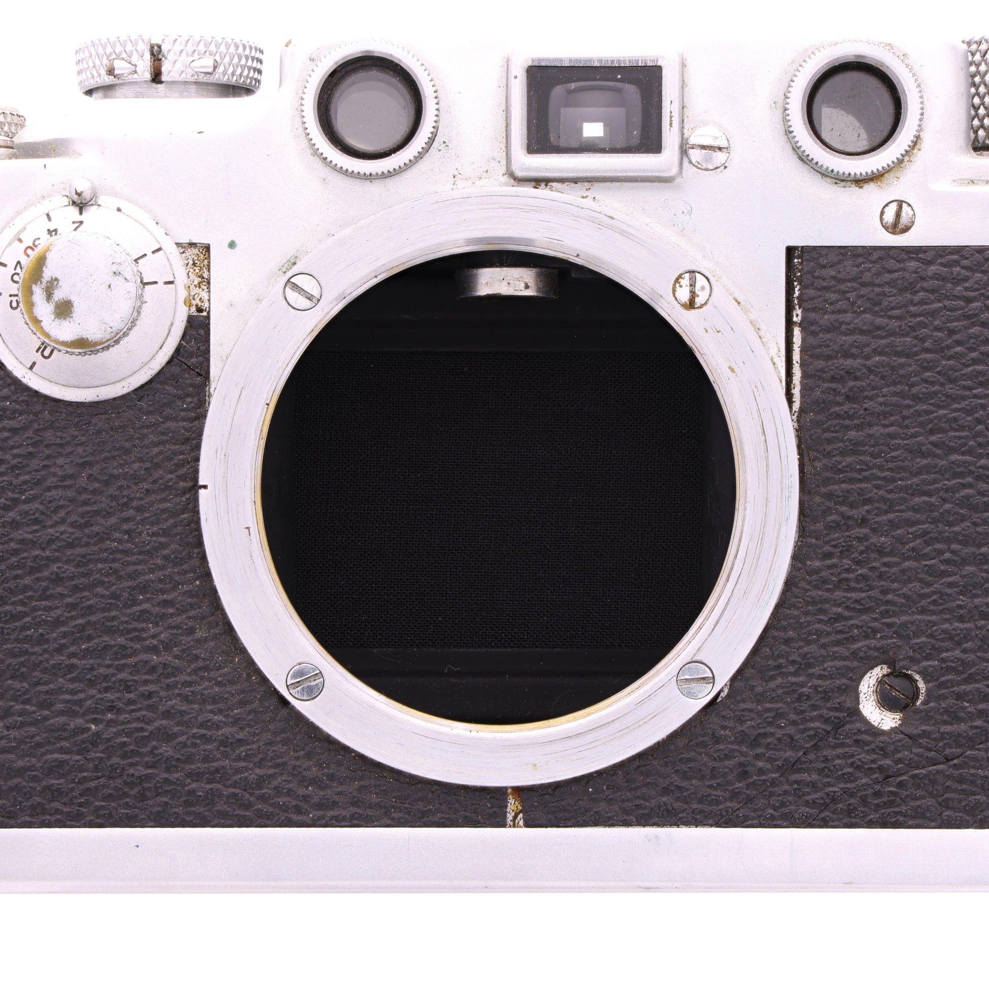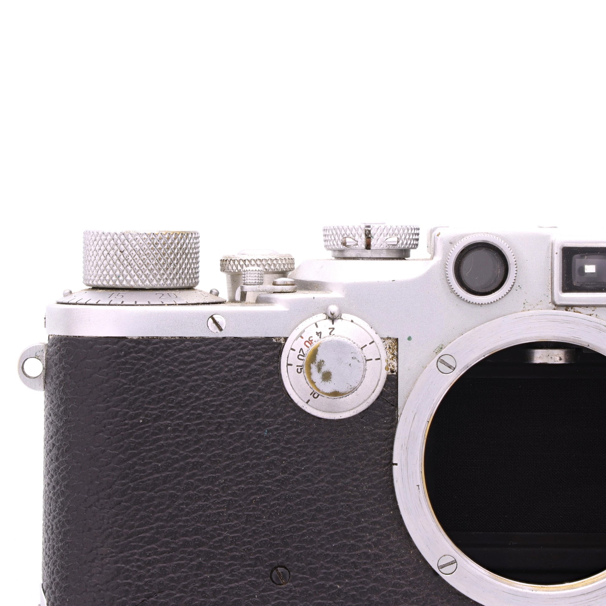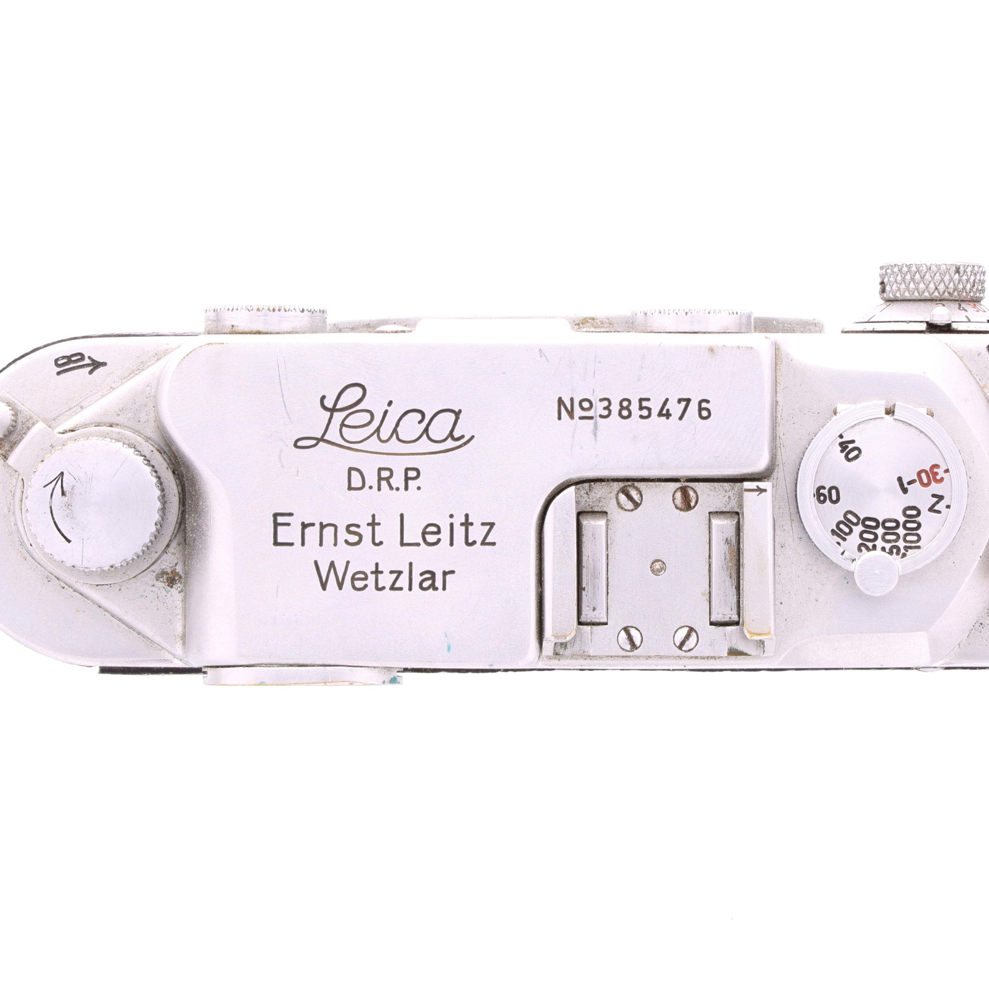 This is an original WWII German Leica IIIc 35 mm film camera body, produced by Ernst Leitz GmbH of Wetzlar, Germany. Collectors have dubbed these wartime Leicas as "steppers" due to the raised area beneath the rewind lever - a feature only seen on these cameras produced from March 1940 to June 1946. This particular example bears the serial number of "385476", dating its production from 1941 to 1942. It is one of just 20,550 Leica IIIcs produced by Leitz during this timeframe.