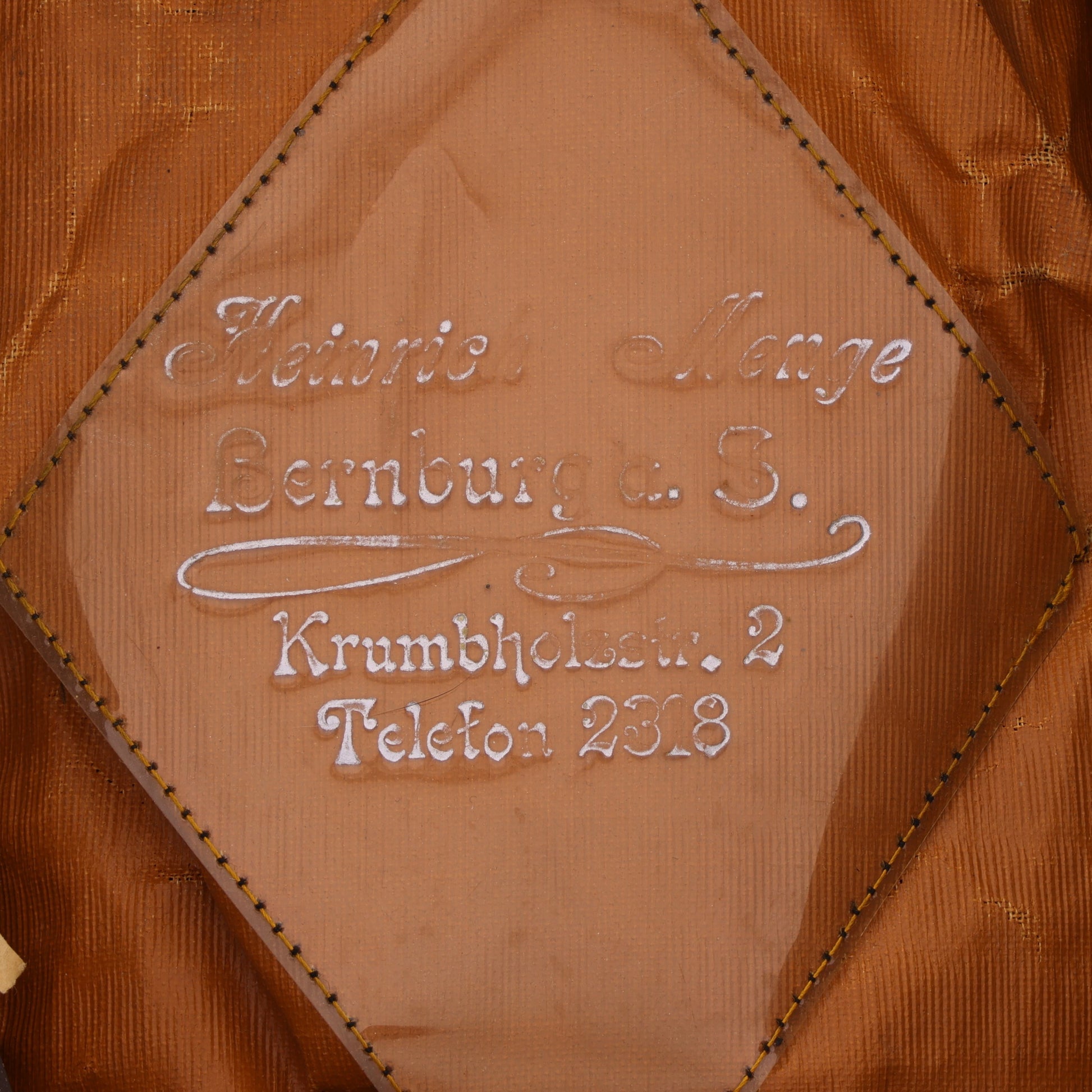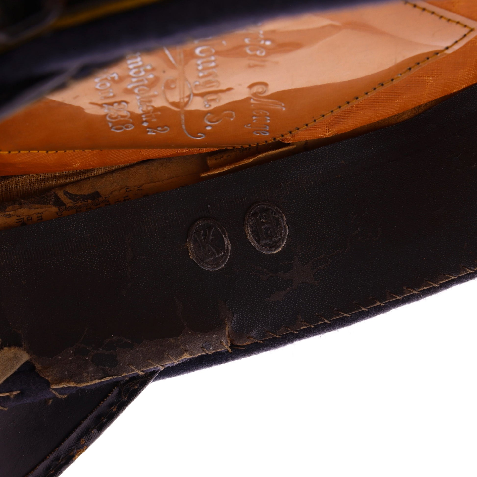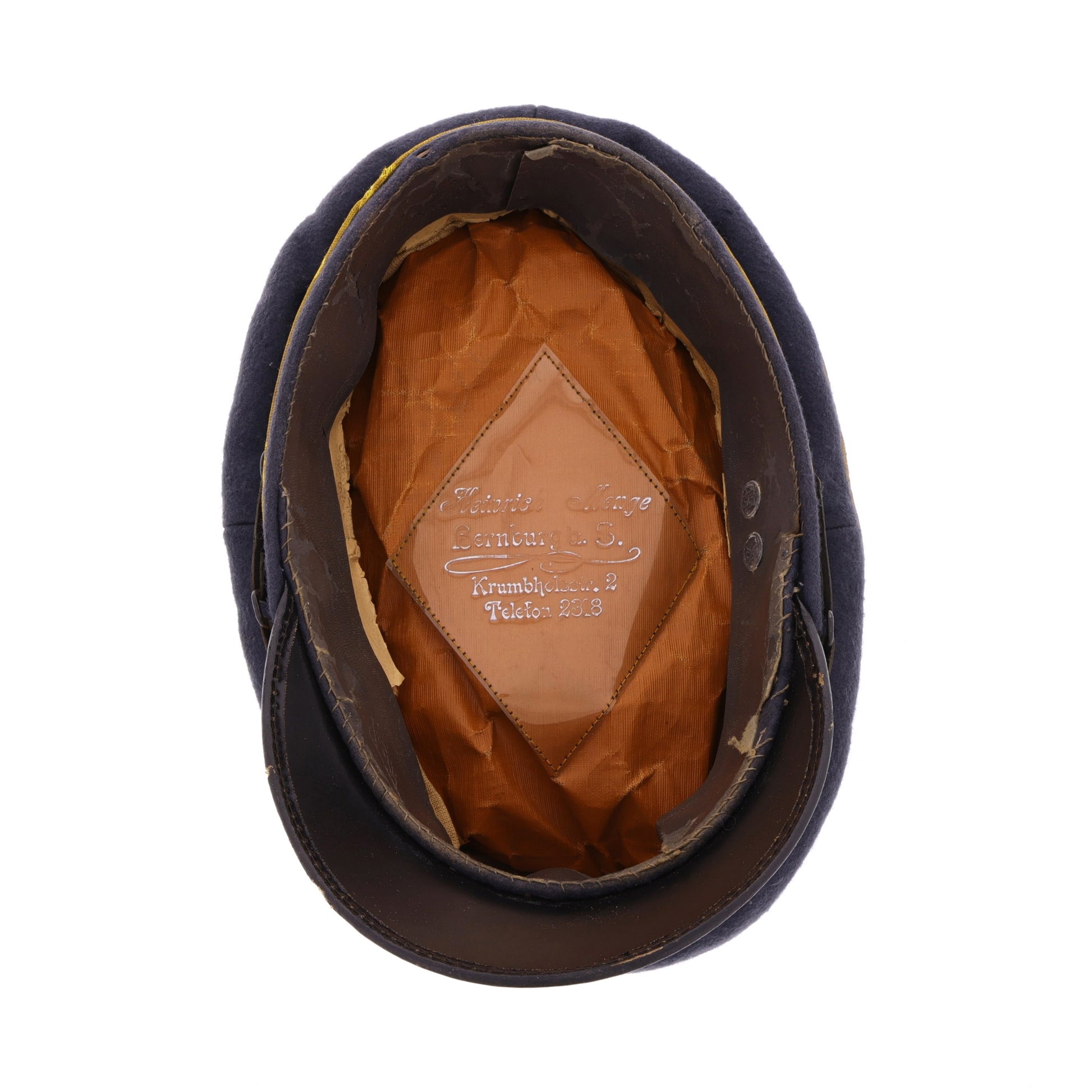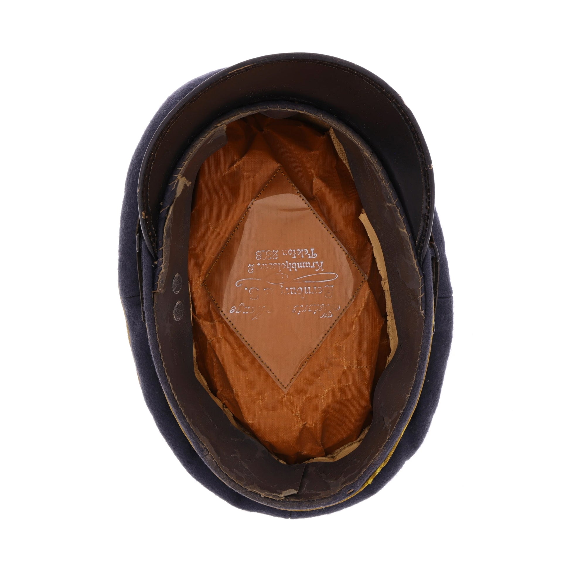 This is an original WWII German Luftwaffe enlisted man's crusher cap manufactured by Heinrich Menge of Bernburg, Germany. This cap is constructed of feldblau wool with golden yellow waffenfarbe, denoting use by flyers and fallschirmjägers alike. It features a glossy black chinstrap and visor. The front is decorated with a metal winged wreath, cockade, and Luftwaffe eagle insignia. Unfortunately, no size tag could be located; however, it has been measured and is a confirmed size 6 5/8. Interestingly, original newspaper is visible beneath the "K. H." decorated headband - likely placed there by the hat's original owner in order to provide a tighter fit. It still retains its original plastic headliner, which is inscribed "Heinrich Menge, Bernburg a. S., Krumbholzstr. 2, Telefon 2318".