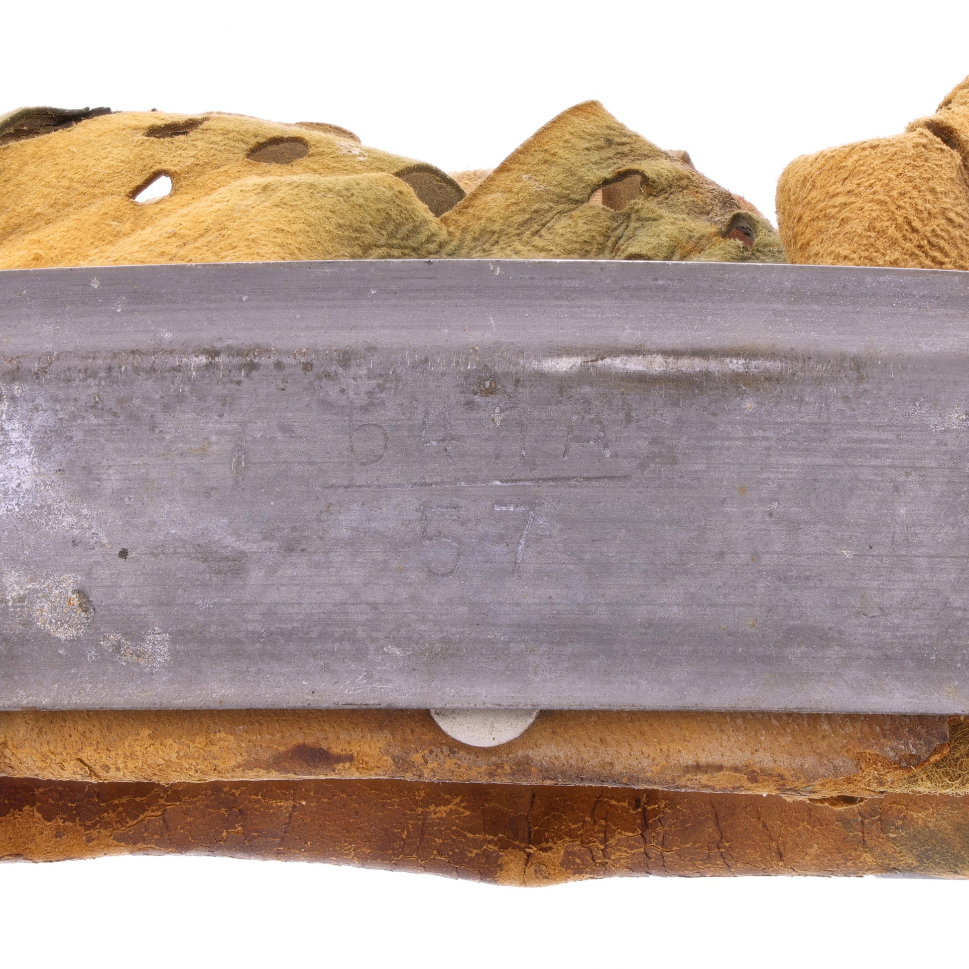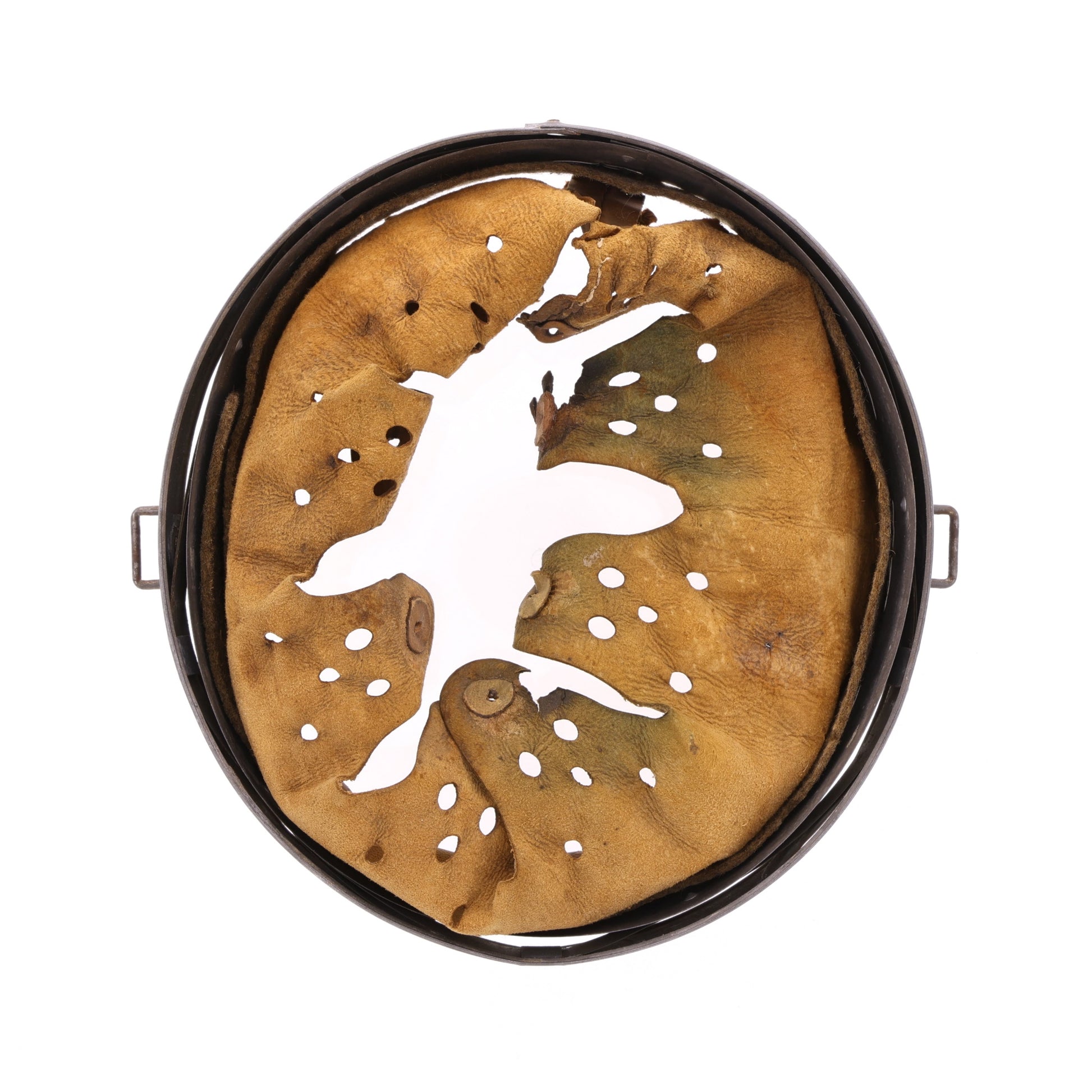 This is an original WWII German M1931 helmet liner. The leather liner is a size 57 and is to be paired with a size 64 helmet shell. Its zinc band showcases a "1941" production stamp by Metall-Lederverarbeitung Werner Zahn Berlin, Charlottenburg 5, making it an ideal candidate for an M40 helmet.