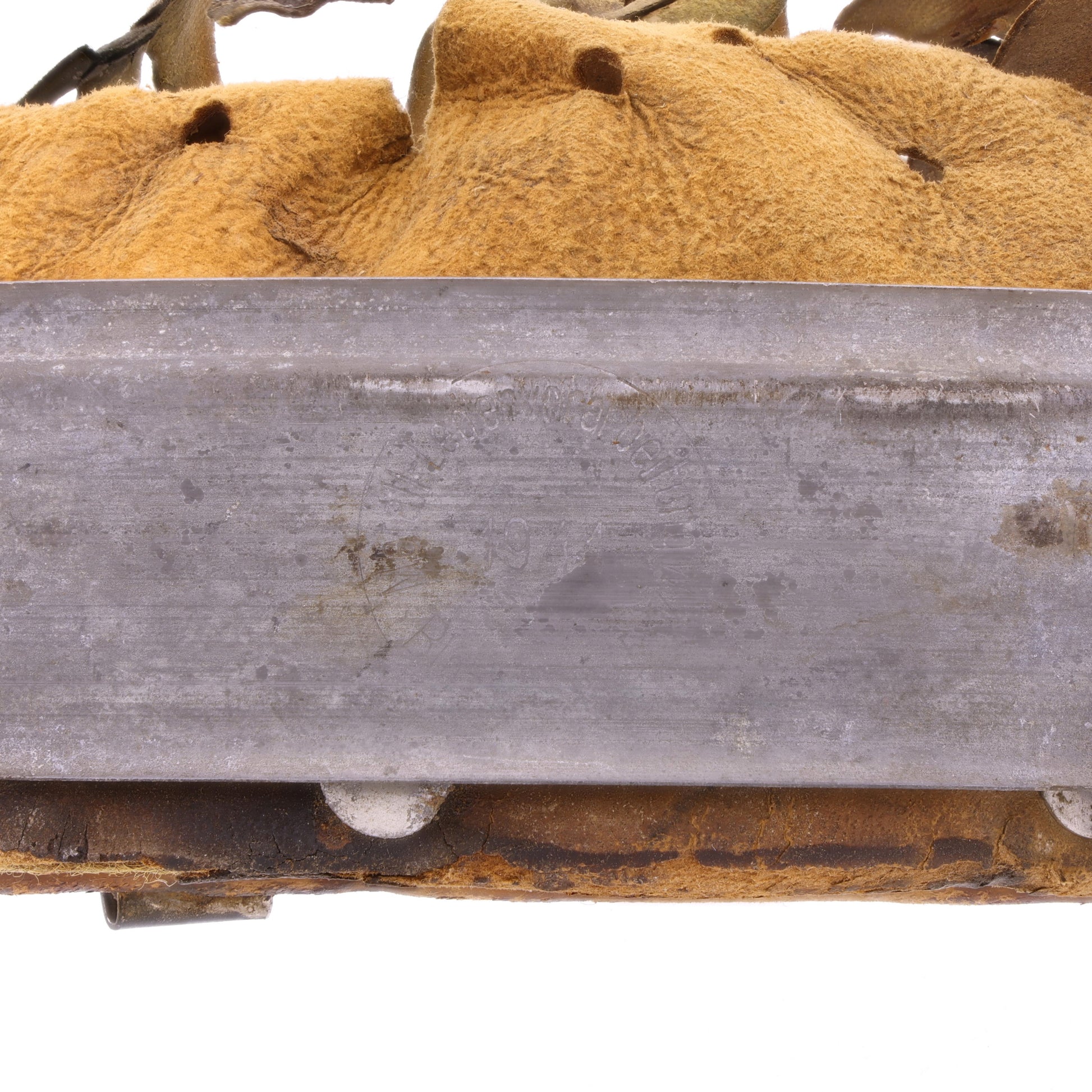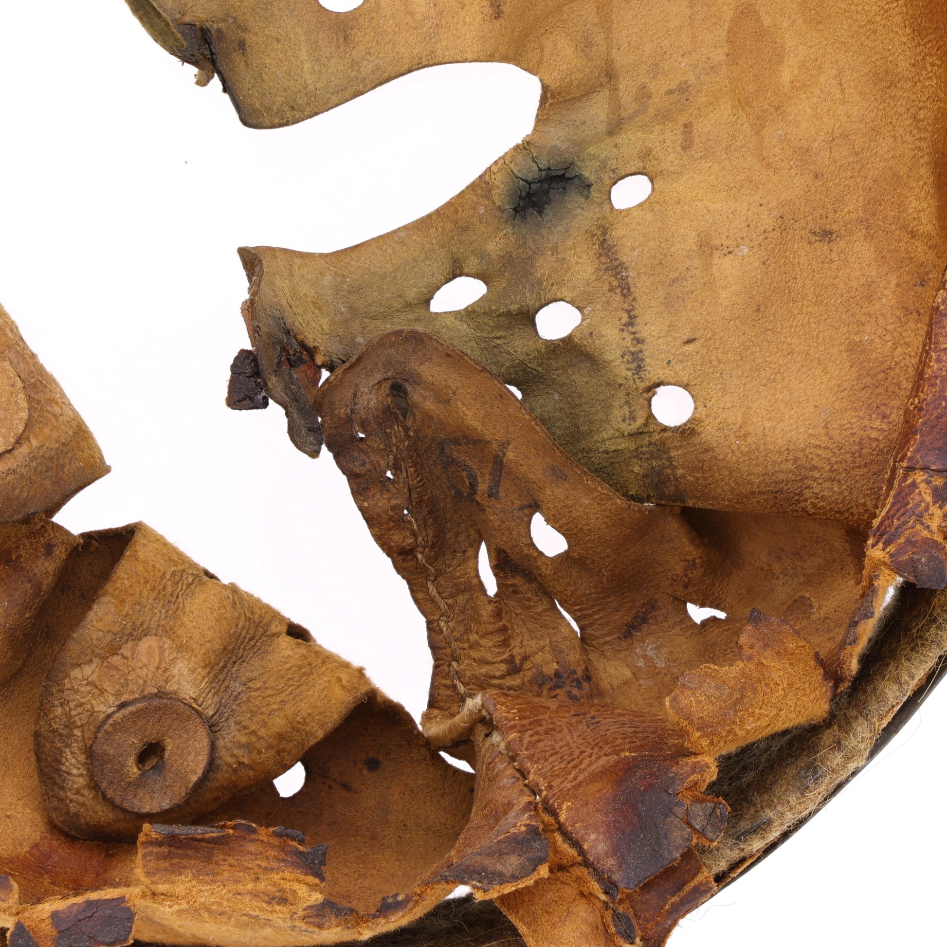 The zinc band is in good condition, with no signs of post-war paint applications, however the leather has cracked and dried over time, making it suitable for a helmet in equally used condition.