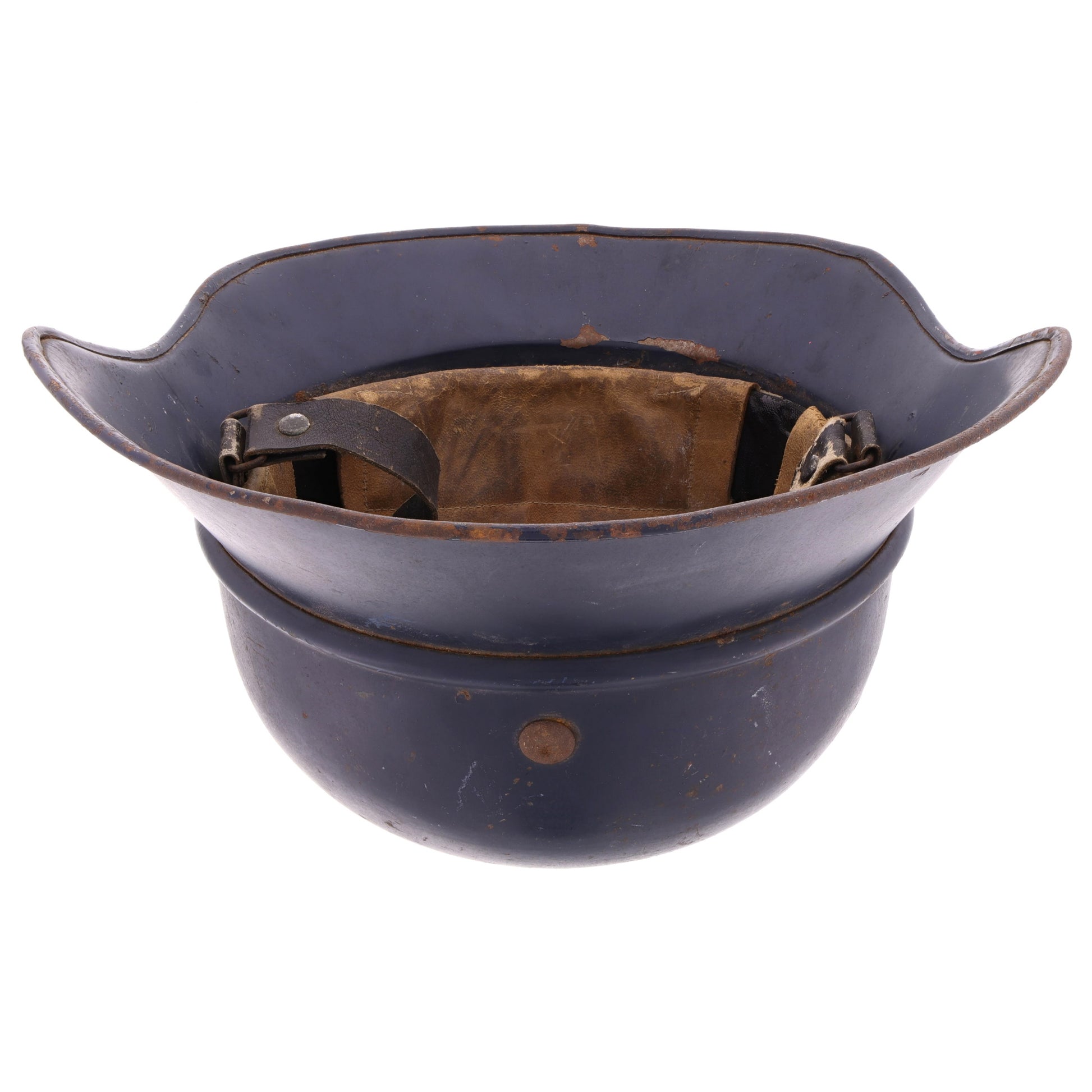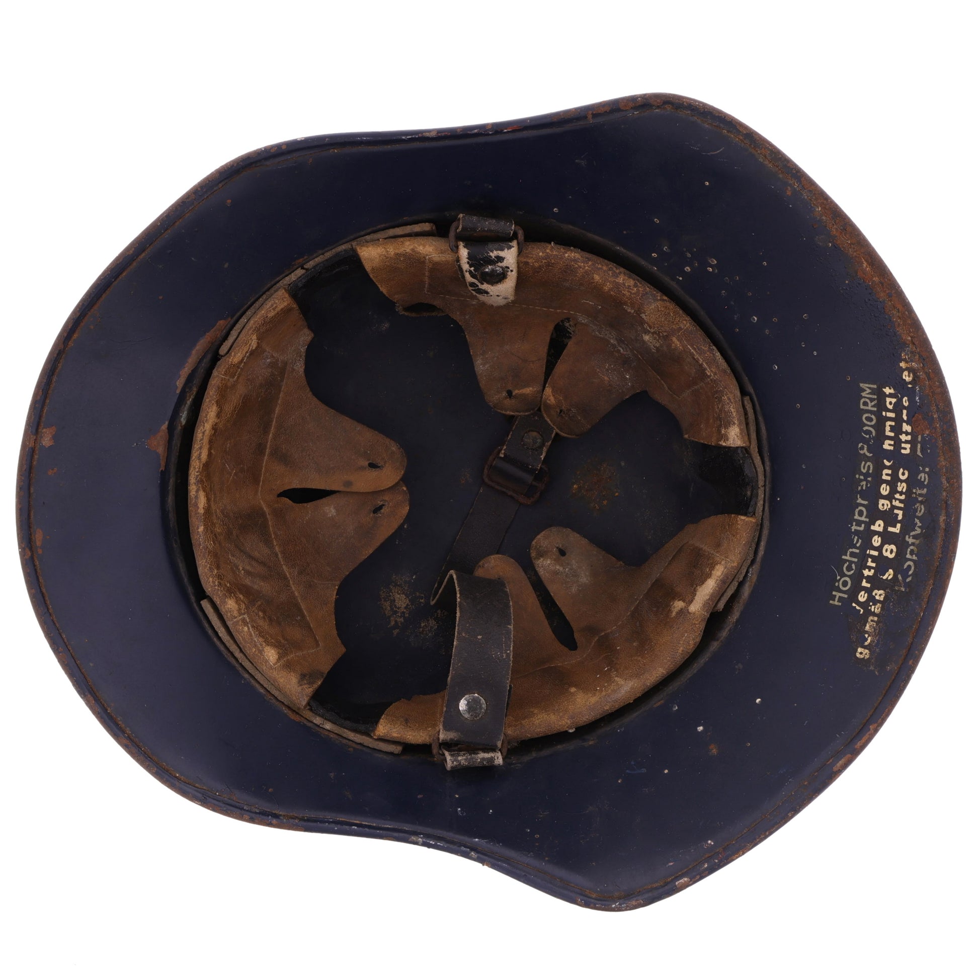 This is an original WWII German M38 Luftschutz gladiator helmet. The M38 differs from its successors in that it is constructed of three separate pieces of pressed aluminum. It retains its original feldblau factory finish and does not look to have ever had a Luftschutz decal applied to its front. The interior retains its original size 57 leather liner and Preßstoff chinstrap. One of the liner pads is faintly inscribed with what appears to be its original owner's name. The rear skirt is stamped "RL2-38/28", denoting production by Paul Diener, Metalldrückerei und Stanzerei of Dresden, Germany. Interestingly, members of the Luftschutz were required to purchase their own helmets upon joining the organization and its "Höchstpreis 8.00 RM" marking indicates members were not to be charged more than 8 Reichsmarks per helmet. The helmet's split pins and square cork spacers are all original and show no signs of tampering.