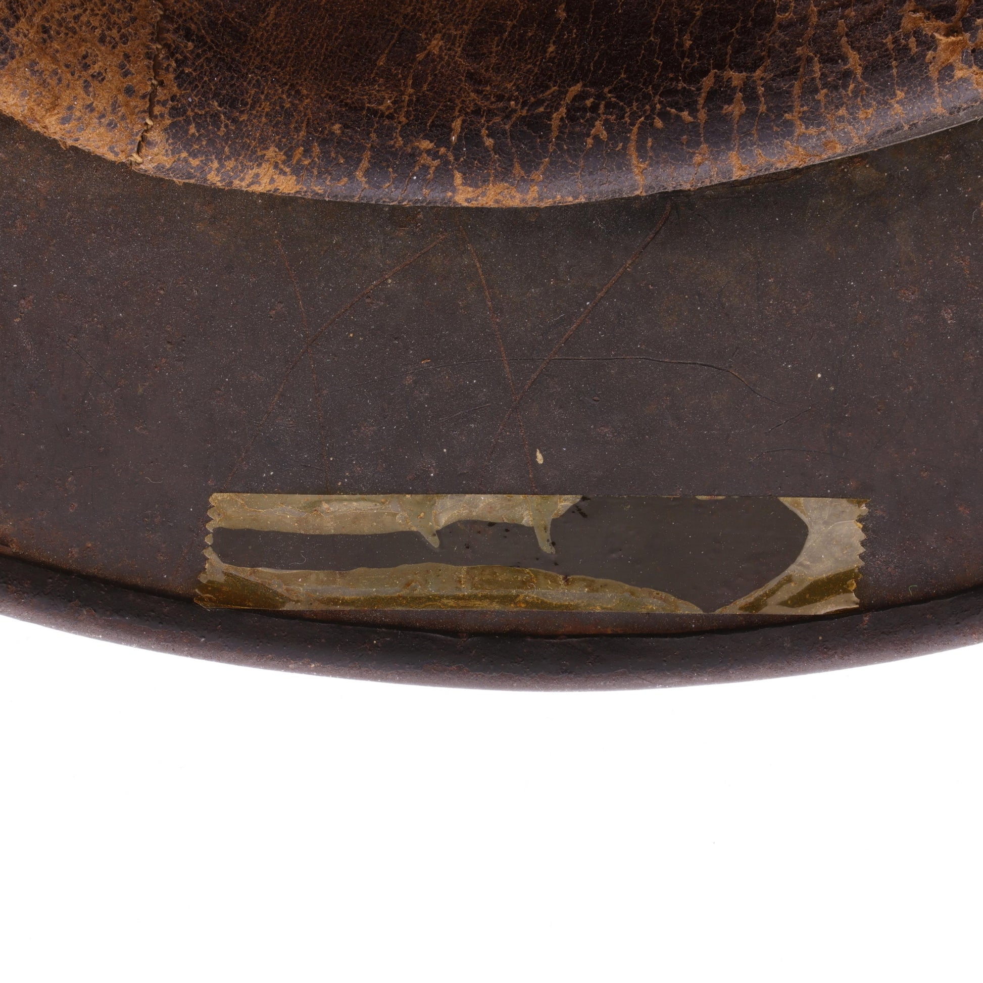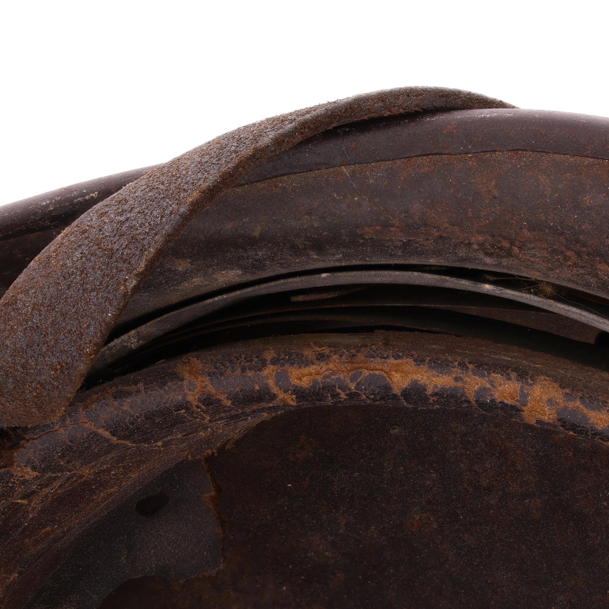 This helmet is in fair, well used condition. There is rust throughout, and the leather liner is heavily damaged. That said, it displays quite nicely with its original decal still relatively intact.