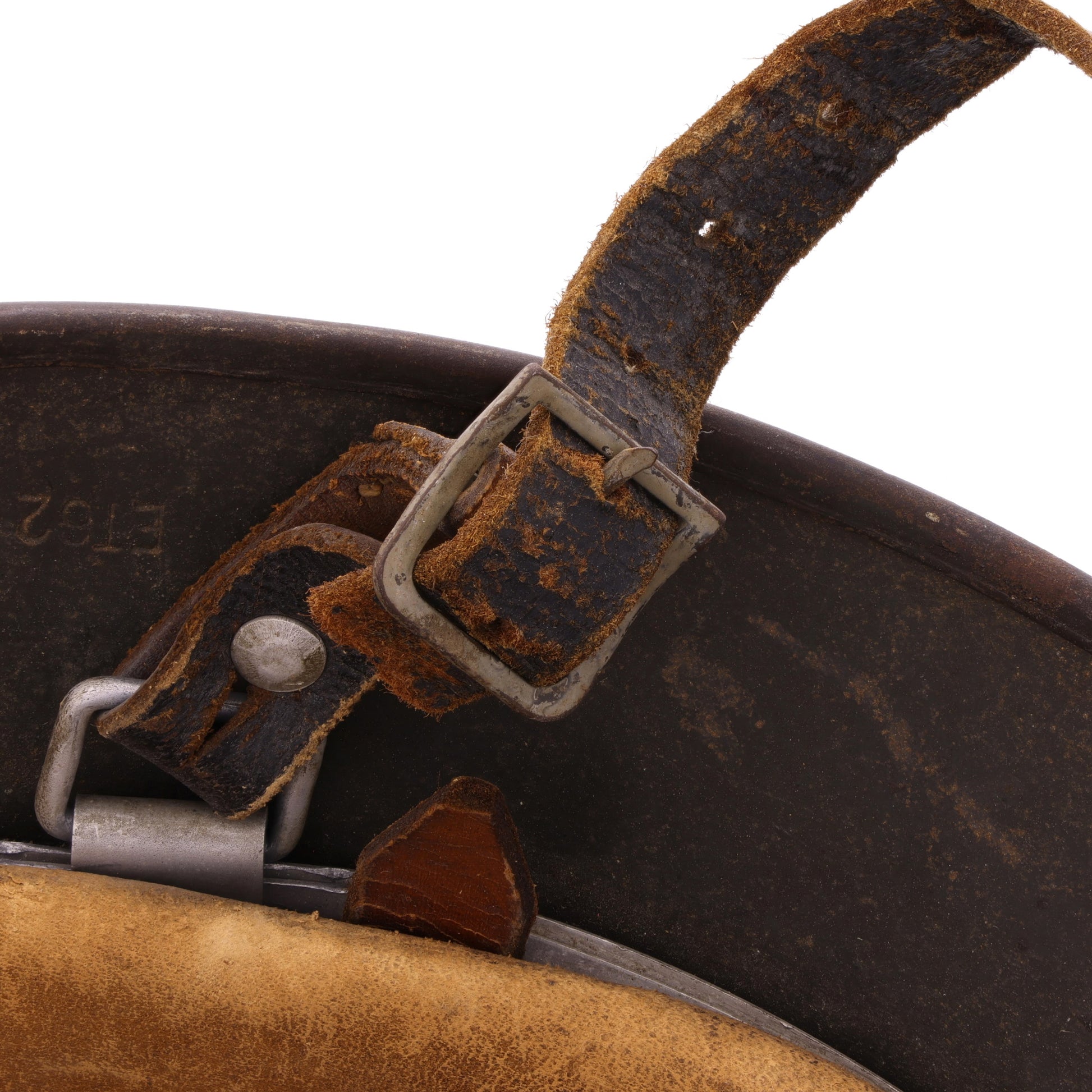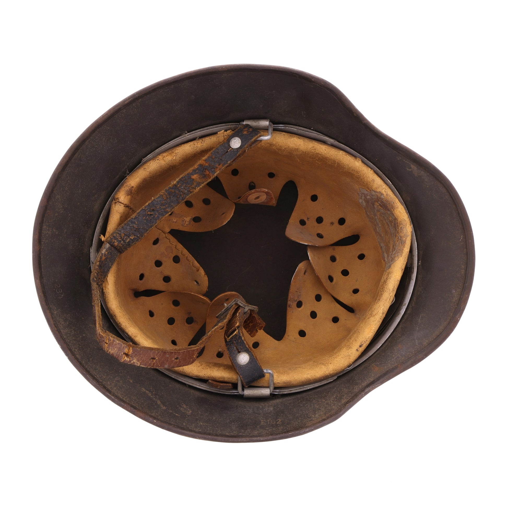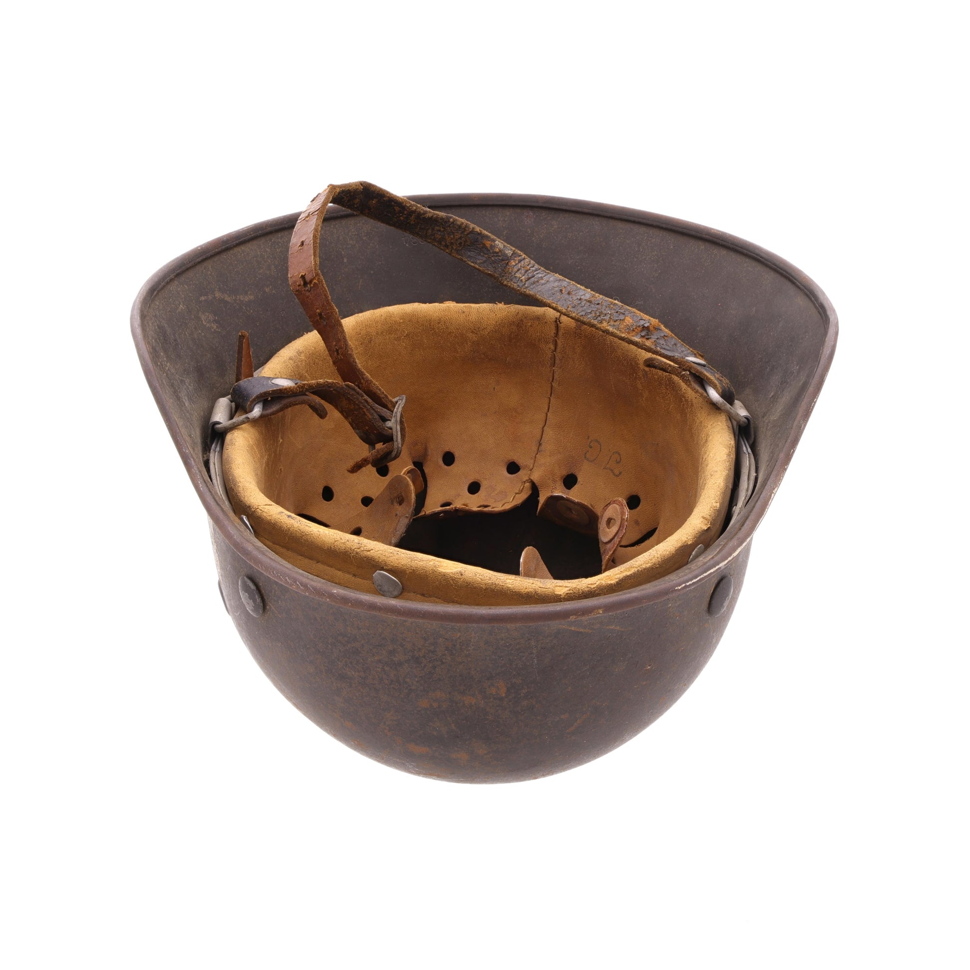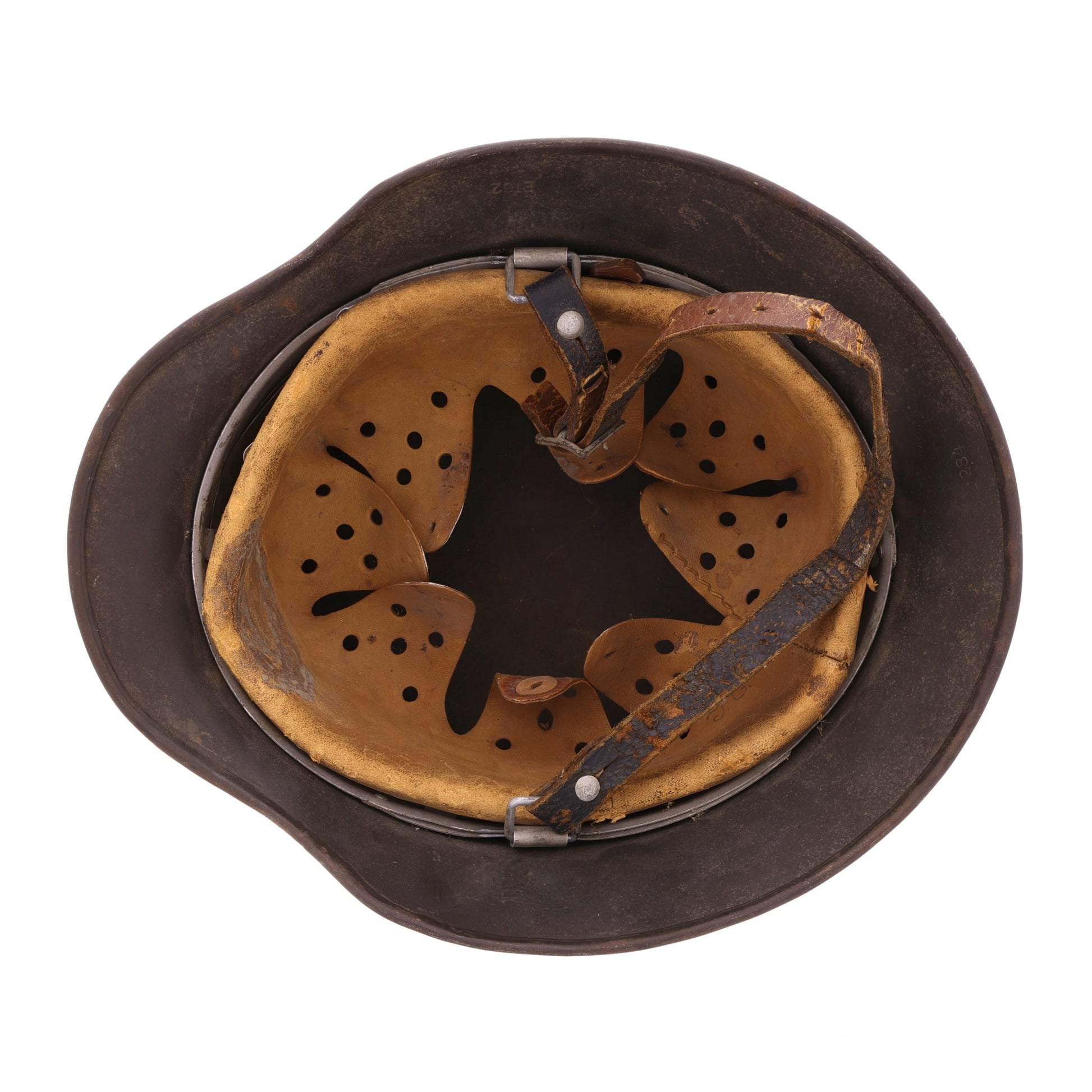 This helmet is in good, combat-used condition. There is minor surface rust throughout. The leather liner retains all of its tongues; however, its drawstring is missing. The chinstrap is unfortunately torn, but the separated piece is still present. This helmet displays quite nicely with its original decal still relatively intact.