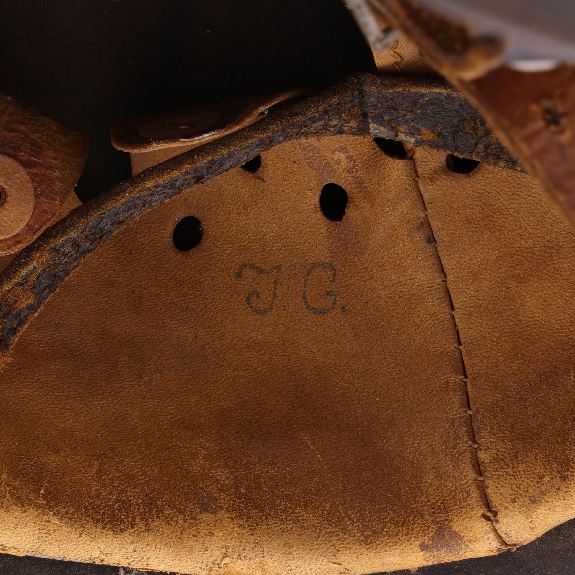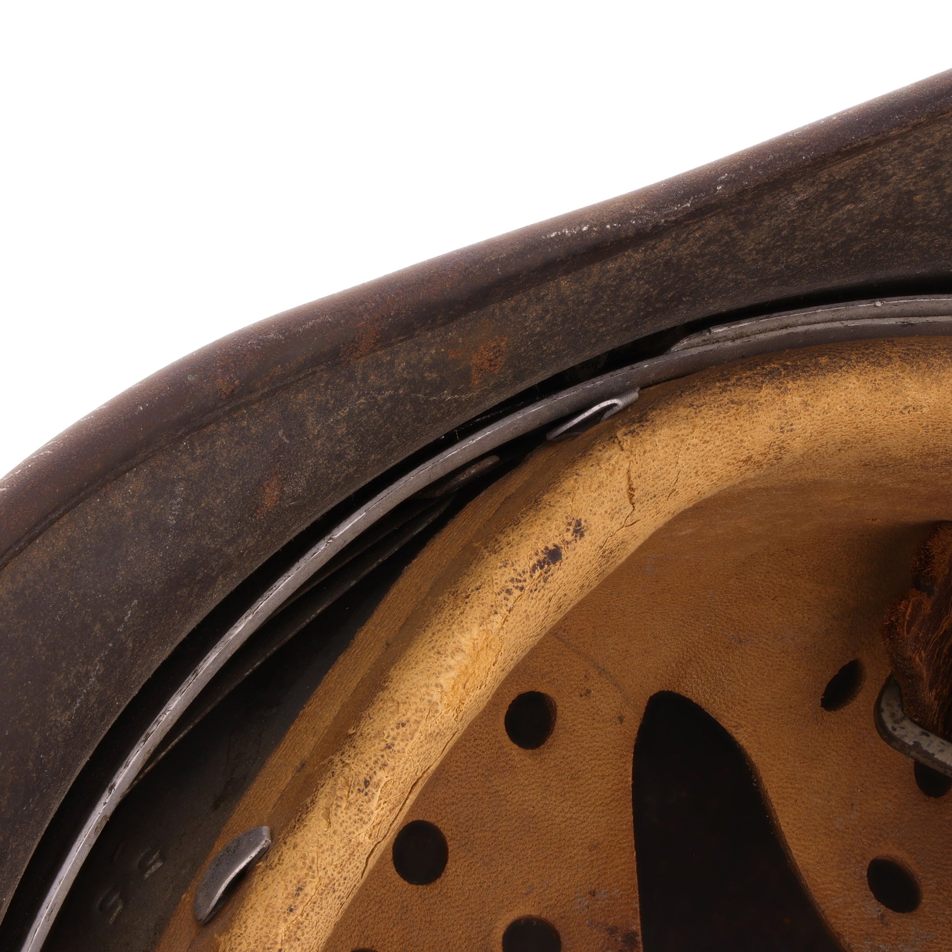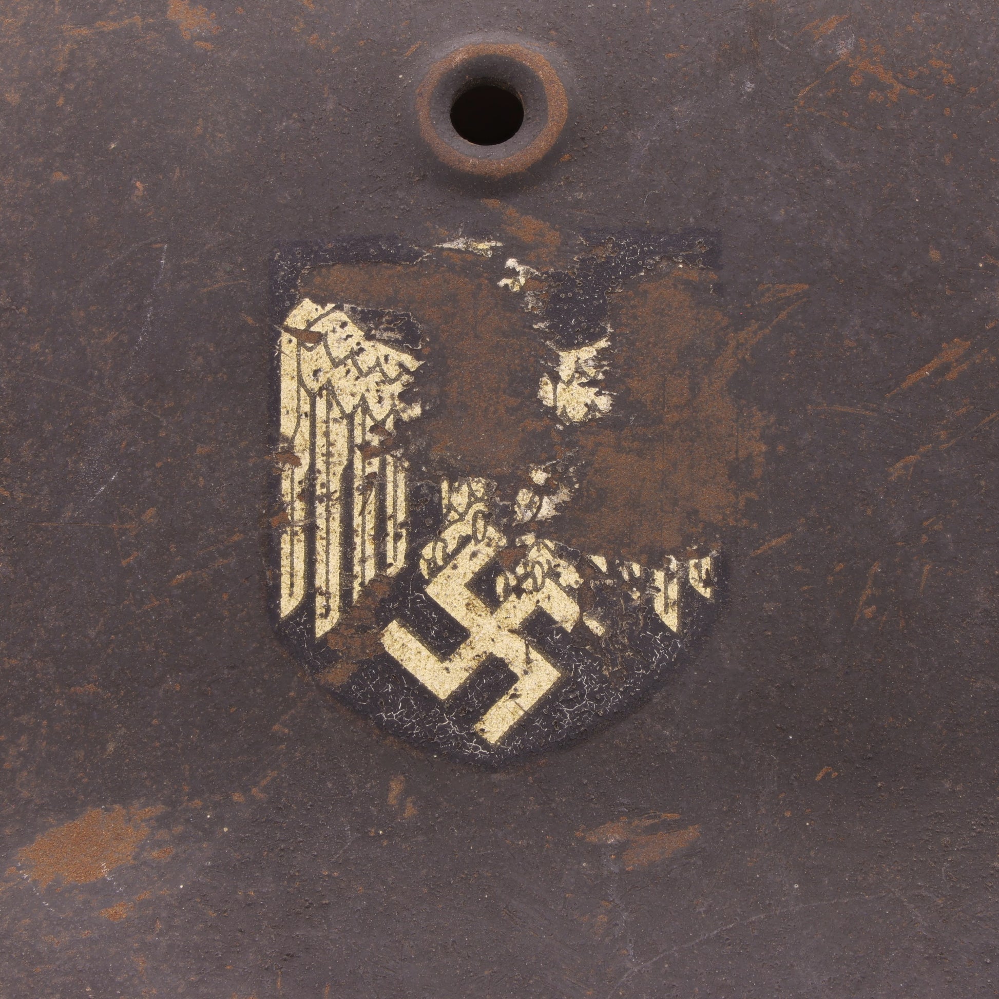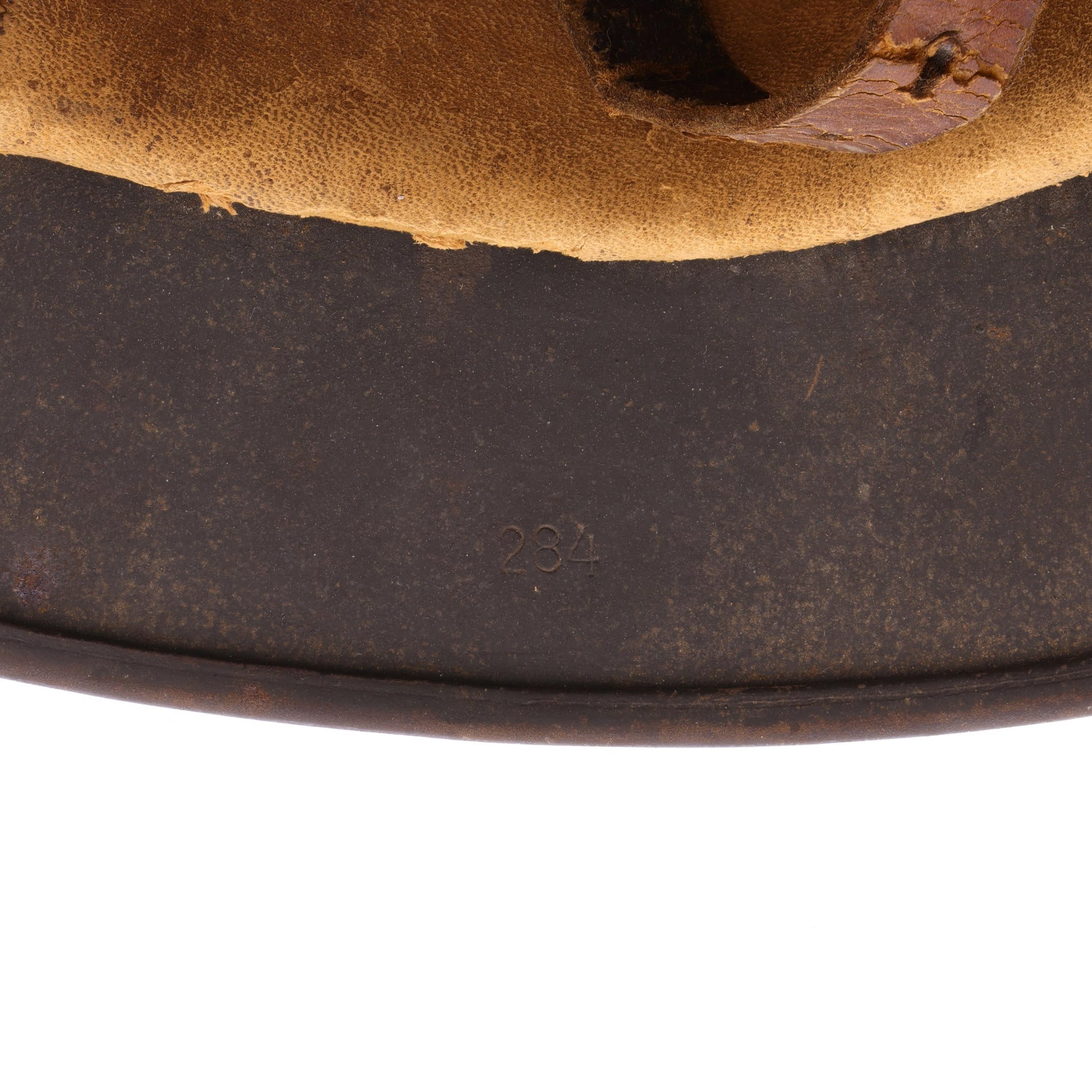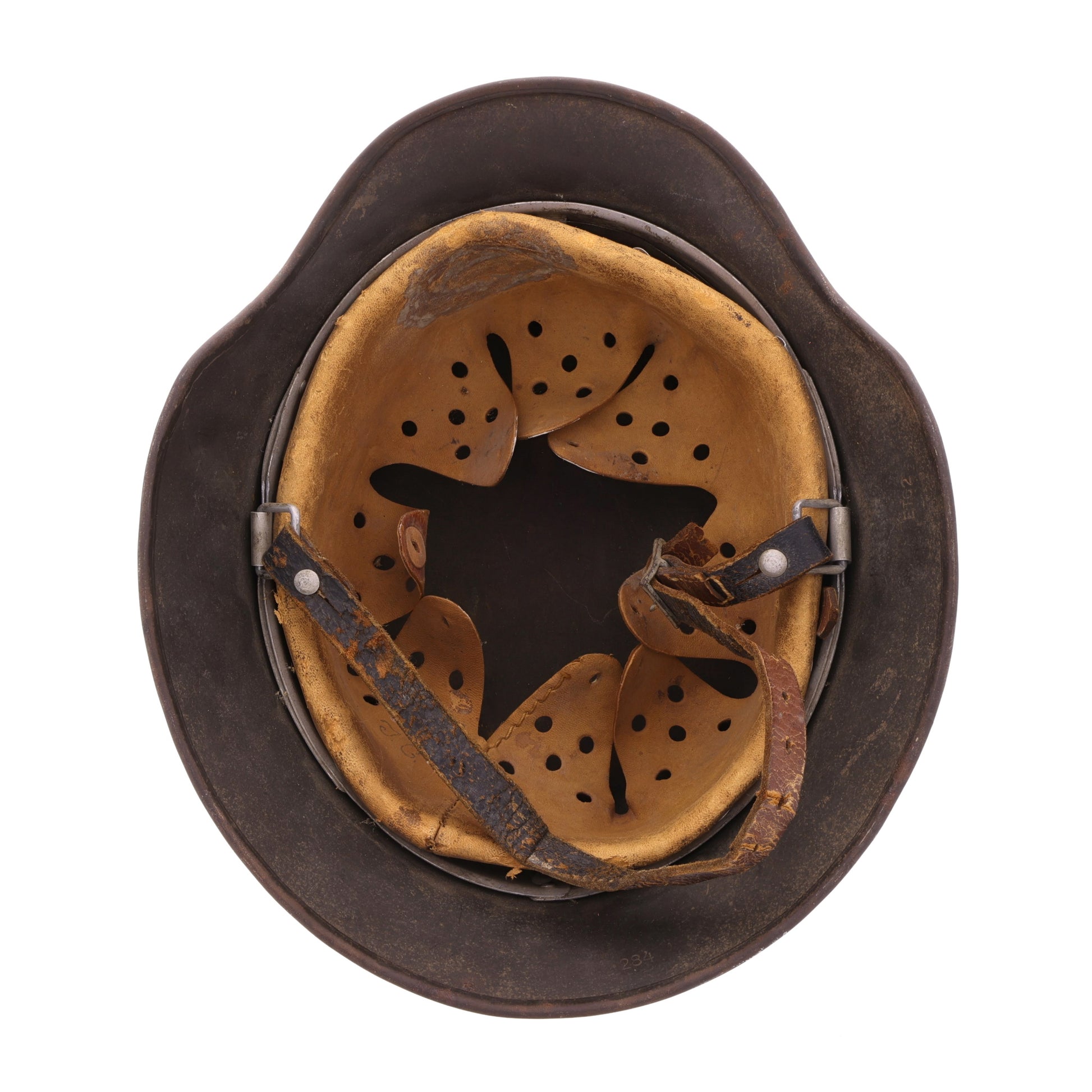 This helmet is in good, combat-used condition. There is minor surface rust throughout. The leather liner retains all of its tongues; however, its drawstring is missing. The chinstrap is unfortunately torn, but the separated piece is still present. This helmet displays quite nicely with its original decal still relatively intact.