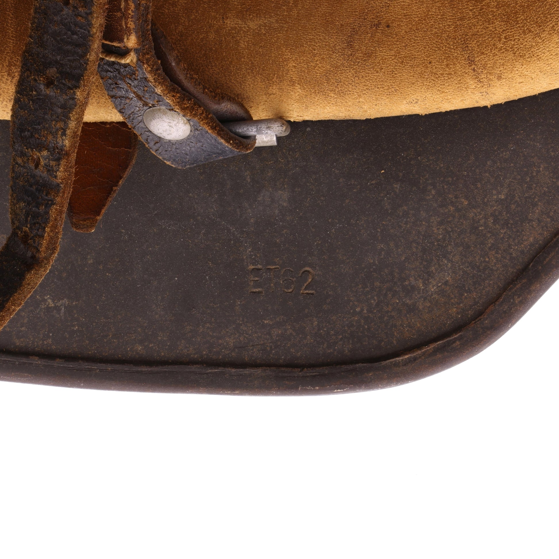 This is an original WWII German M40 single decal Heer helmet. The inside brim is size stamped "ET62", along with the lot number of "284", denoting 1940 production by the Eisenhüttenwerke, Thale factory. It showcases its original feldgrau factory finish. The interior retains its original size 55 leather liner and chinstrap. The chinstrap exhibits a grey painted steel buckle, while the liner is inscribed with the original owner's initials, "J.G." Interestingly, it features a reinforced aluminum liner band - most commonly seen in M35 helmets but also in early production M40 examples. The helmet's split pins and washers are all original and show no signs of tampering.