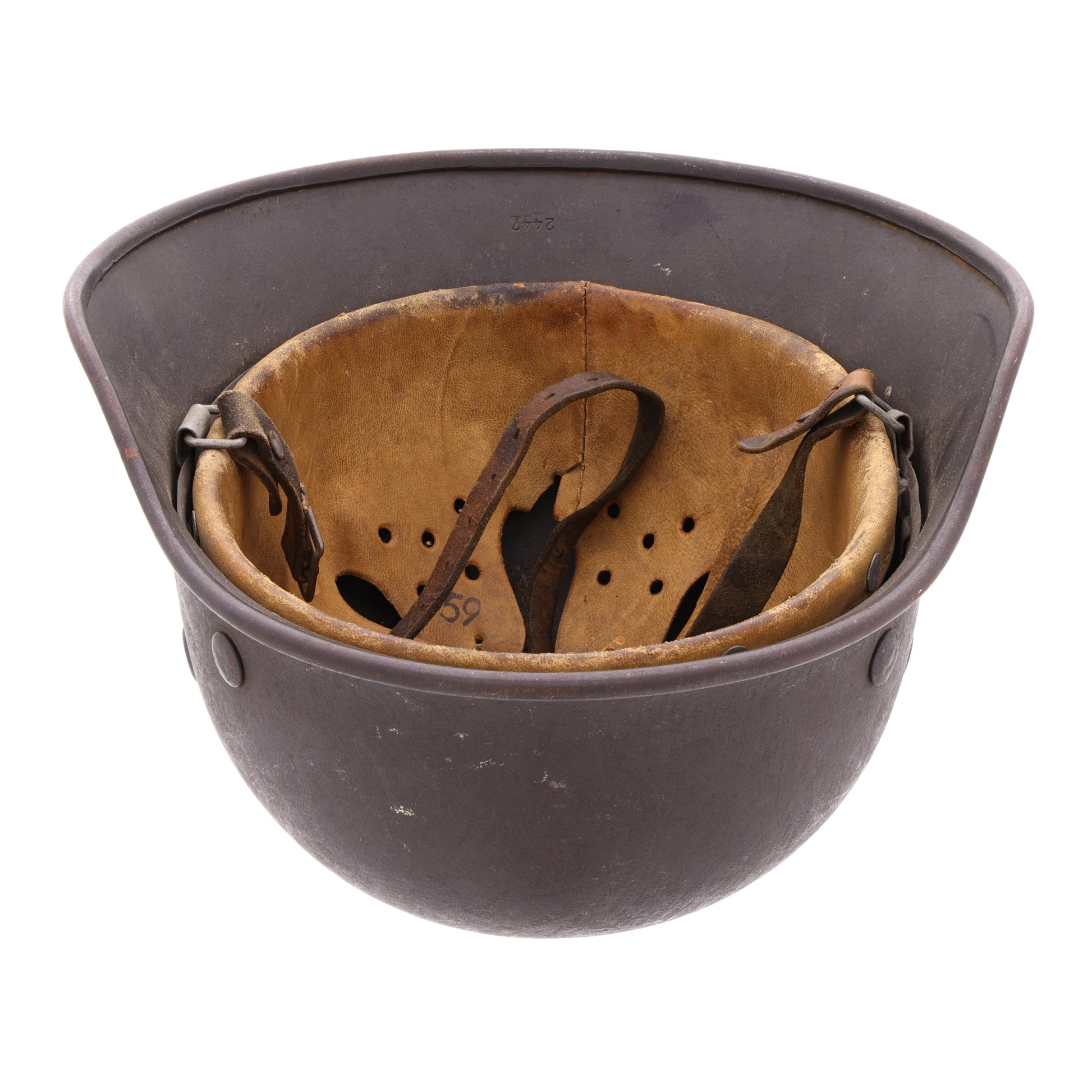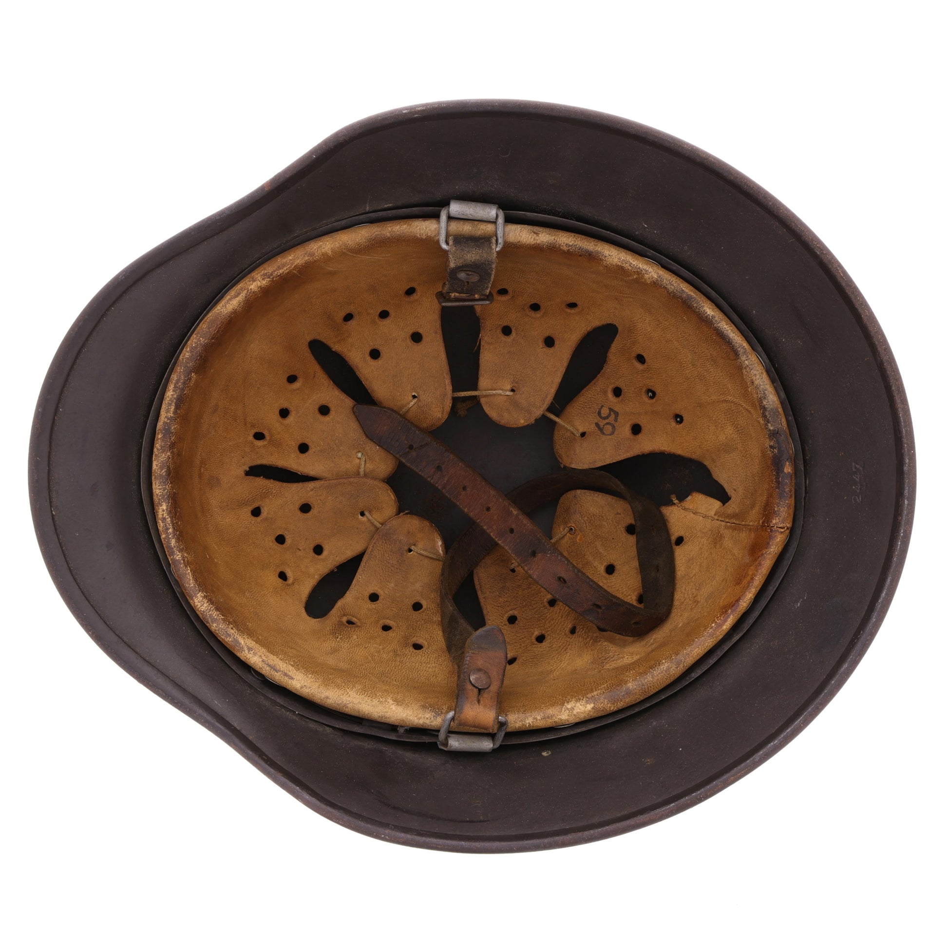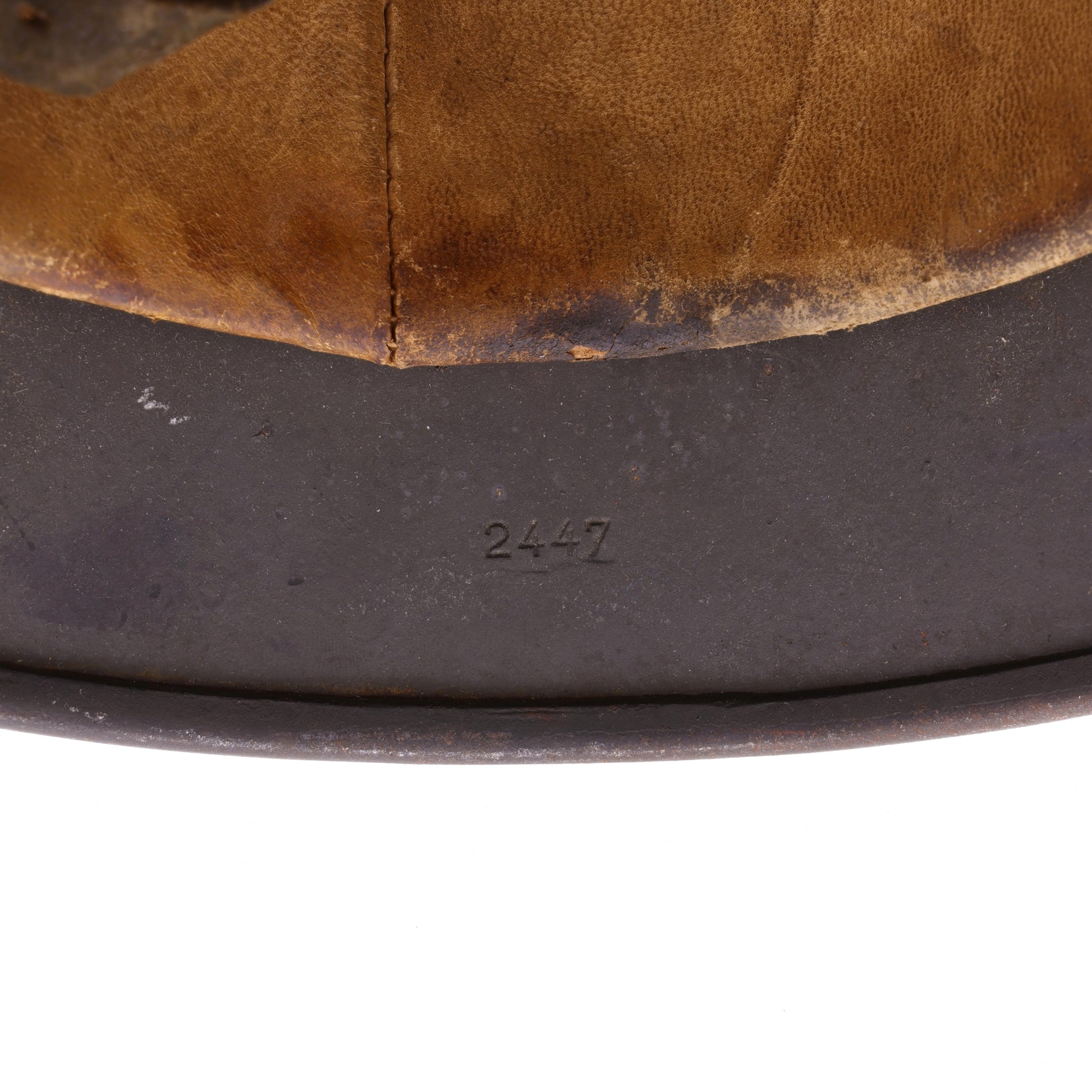 This is an original WWII German M40 single decal Heer helmet. The inside brim is size stamped "Q66", along with the lot number of "2447", denoting production by the F. W. Quist, Esslingen factory. It showcases its original feldgrau factory finish. The interior retains its original size 59 leather liner, drawstring, and complete chinstrap. The chinstrap exhibits a steel buckle and is stamped with a "RBNr. 1/1000/0005" marking. The helmet's split pins and washers are all original and show no signs of tampering.