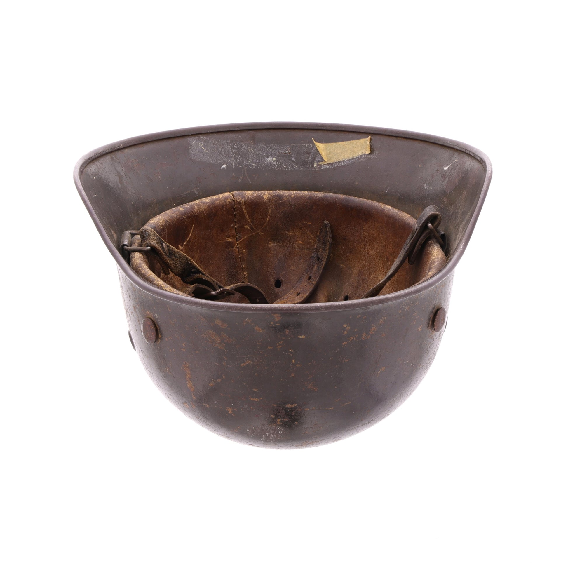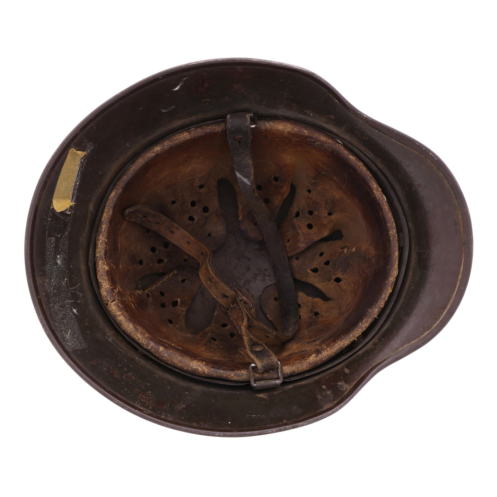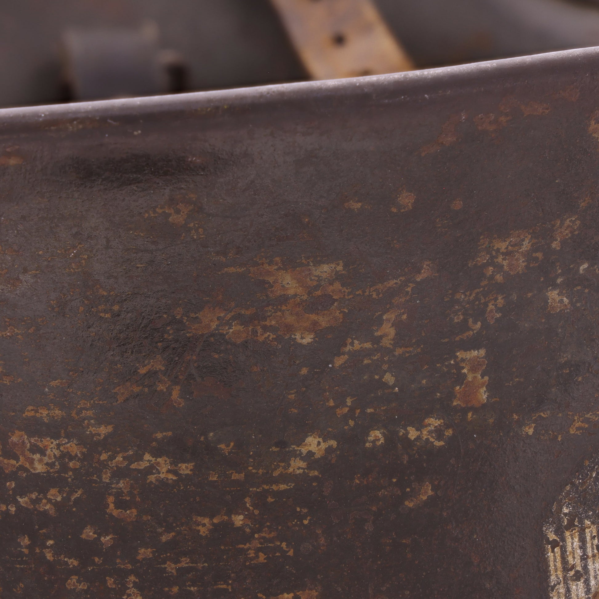 This helmet is in good, combat-used condition. The leather liner retains all of its tongues; however, its drawstring is missing. This helmet displays quite nicely with its original decal still relatively intact.