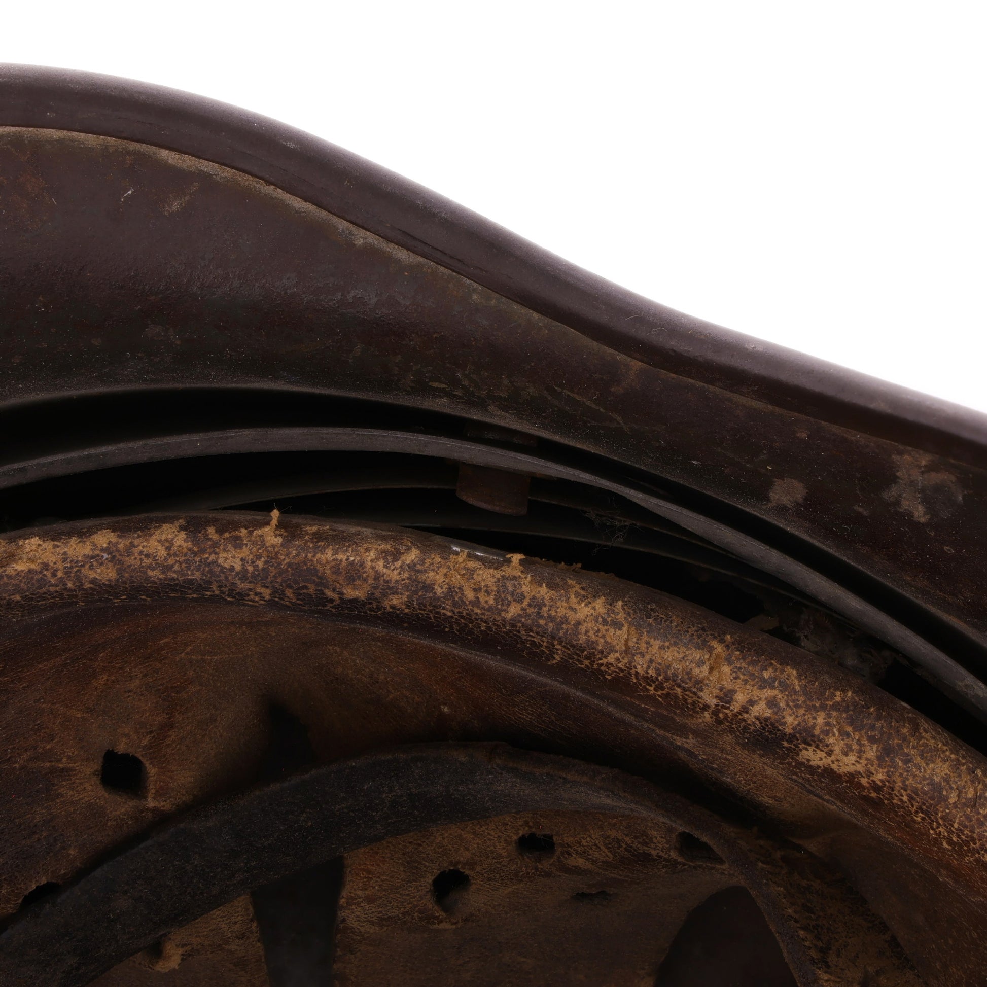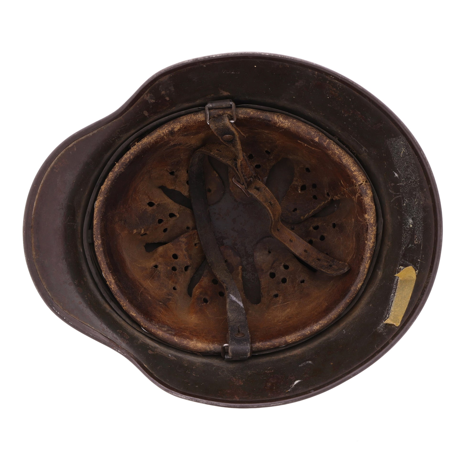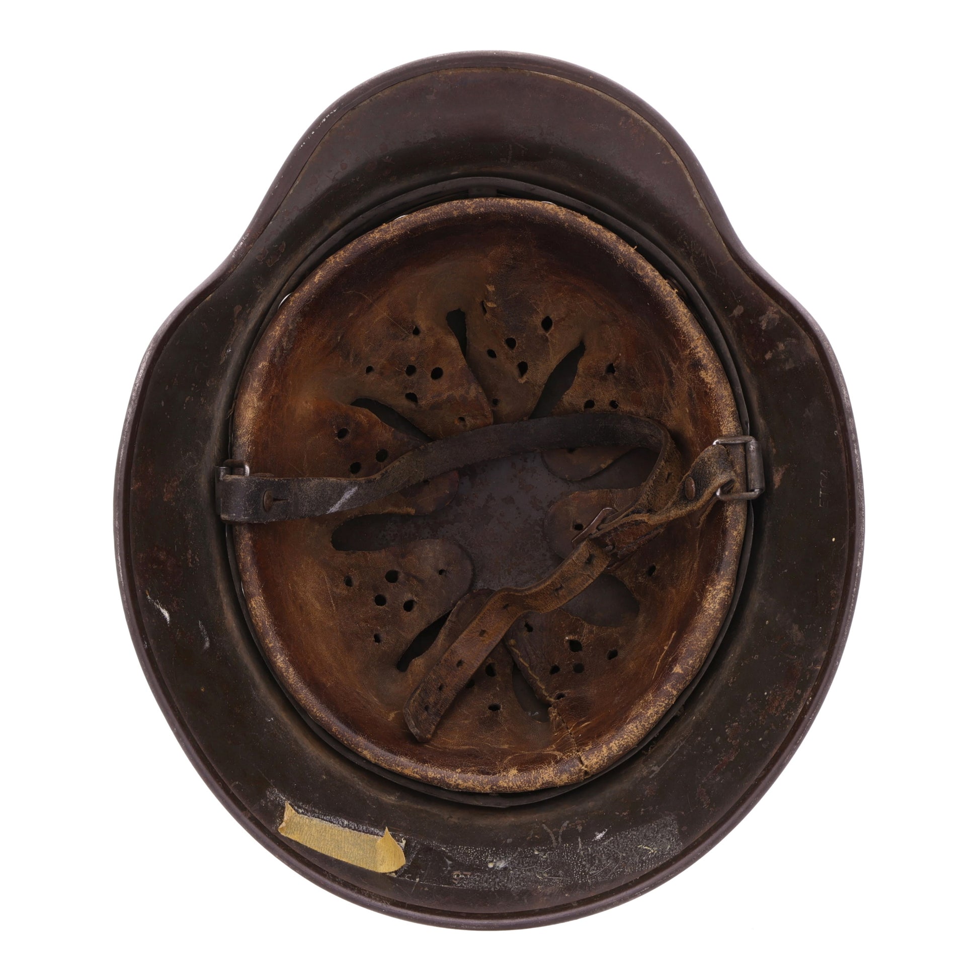 This helmet is in good, combat-used condition. The leather liner retains all of its tongues; however, its drawstring is missing. This helmet displays quite nicely with its original decal still relatively intact.