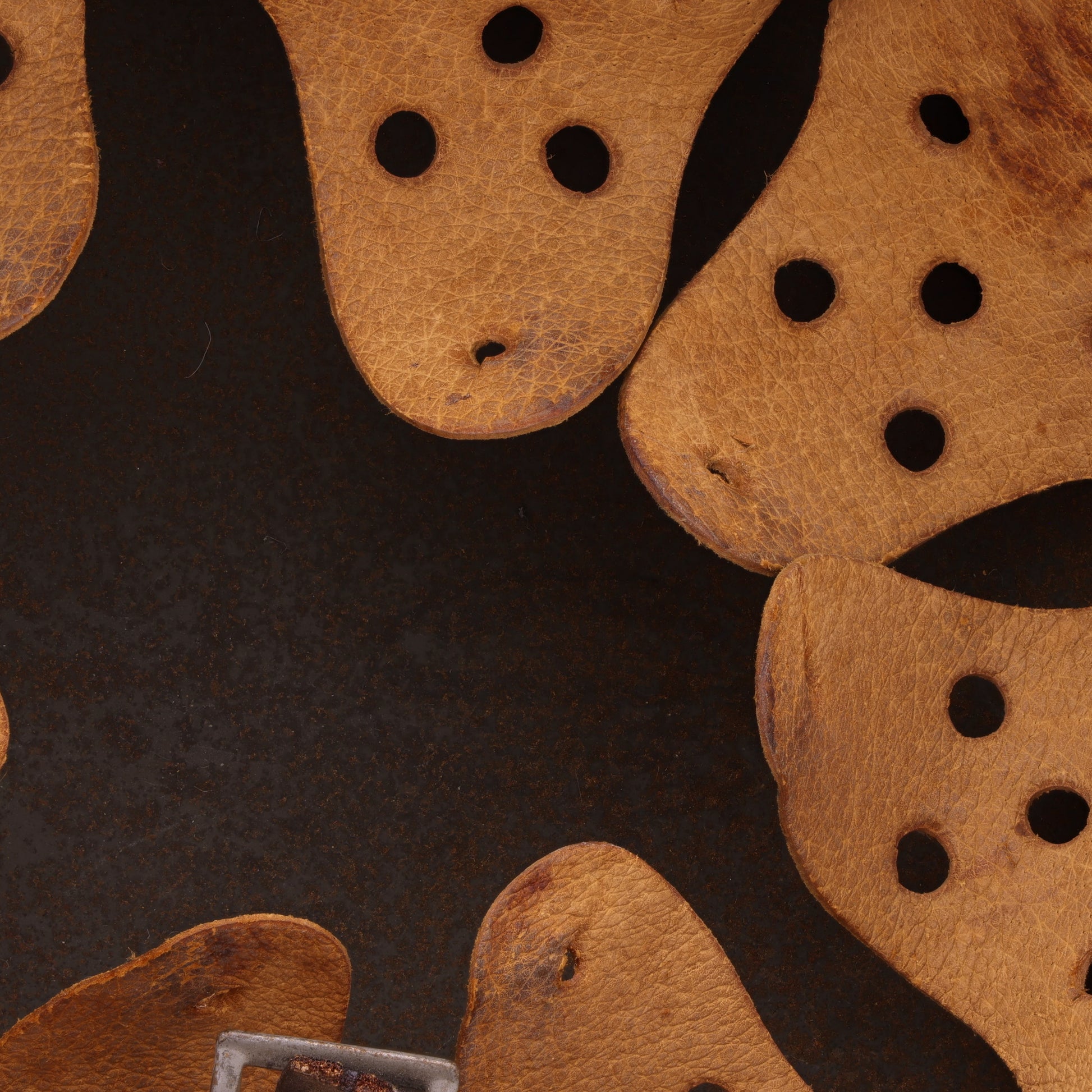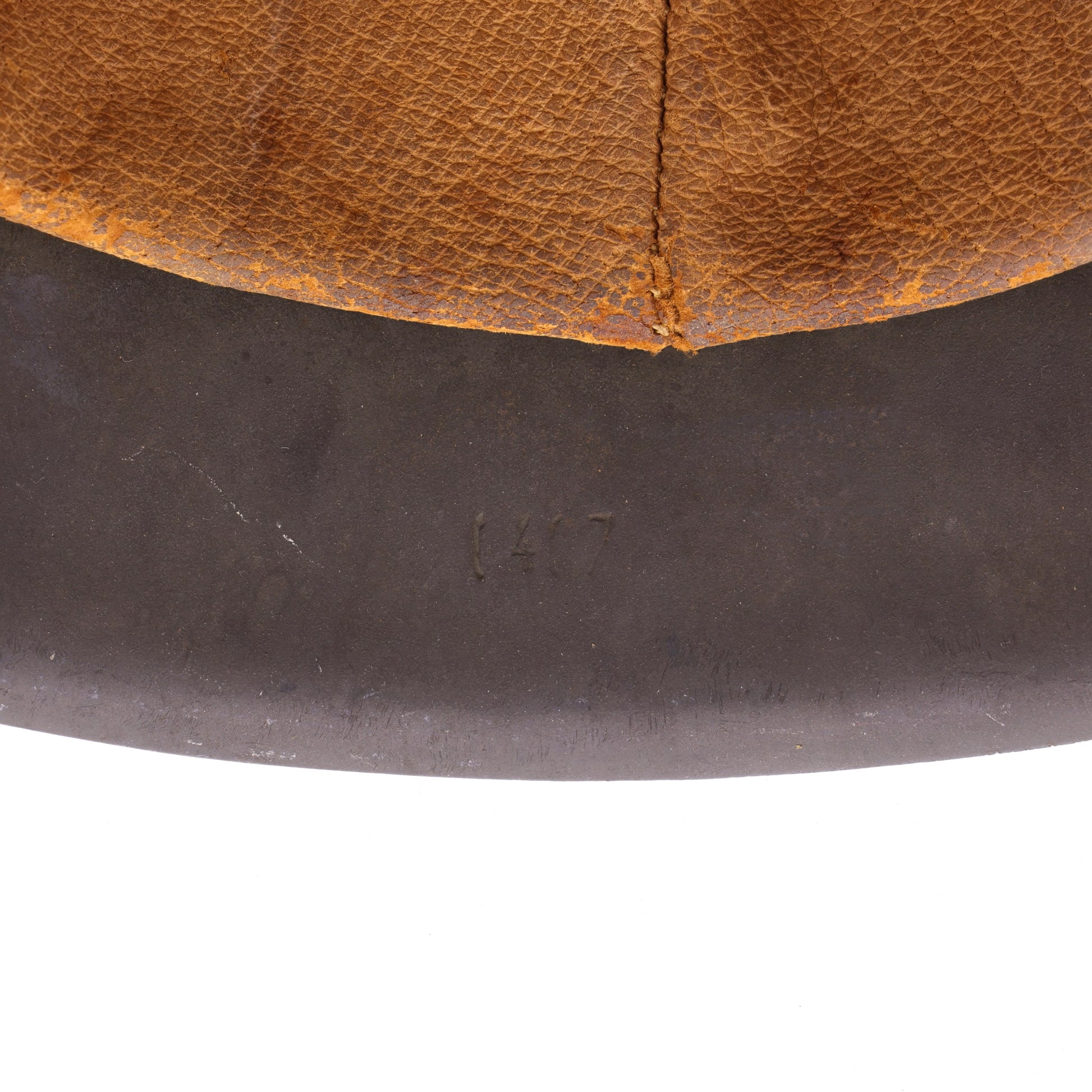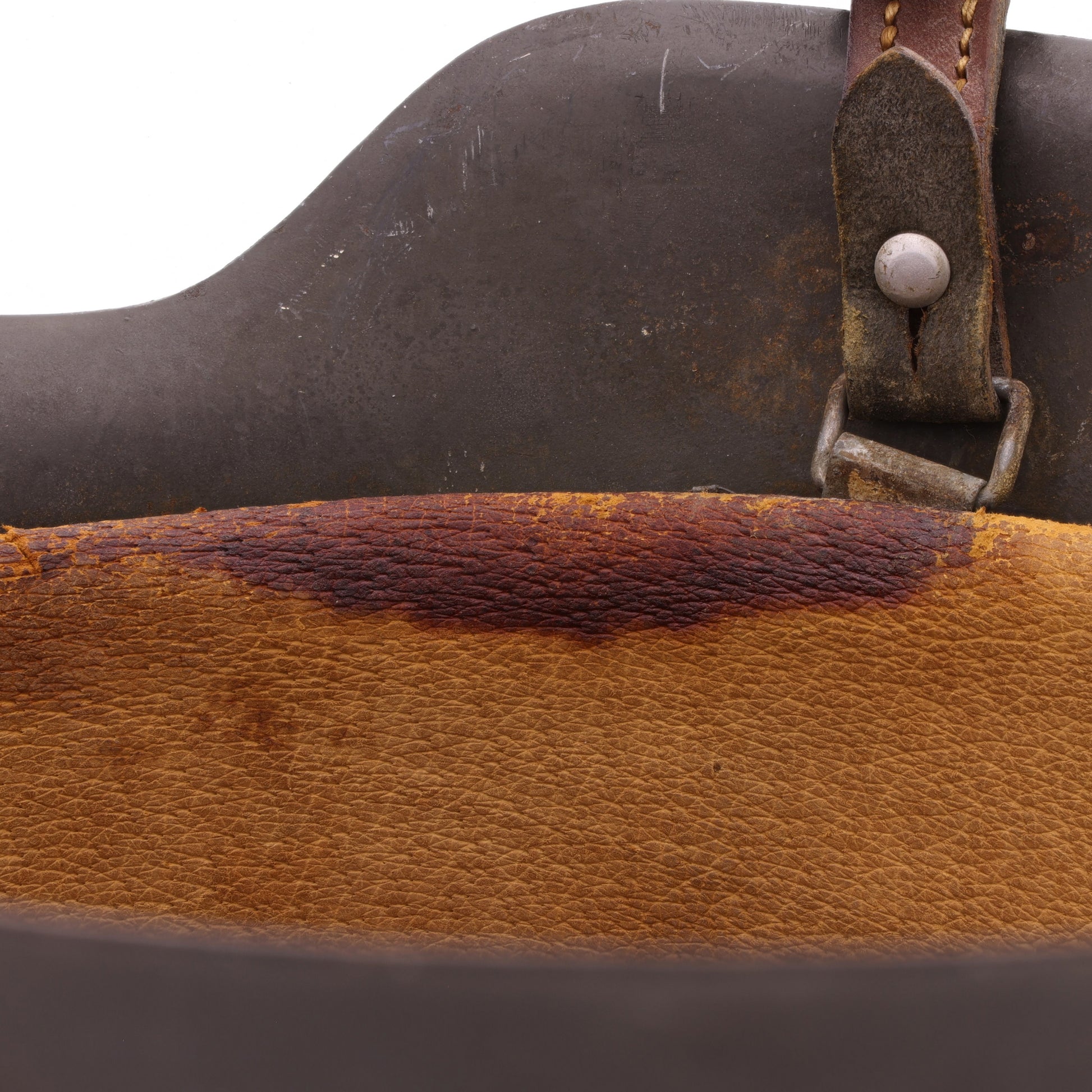 This is an original WWII German M42 single decal Heer helmet. The inside brim is size stamped "EF66", along with the apparent lot number of "0407", denoting production by the Emaillierwerke A.G., Fulda factory. Atop its original feldgrau finish is the word "fern" in a Germanic style handwriting; this roughly translates to "distant, far-off, faraway, remote, etc." Unfortunately, its significance is unknown to us. The interior retains its original size 58 leather liner and chinstrap remnants. The leather that would have come in contact with the wearer's forehead is blood-stained; one can only imagine what this helmet has witnessed. The helmet's split pins and washers are all original and show no signs of tampering.