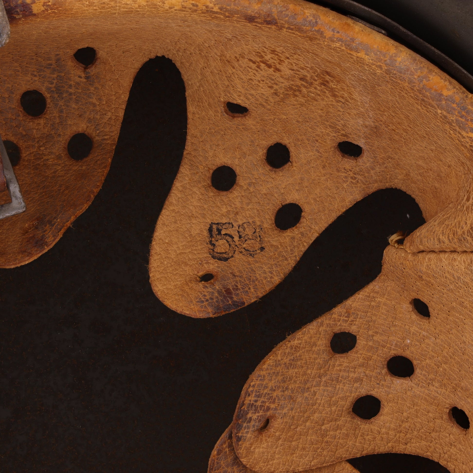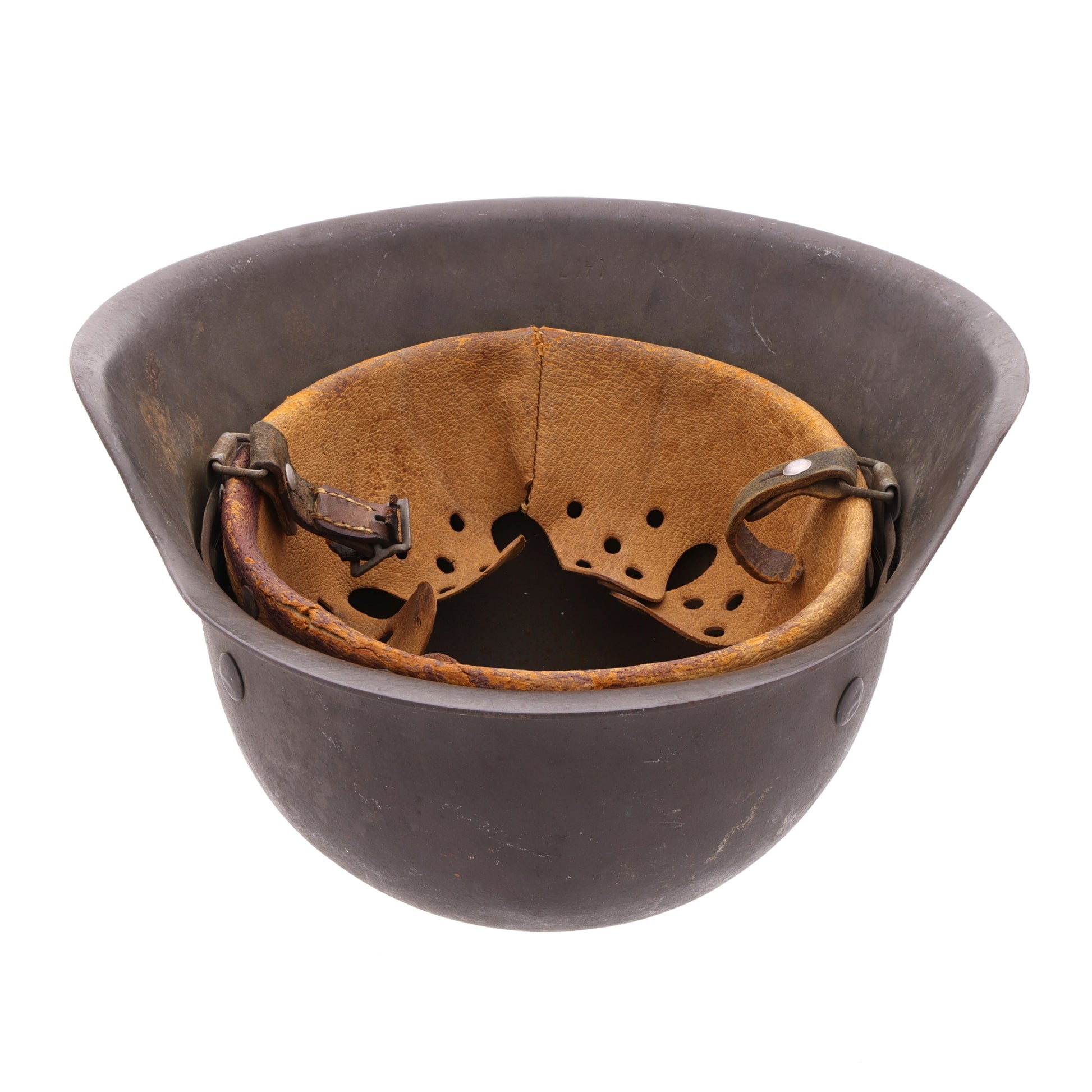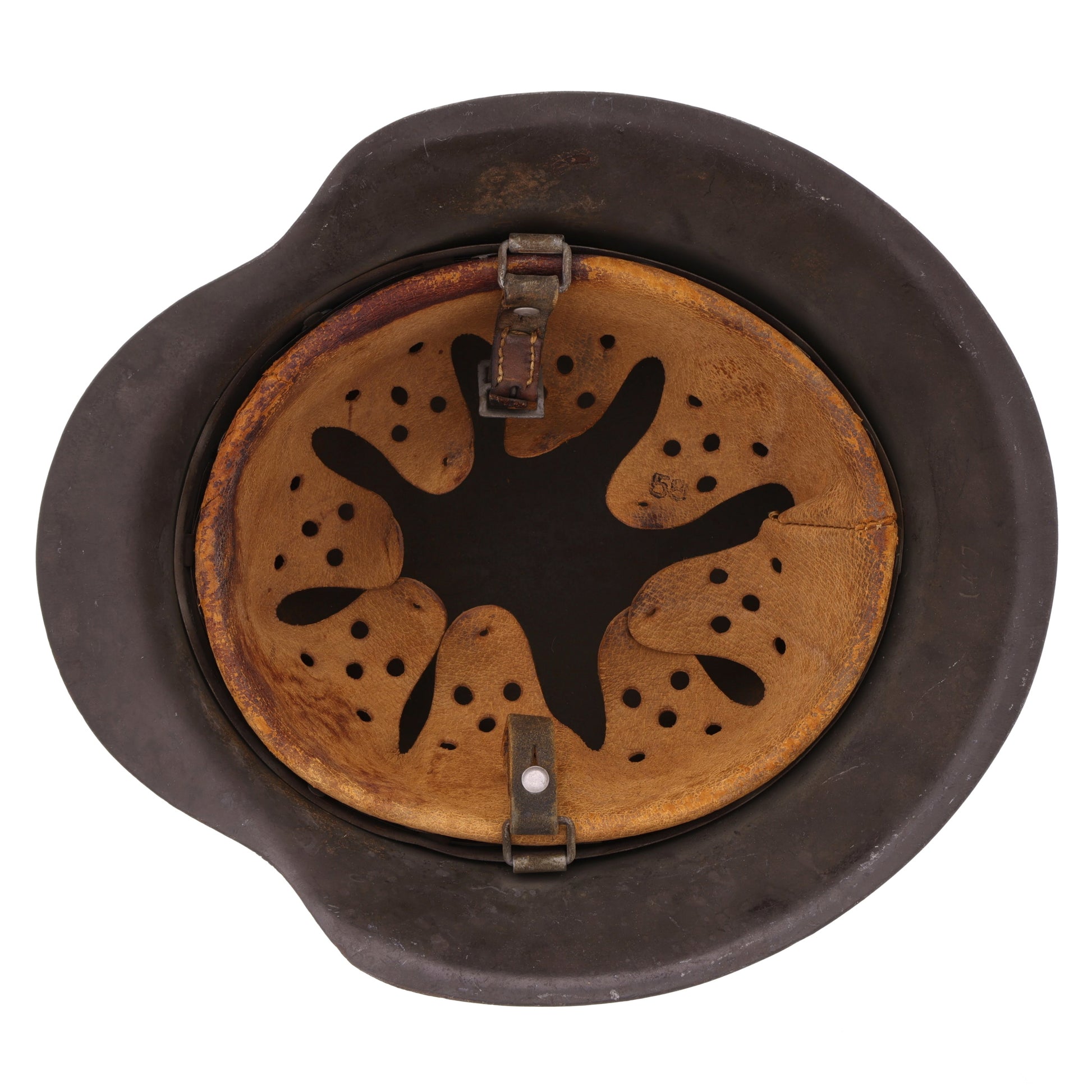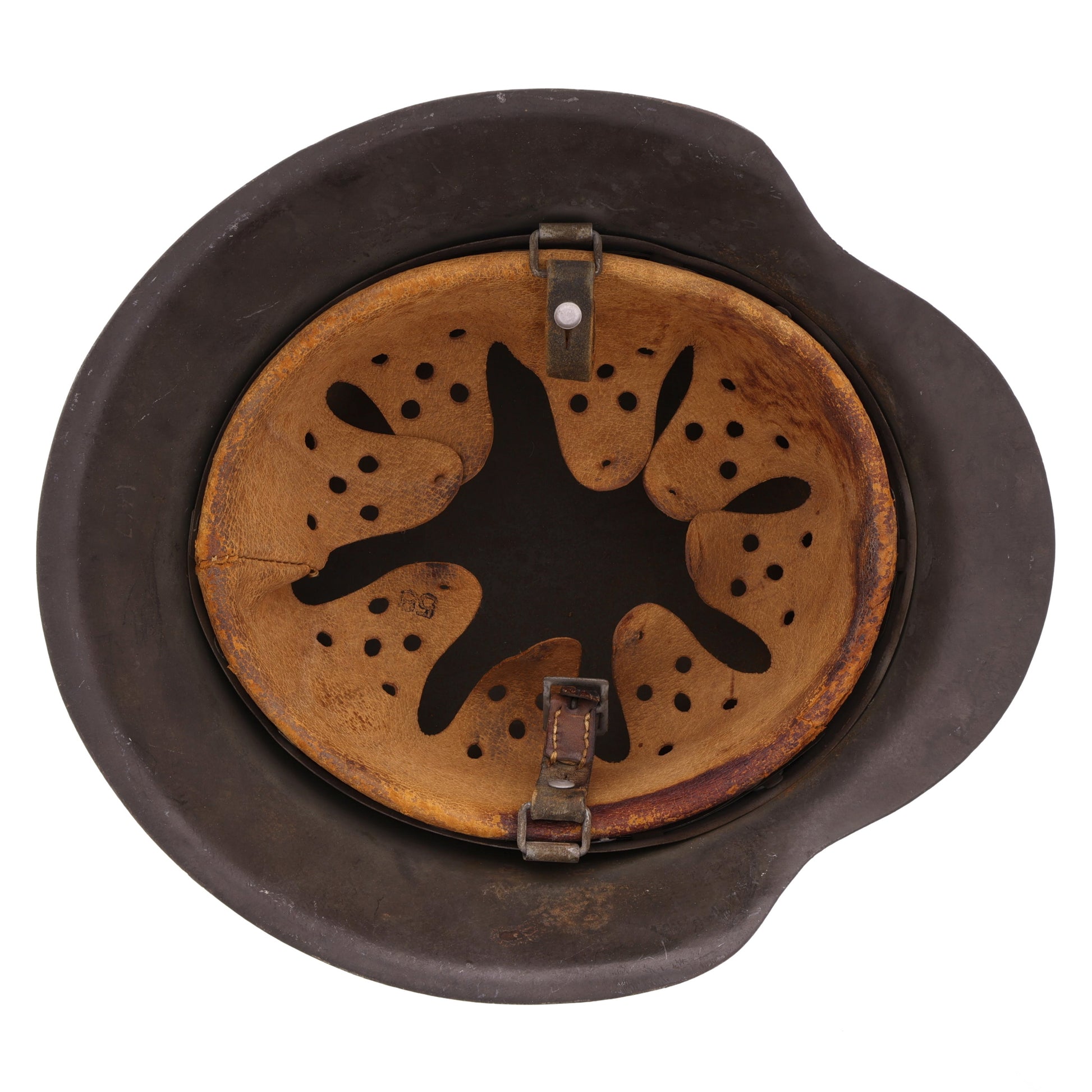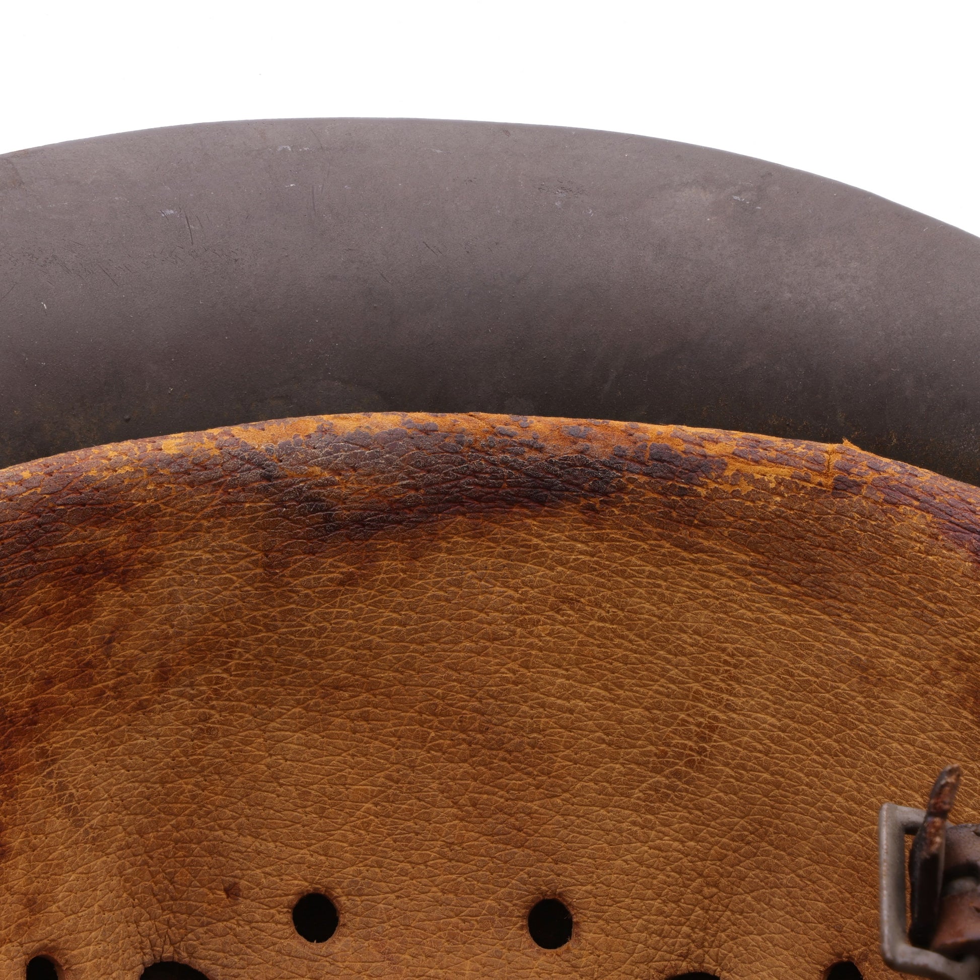 This helmet is in very good, combat-used condition. Its original feldgrau factory finish and decal are nearly fully intact. Unfortunately, the leather chinstrap's longer side is torn, and the liner's drawstring is missing.