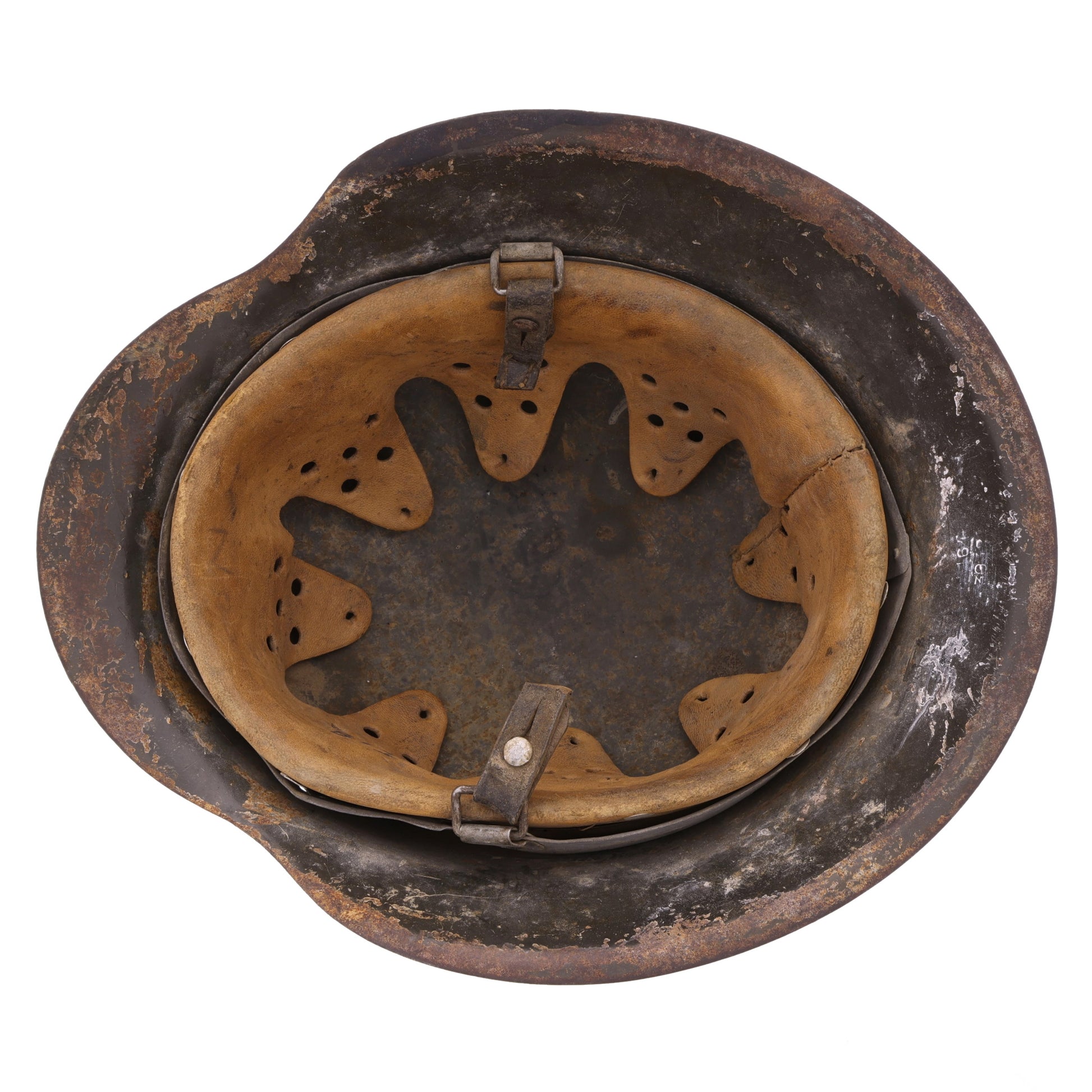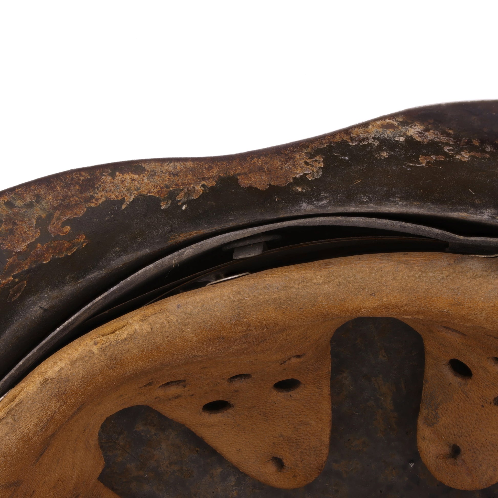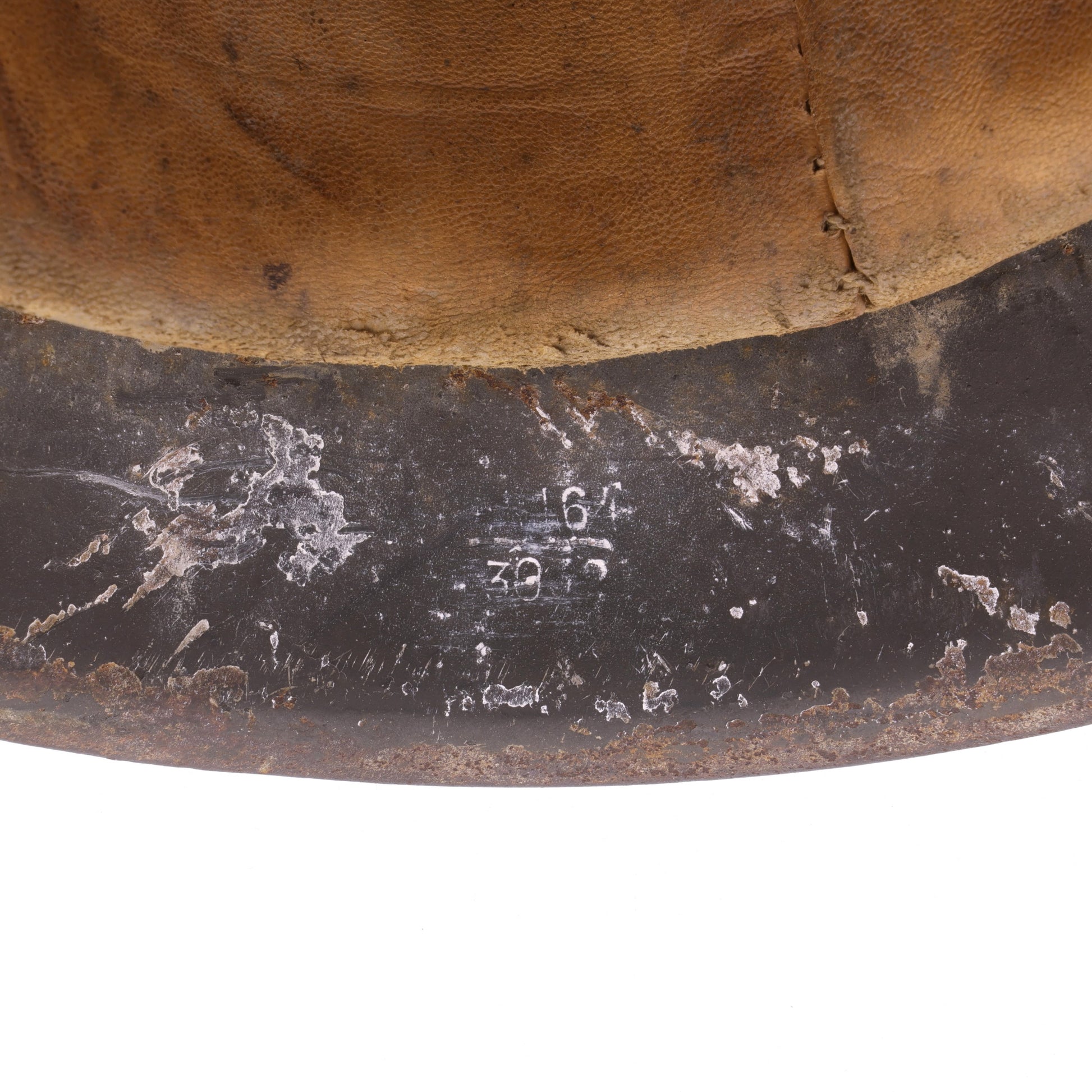 This helmet is in good, combat-used condition. There is surface rust throughout; however, its decal is nearly fully intact. Unfortunately, one of the split pins is missing, but those that remain show no signs of tampering.