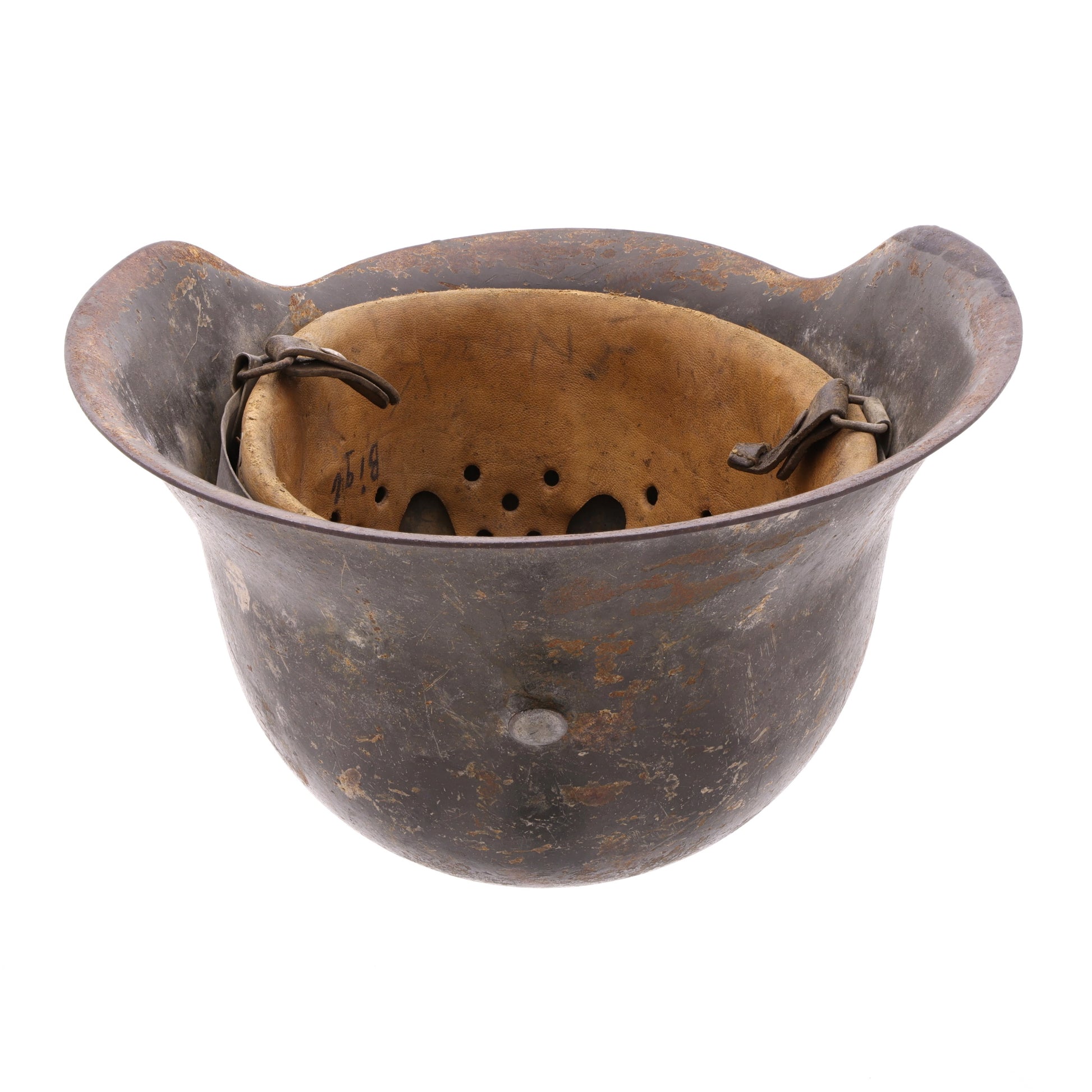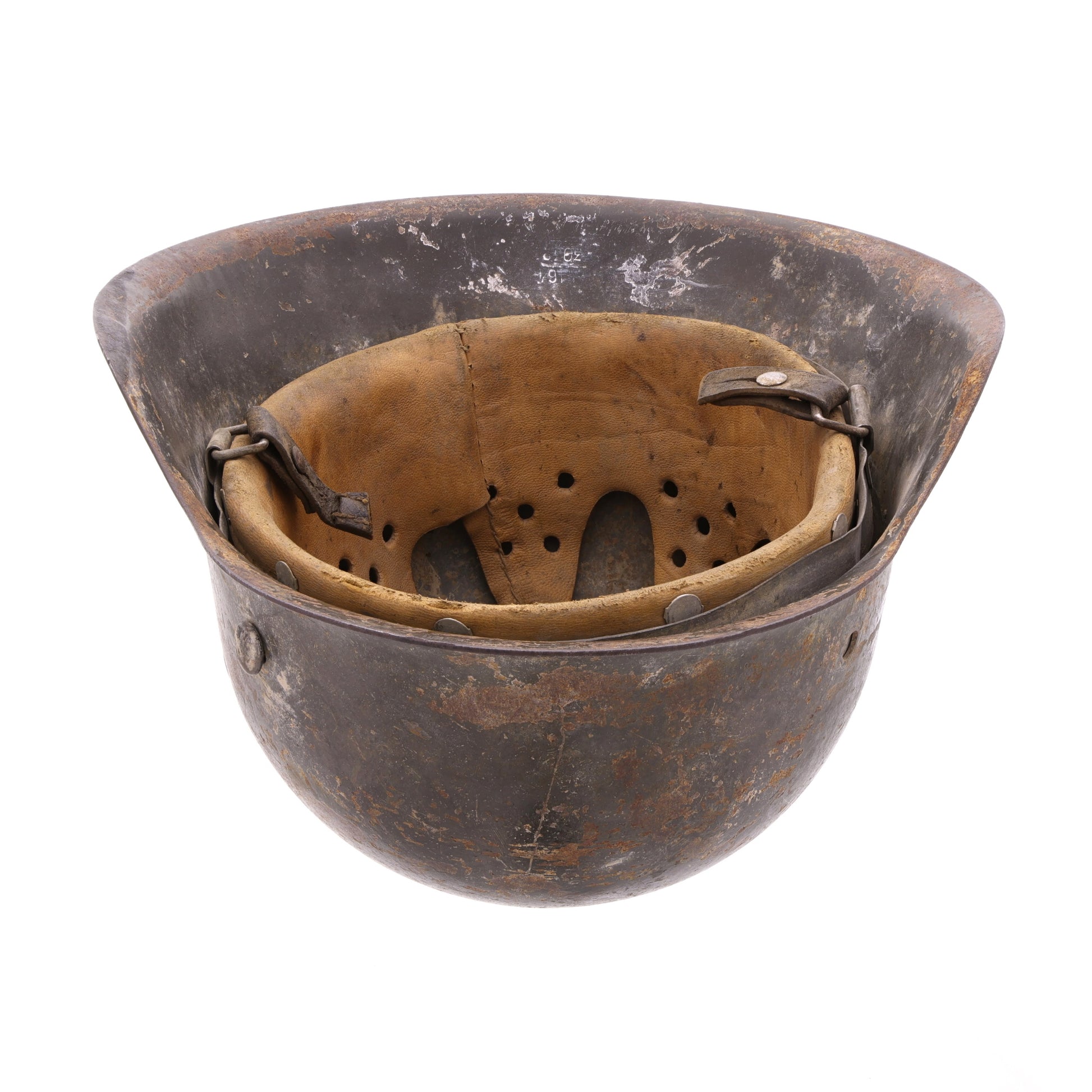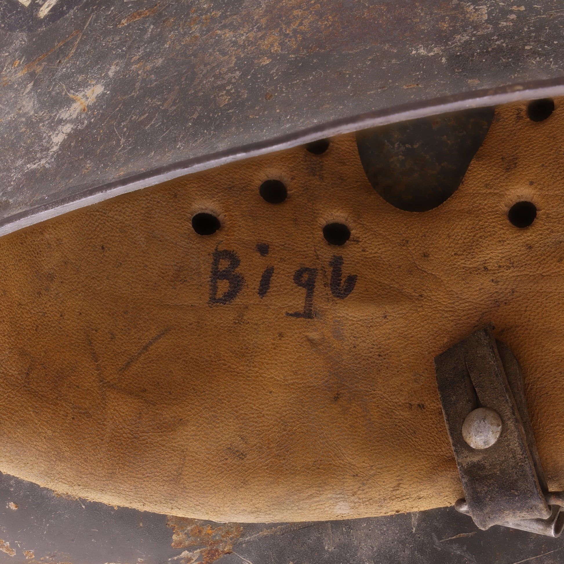 This is an original and named WWII German M42 single decal Heer helmet. The inside brim is size stamped "ckl64", along with the lot number of "3032", denoting 1943 production by the Eisenhüttenwerke, Thale factory. Atop its original feldgrau finish are remnants of a whitewash winter camouflage. The interior retains its original leather liner and chinstrap remnants. The liner is marked with its original owner's surname, "Bigl". A search of the Volksbund Grave Registry unfortunately reveals too many results to be conclusive. The helmet's interior features a faint dome stamp.