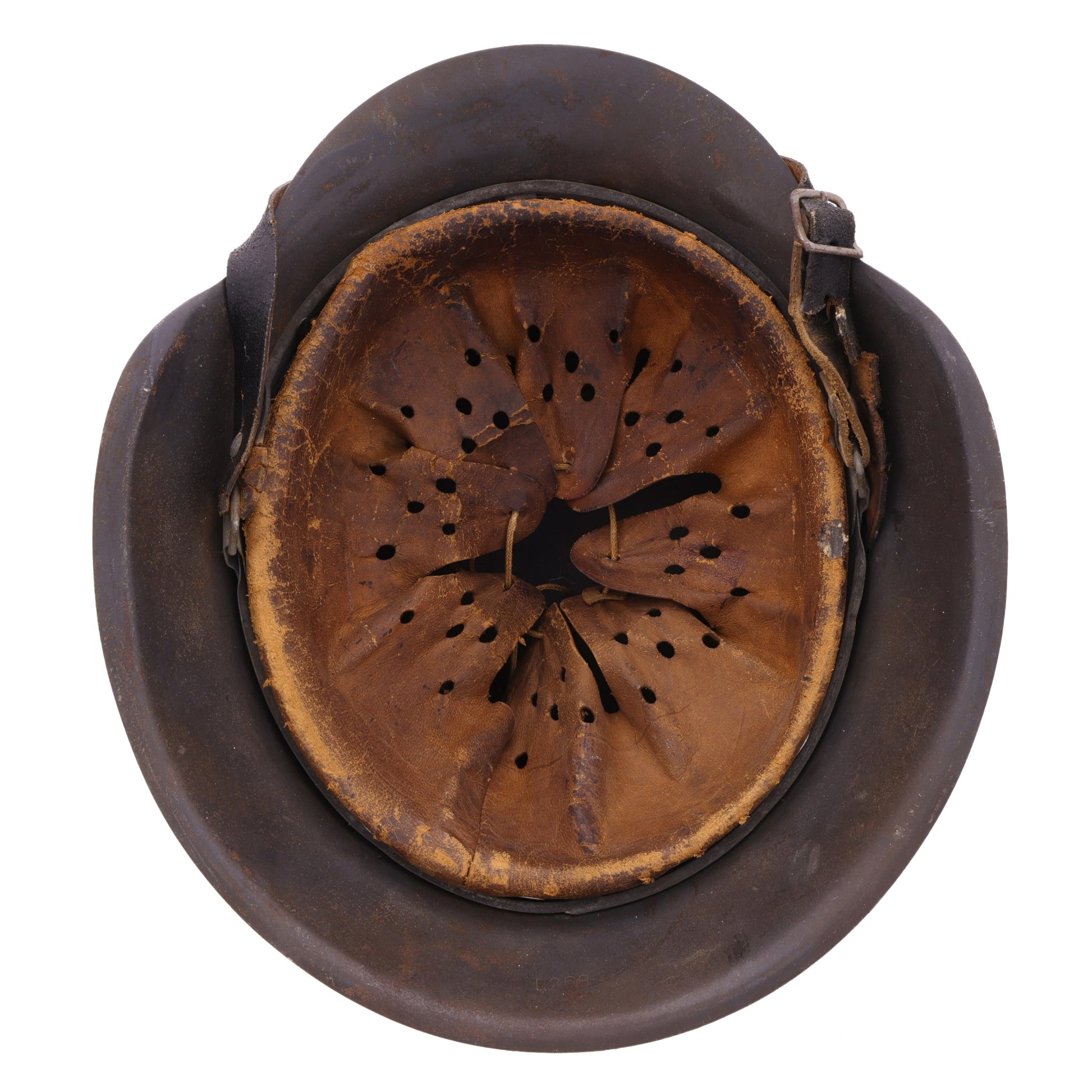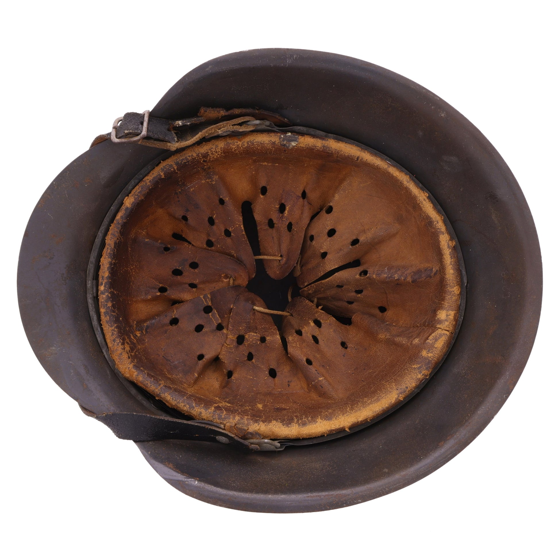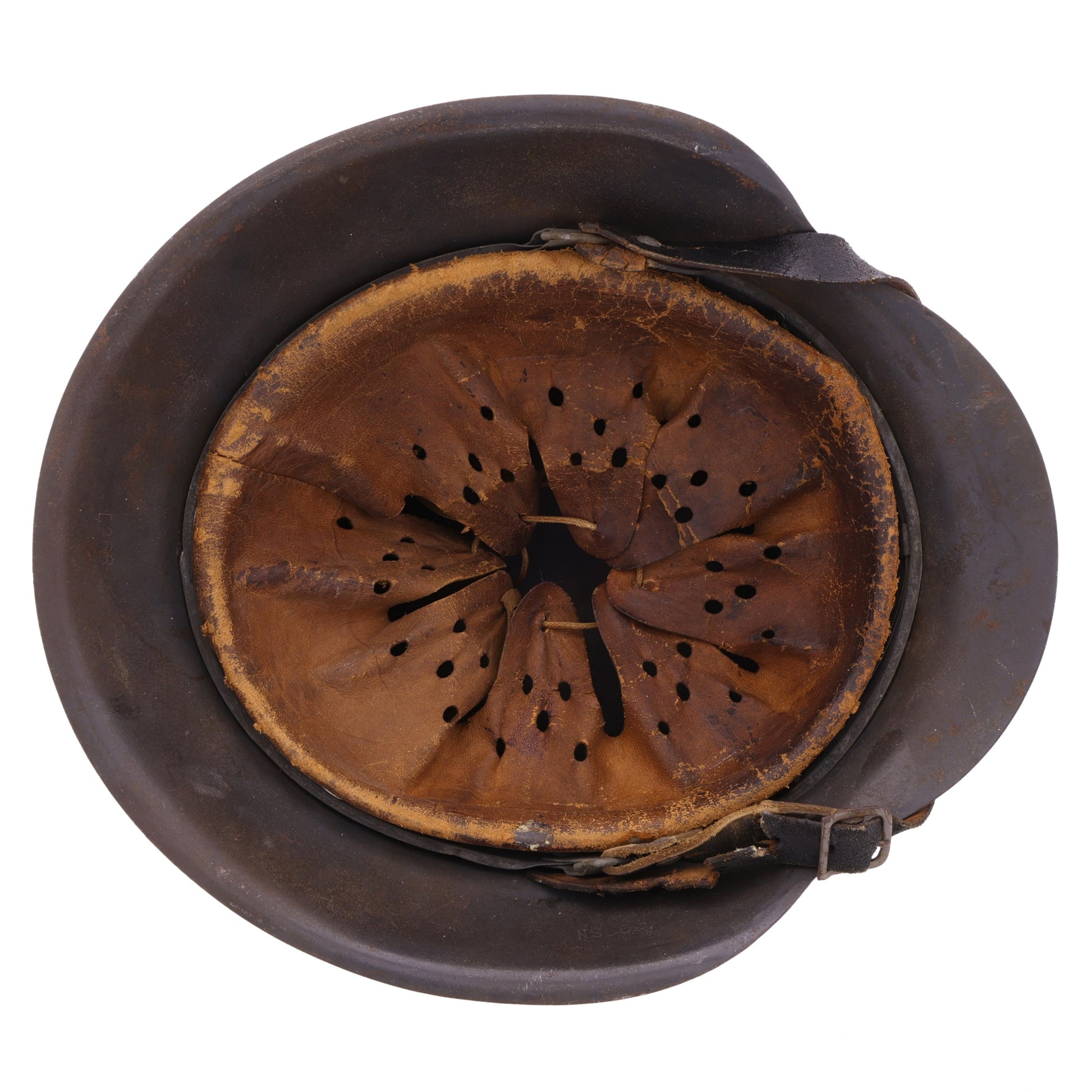 This is an original WWII German M42 single decal Luftwaffe helmet. The inside brim is size stamped "NS66", along with the lot number of "D268", denoting production by the Vereinigte Deutsche Nickelwerke, Schwerte factory. It showcases its original feldblau factory finish. The interior retains its original leather liner, drawstring, and chinstrap. The chinstrap exhibits a gray painted steel buckle and is stamped "G. SINGER, KLATTAU, 1944". The helmet's split pins and washers are all original and show no signs of tampering.