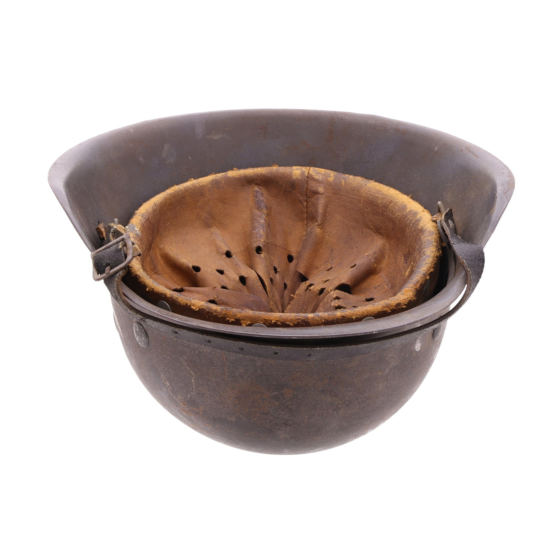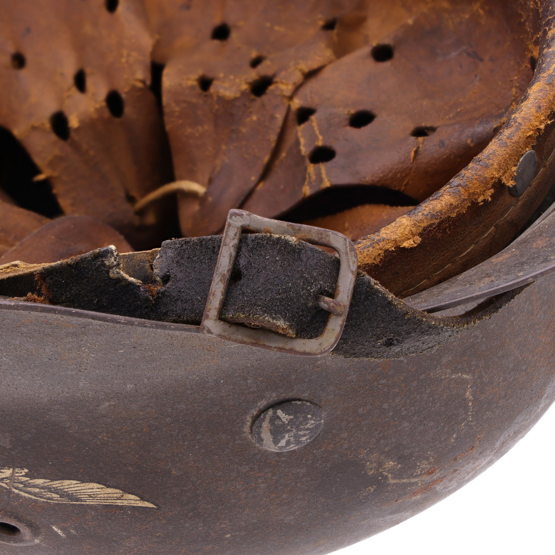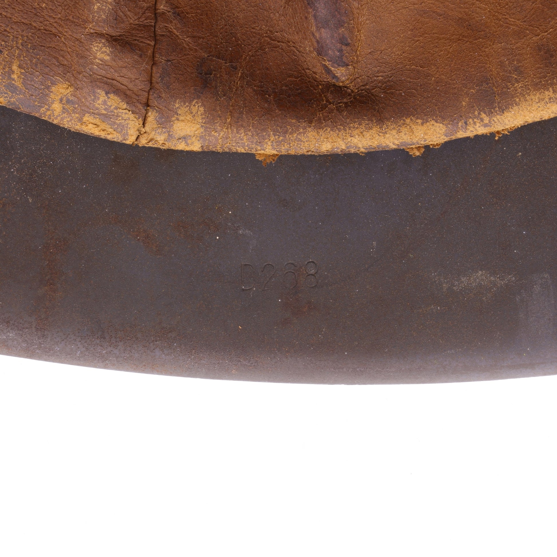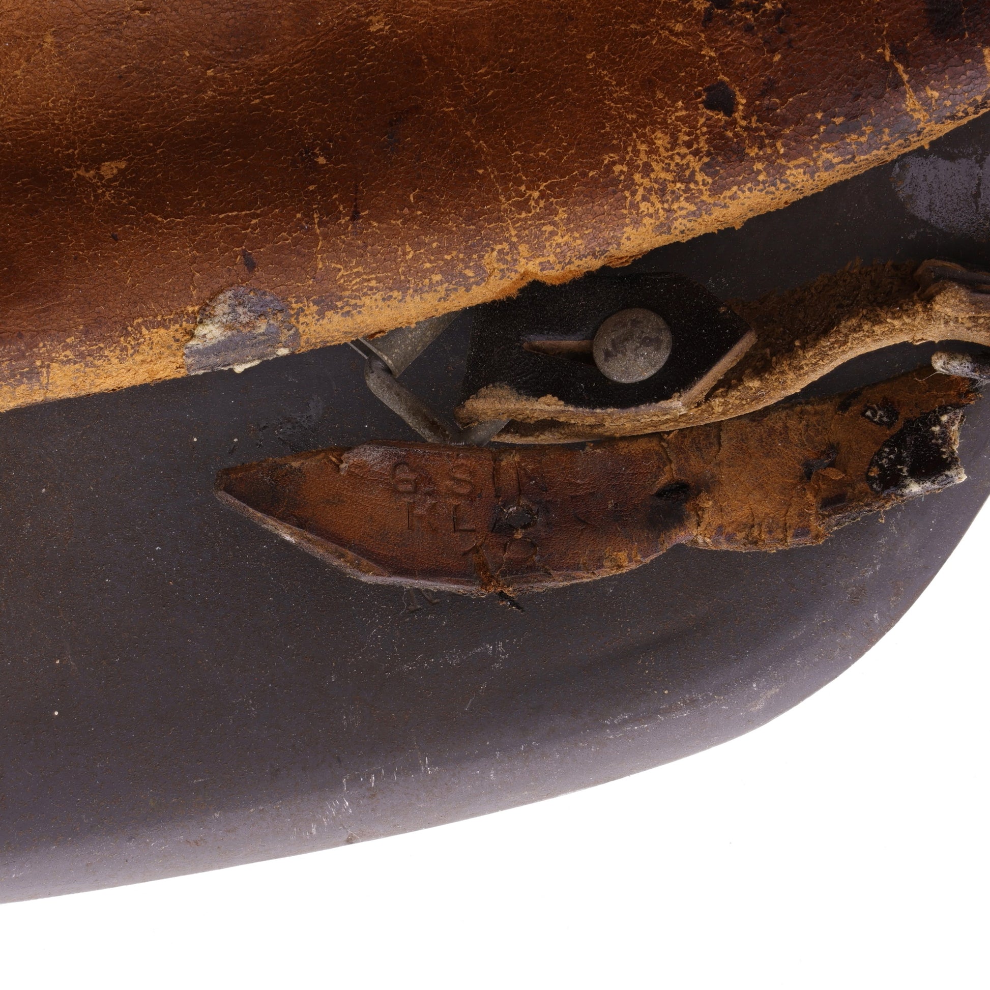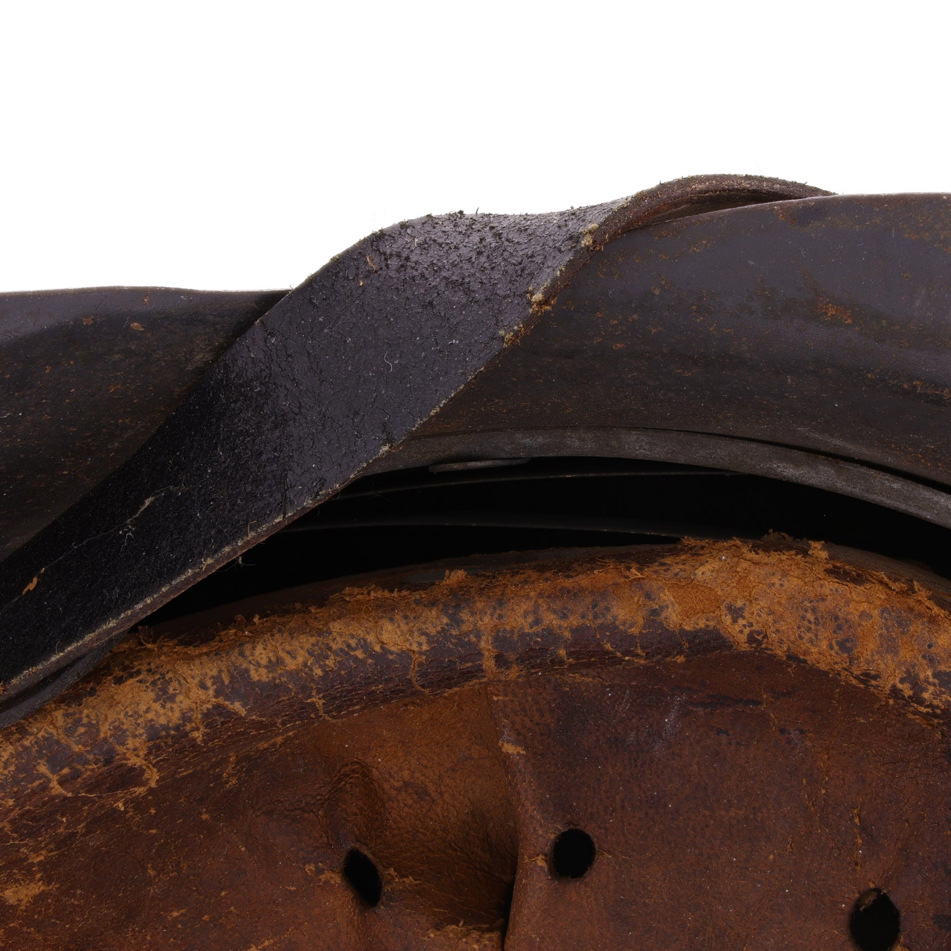 This helmet is in good, combat-used condition. There is minor surface rust throughout; however, it displays quite nicely with its original decal still intact. The leather liner's tongues remain intact; however, the chinstrap is unfortunately torn.
