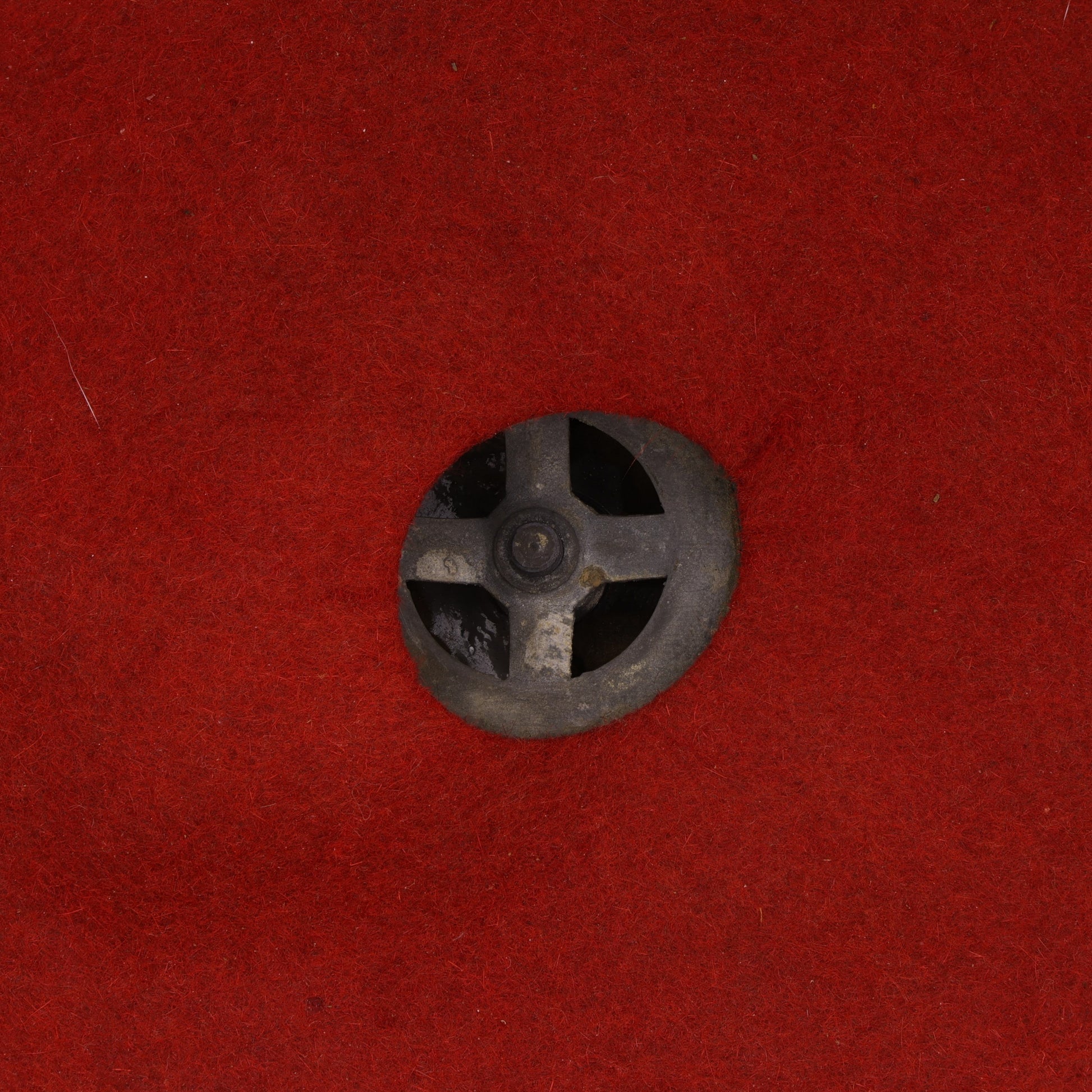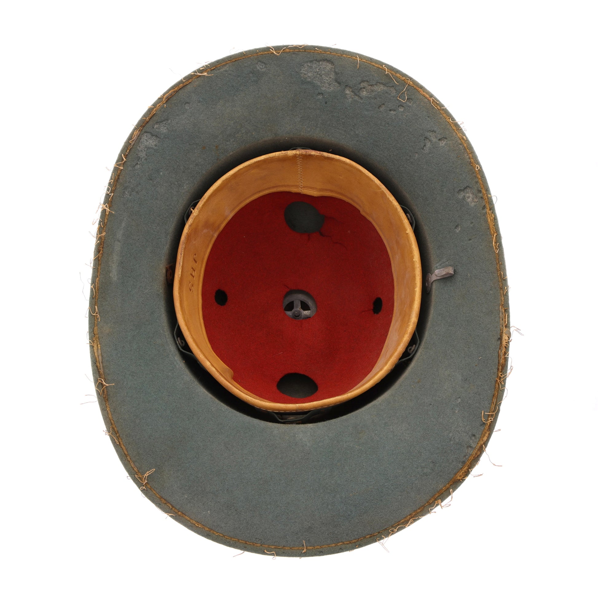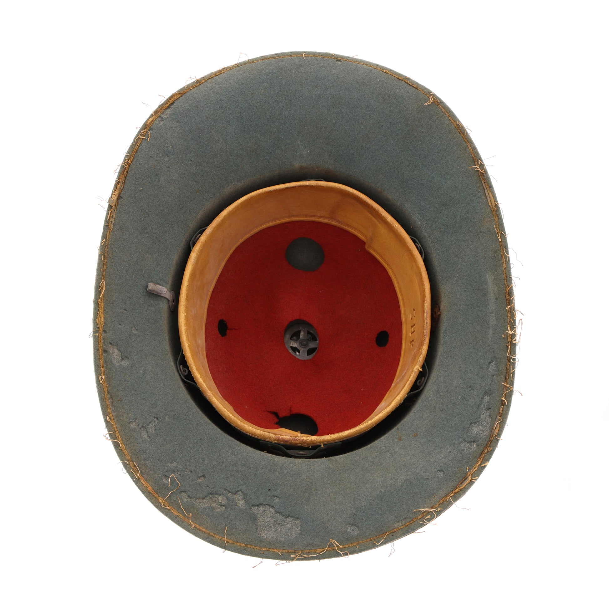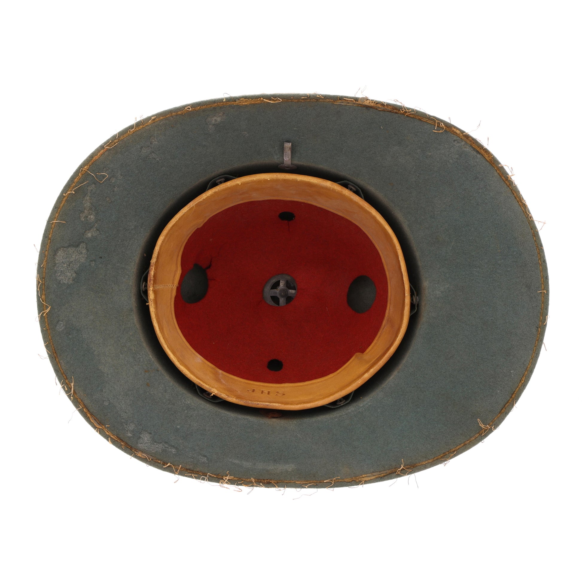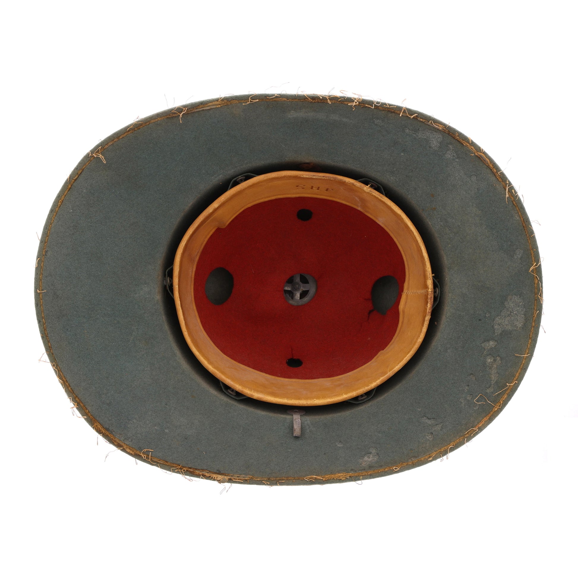 This helmet is in well used condition. Unlike many examples, its badges remain intact, however the helmet's leather brim has deteriorated, and its chinstrap is missing.
