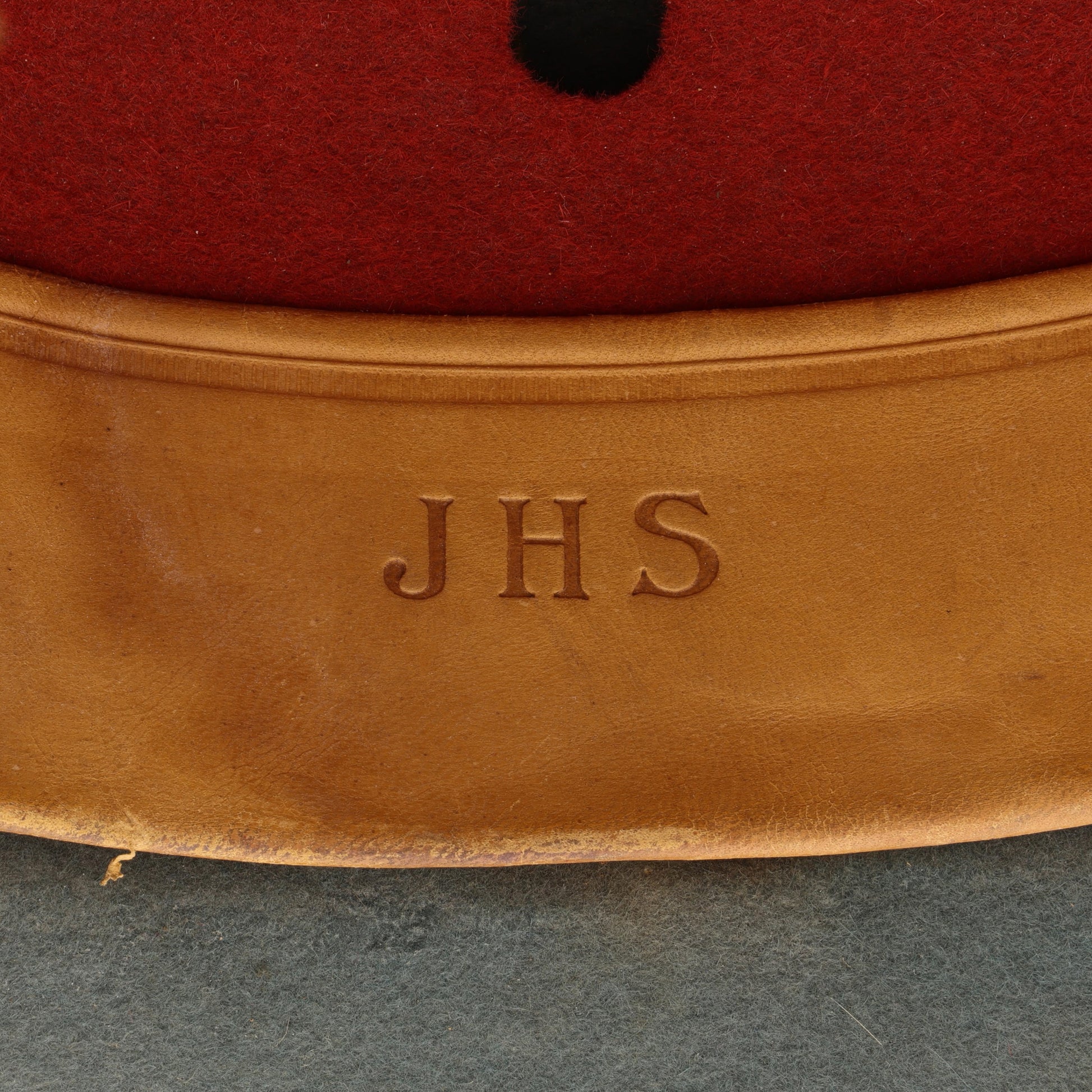 This is an original WWII German second pattern Heer Deutsches Afrikakorps (DAK) pith helmet, constructed of a felt-like material. The leather headband is embossed with the manufacturer's marking "JHS", and its underside is marked with both its size and production date, "56-1942", respectively. Interestingly, the red felt lining had a functional intent; German engineers believed red material helped dissipate heat and is a common staple among DAK headwear. It still retains both of its original Heer and national colors badges.