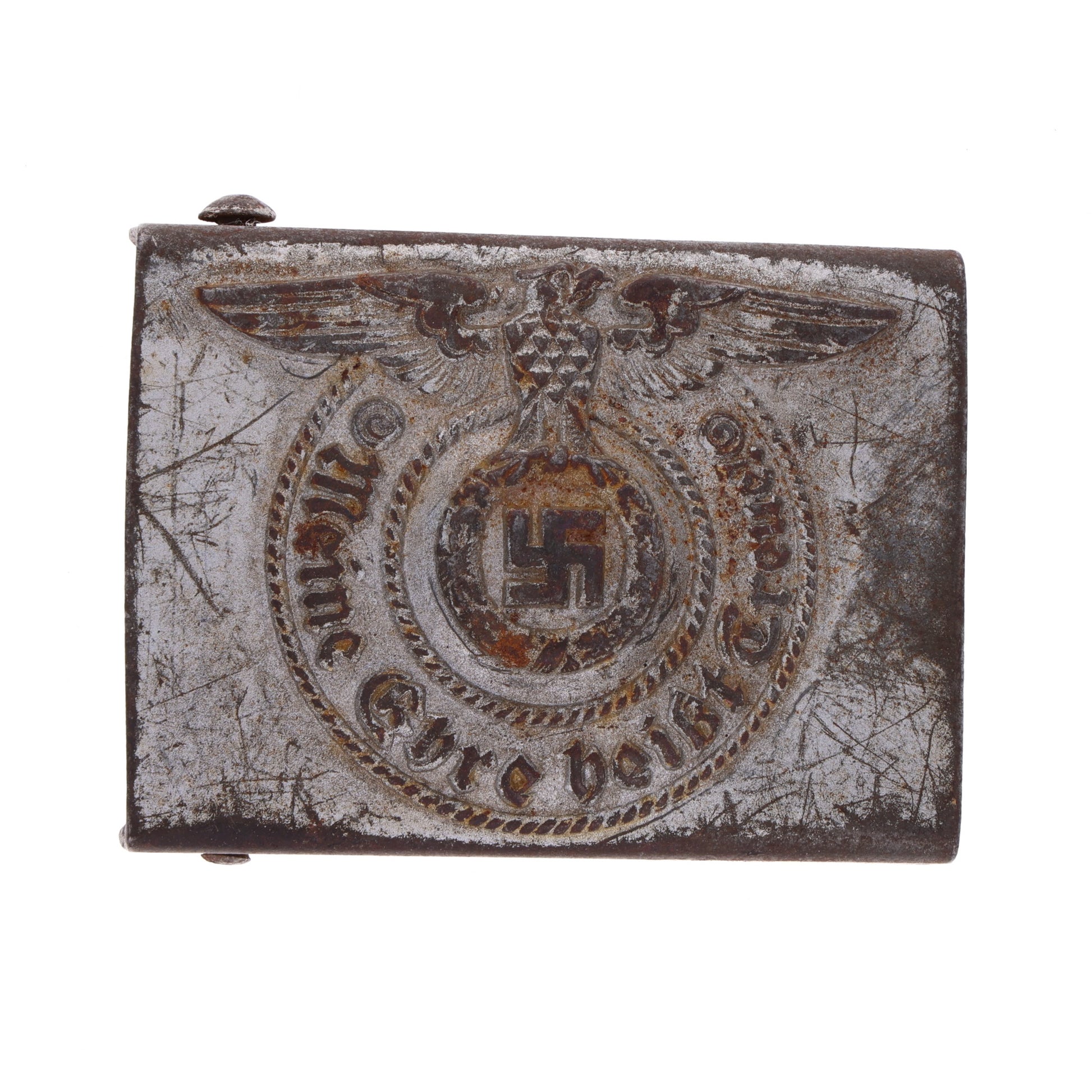 This is an original WWII German Waffen-SS belt buckle in silvered steel. The front bears the motto "Meine Ehre heißt Treue", or "My Honor is Loyalty", while the reverse is marked "RZM 155/43 ᛋᛋ", denoting 1943 production by Assmann & Söhne of Lüdenscheid, Germany.