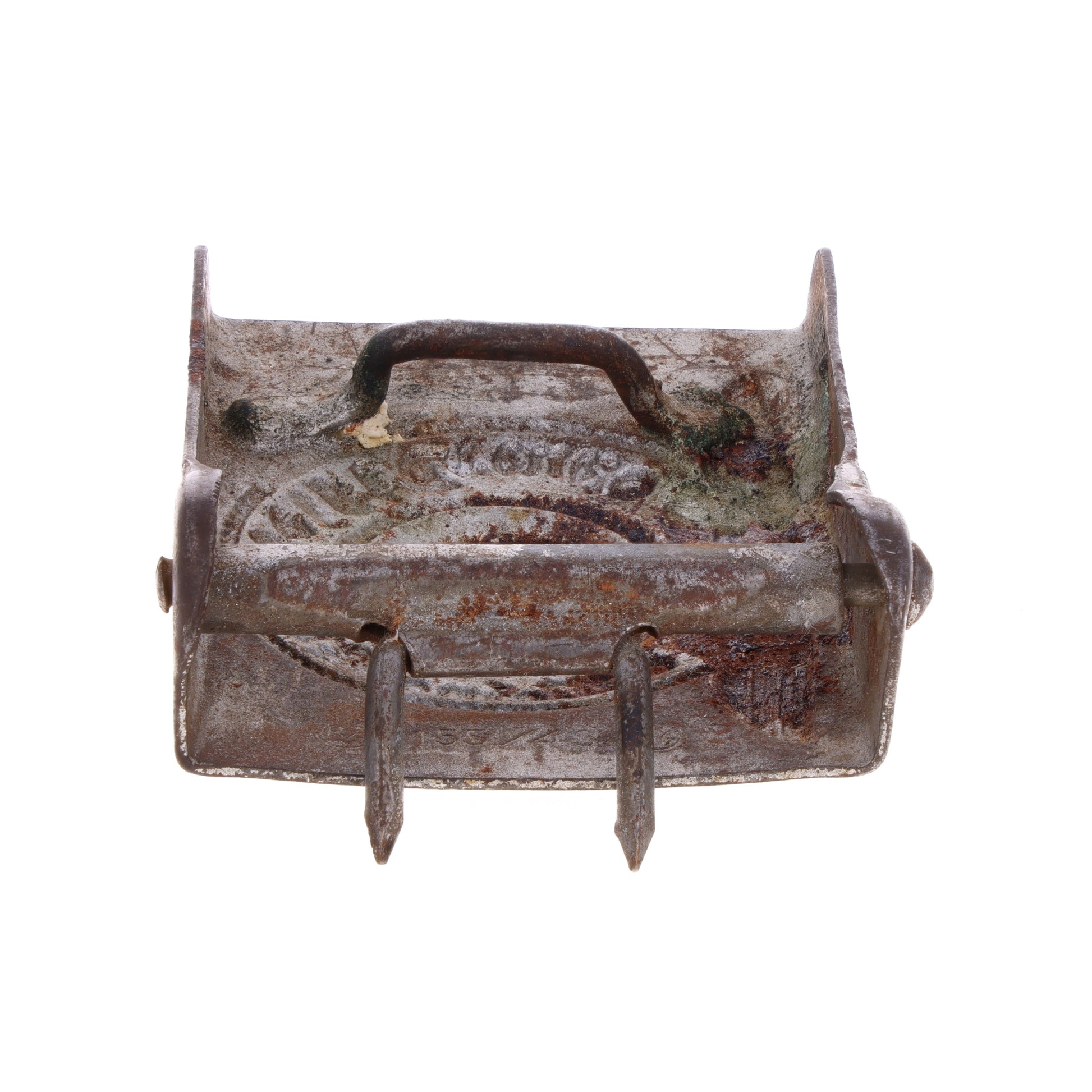 This piece is in good, used condition. It retains much of its silvered finish, however surface rust is present throughout. The catch and prongs are intact and functional.