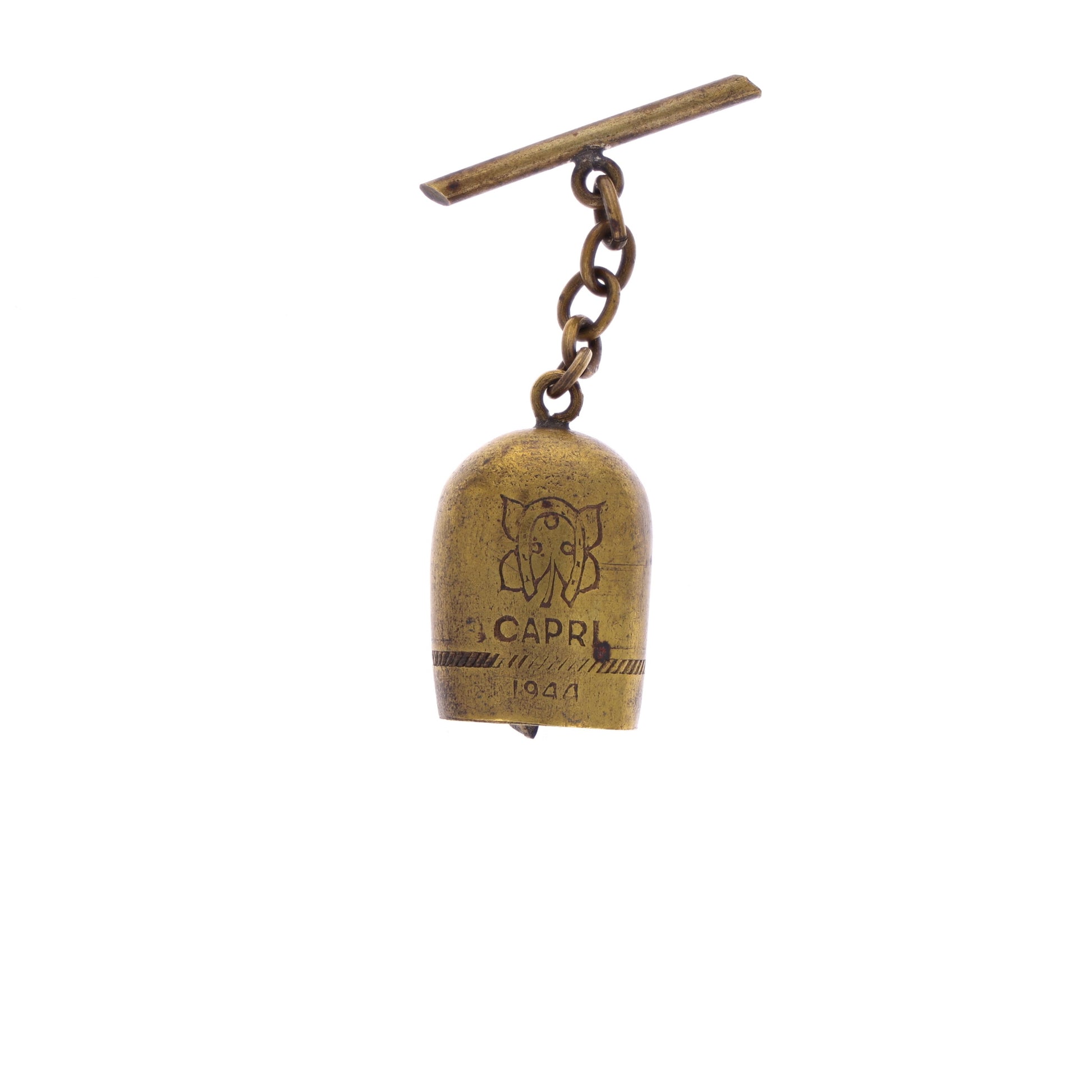 These small, good luck charms were often seen secured to the A-2 leather flight jackets of the 12th and 15th Air Force men who passed through Capri, Italy. Legend has it that a sudden flash of light stopped a young shepherd boy in his tracks and Saint Michele appeared on a white horse alongside the boy’s sheep, who was wearing around its neck a small shining bell adorned with the image of a four-leaf clover. This particular example is constructed of brass and is dated 1944. Interestingly, the Italian jeweler mis-translated "lucky" as "luchy".
