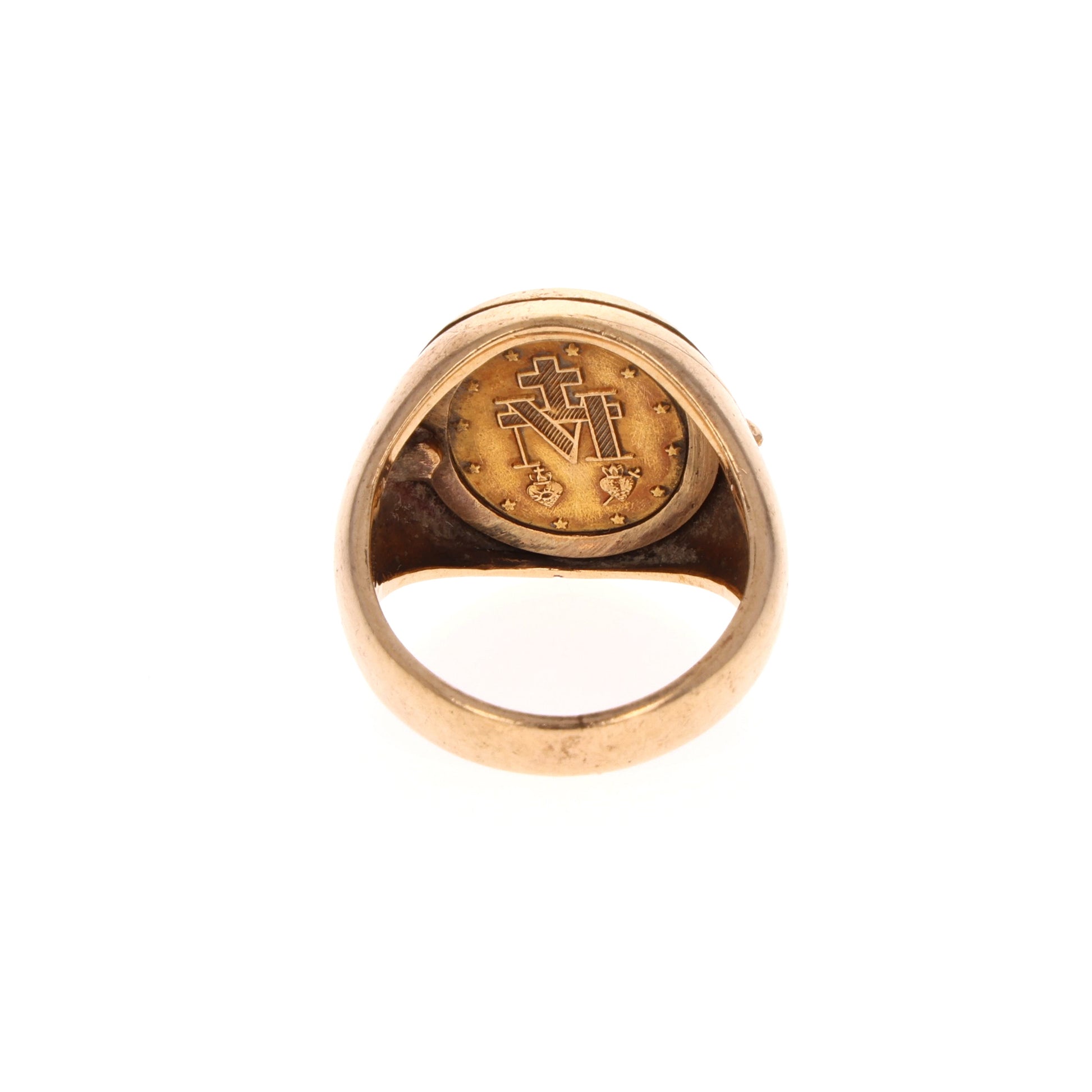 This is an original WWII U.S. airman's private purchase 10K gold ring made by New York City jewelers, Baden & Foss Incorporated. Its face showcases a winged propeller, and behind it the Miraculous Medal, consisting of the Marian Cross, the stylized Sacred Heart of Jesus crowned with thorns and the Immaculate Heart of Mary pierced with a sword, all flanked by 12 stars. Its interior is stamped "10K B&F". It is a size 5.25 and weighs approximately 8 grams.