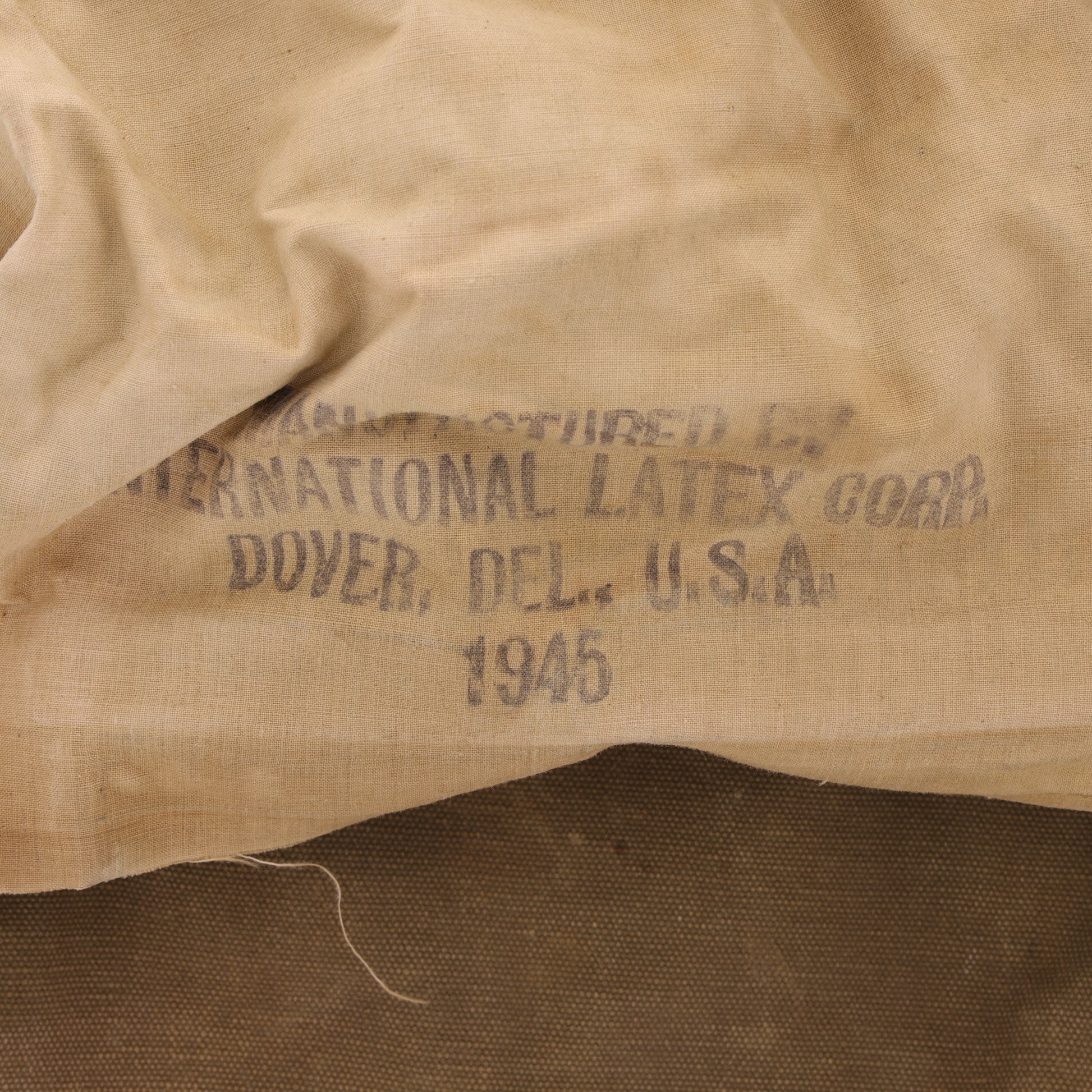 This is an original and rather uncommon WWII U.S. Army M1943 experimental 2-quart canteen with cover. The cover is constructed of OD#7 (green) webbing and is devoid of any markings. Inside is a collapsible bladder canteen originally intended to replace the M1942 aluminum canteens. It was manufactured by International Latex Corporation of Dover, Delaware in 1945.