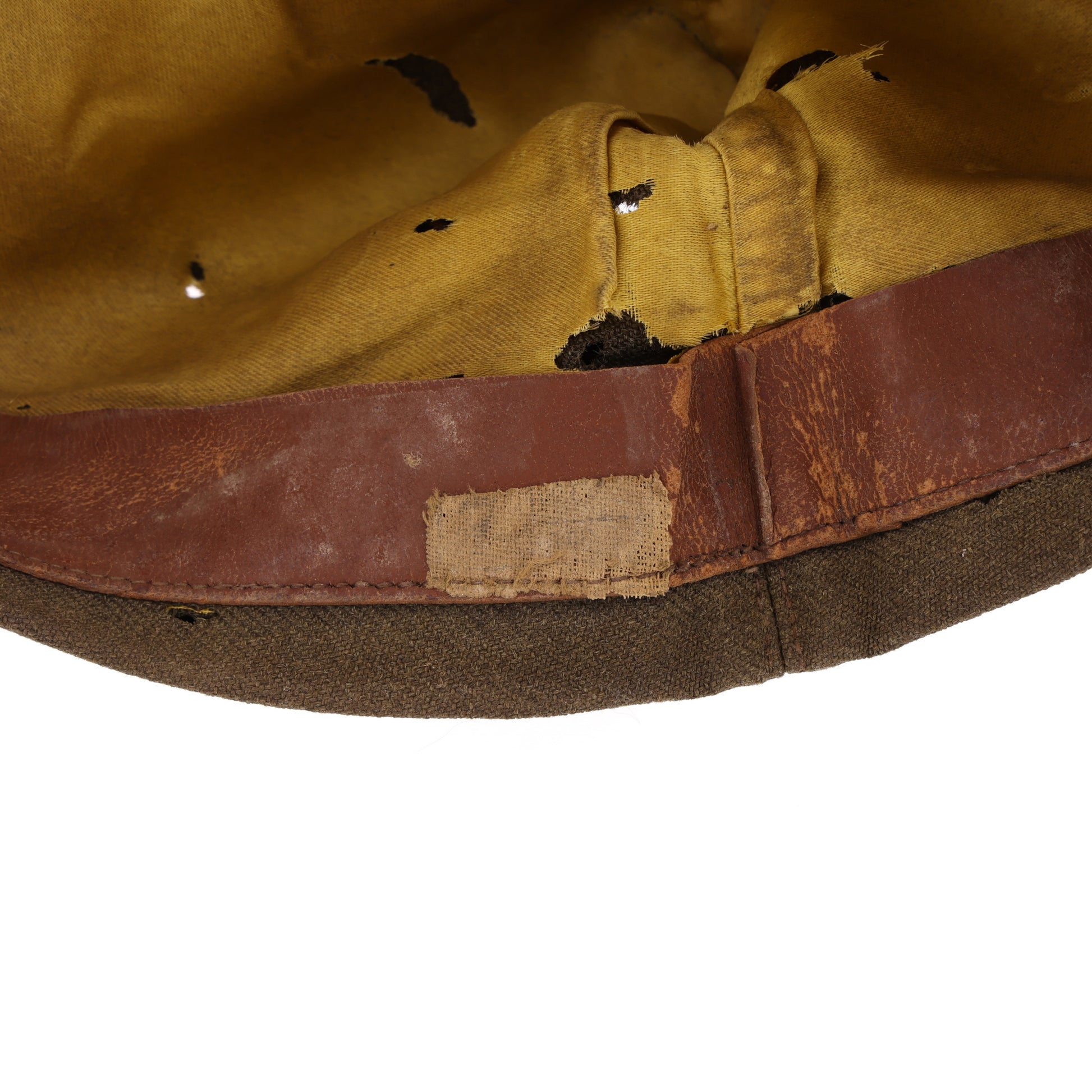 This is an original WWII U.S. garrison cap, with the "ultramarine" and "golden orange" piping, denoting use by the Army Air Corps. It is constructed of olive drab wool, with a yellow lining. Unfortunately, its manufacturer's and size label is faded beyond legibility.