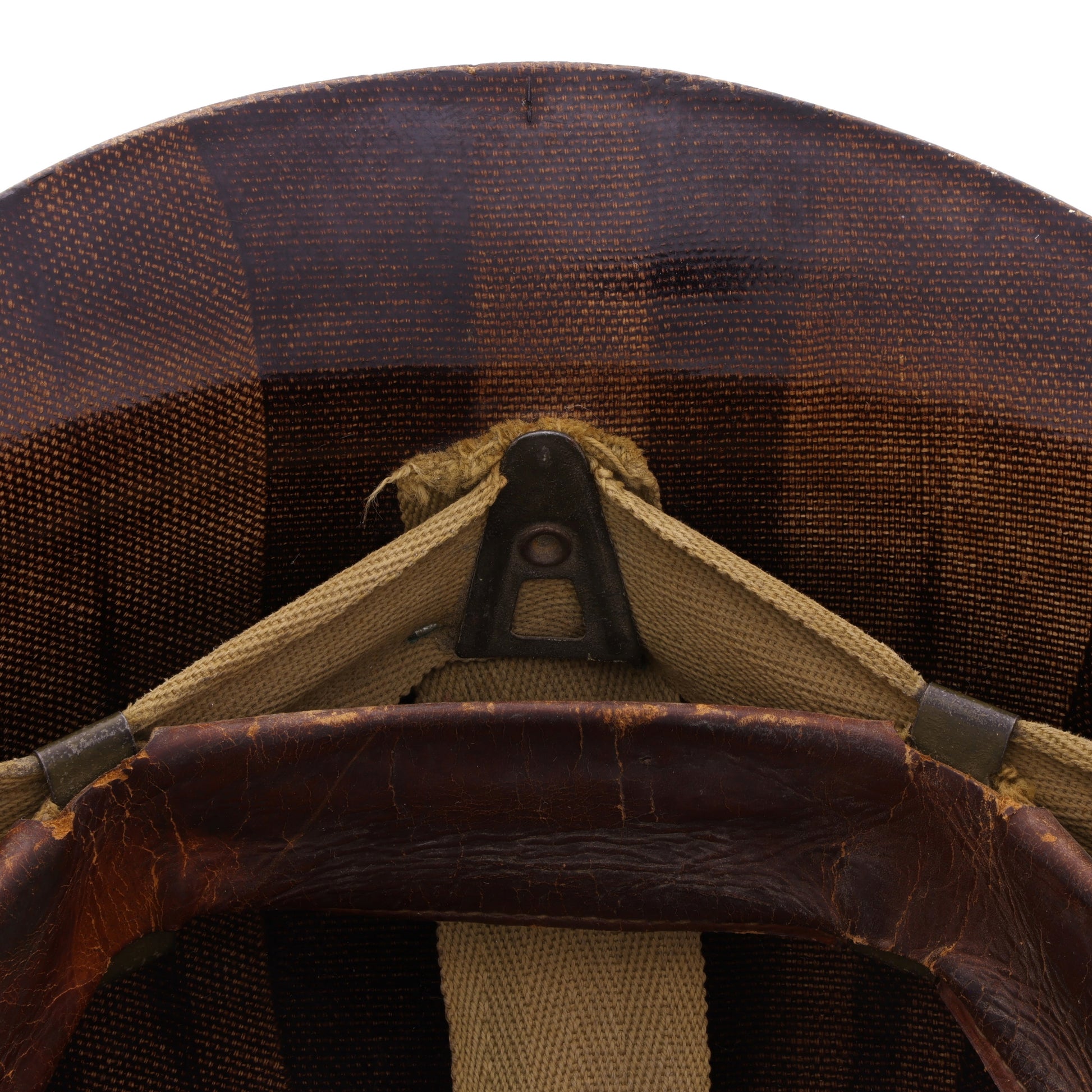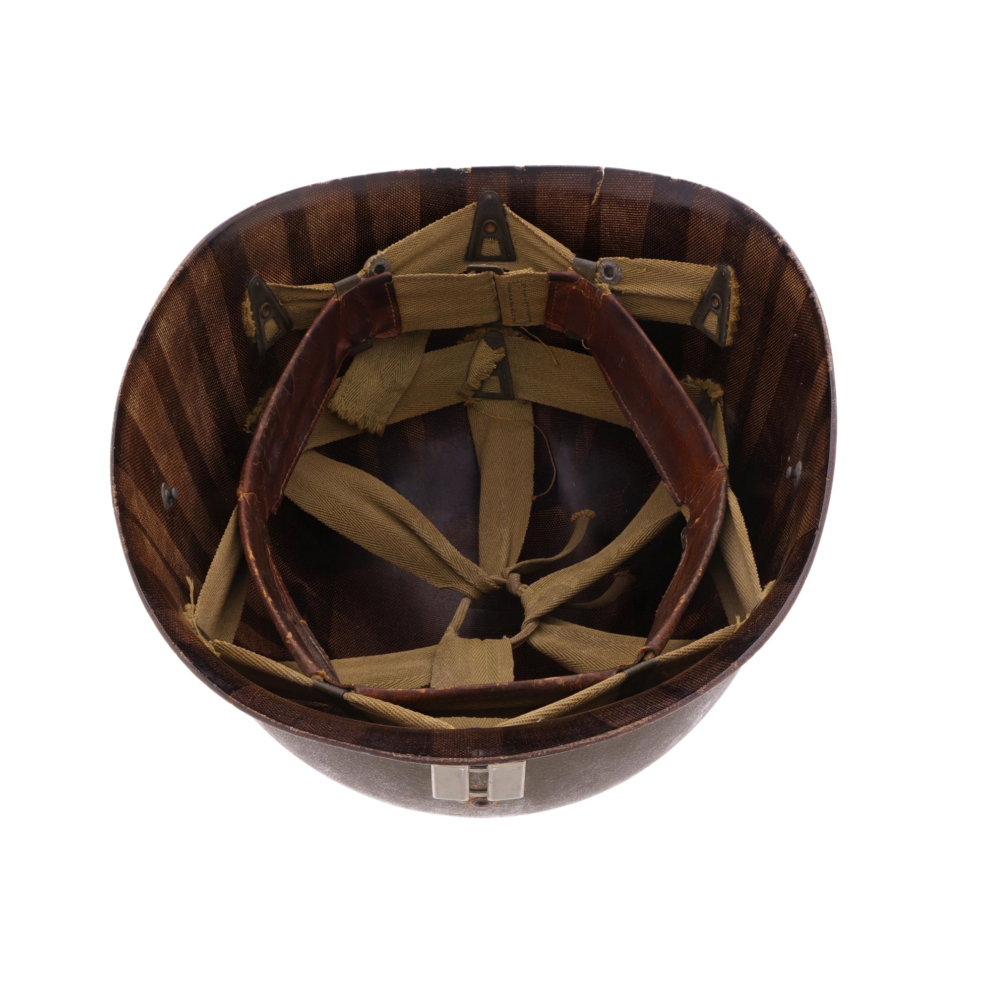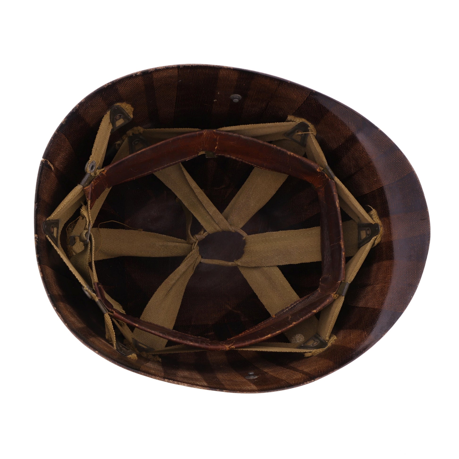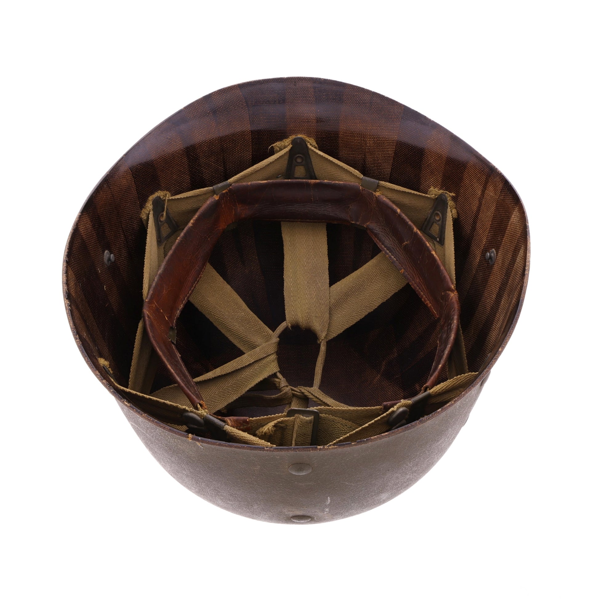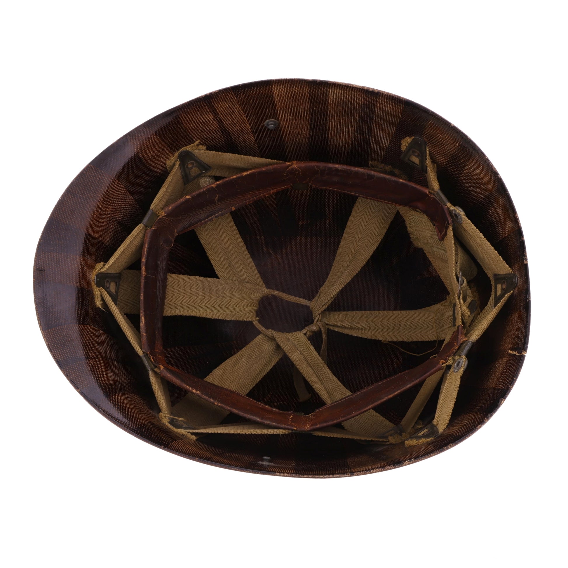 This is an original WWII U.S. M-1 helmet liner. Secured on its front is the original sterling silver rank insignia of a captain. Interestingly, the original owner created additional holes in order to pass the insignia's pins through. The duck cloth liner body was produced by Inland Manufacturing Division, a subsidiary of General Motors Company located in Dayton, Ohio, but was then finished by Firestone Tire and Rubber Company of Akron, Ohio, who received all of Inland's unfinished helmet liners when its focus shifted to producing other war materiel, such as the M-1 Carbine. It features green painted steel A-washers and an OD#3 (khaki) suspension, approximately dating the liner's production from mid-1943 to mid-1944. The suspension comes complete with its original Standard Handbags, Inc. headband. The liner's exterior retains its original olive drab factory finish.