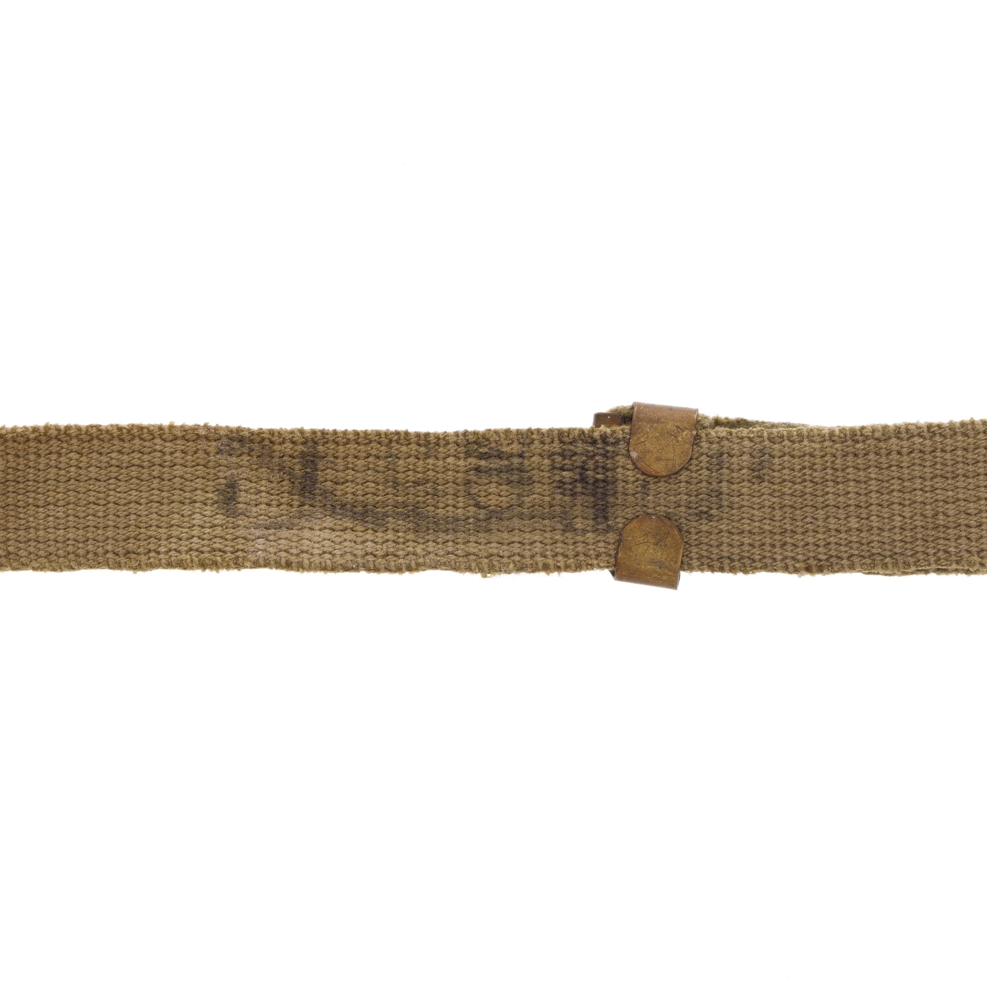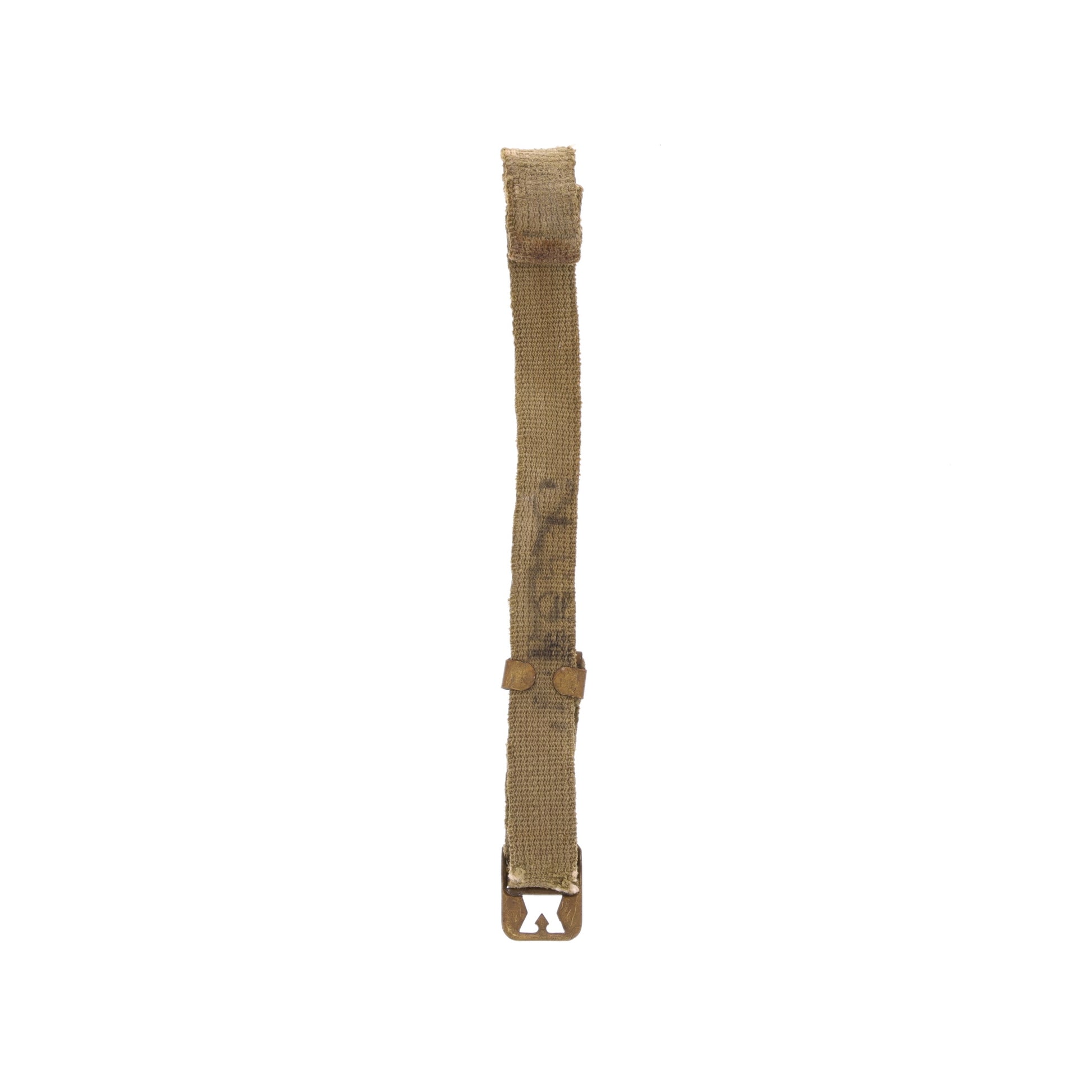 This is an original WWII U.S. M-1 helmet chinstrap, consisting of brass hardware and OD#3 (khaki) webbing. The buckle exhibits the raised bar, and the webbing is faintly stenciled with the original owner's laundry number. This chinstrap was recovered from an early-war McCord Radiator & Manufacturing Co. fixed loop helmet but would have also been seen on comparable Schlueter Manufacturing Co. examples.