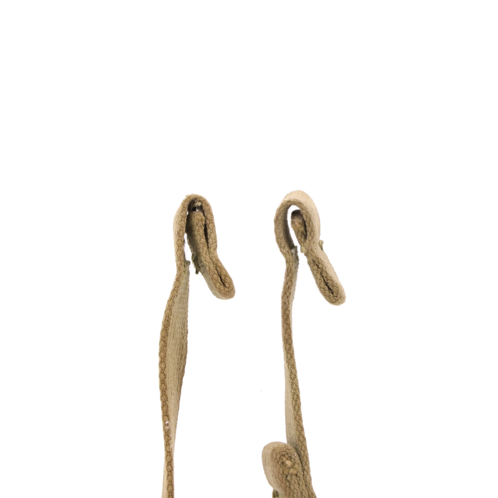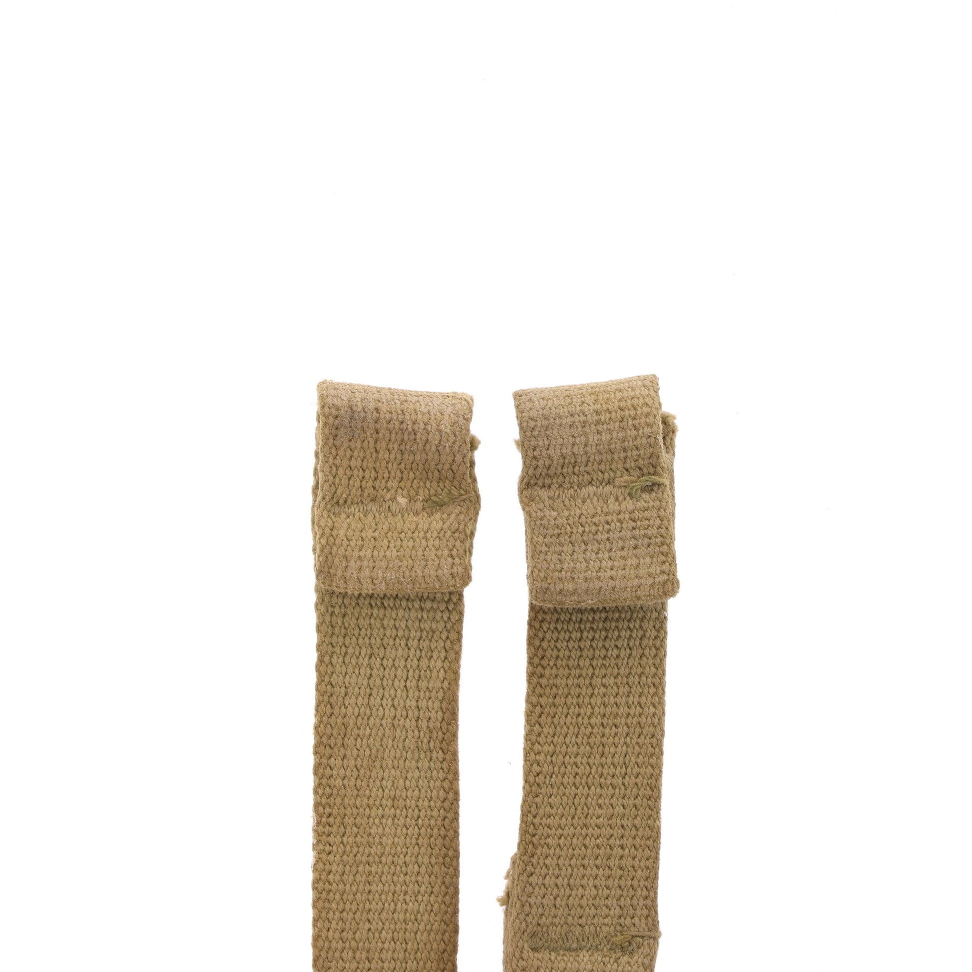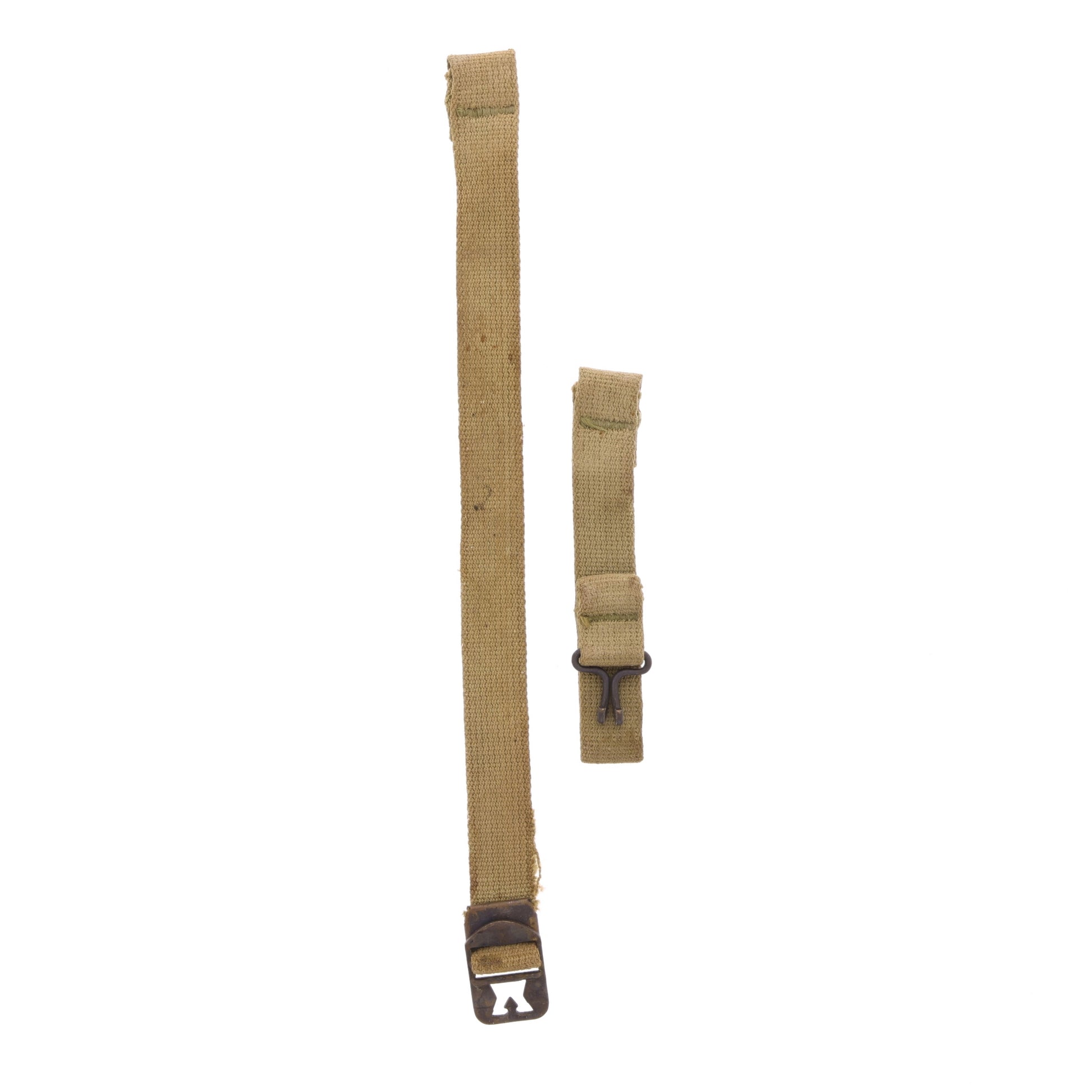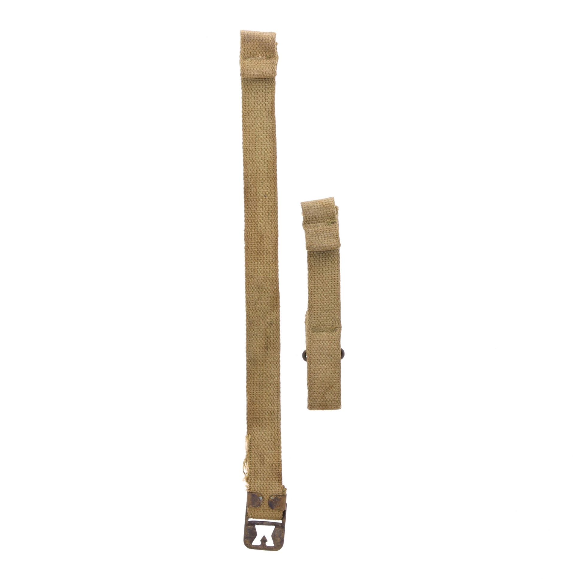 This is an original matching set of WWII U.S. M-1 helmet chinstraps, consisting of brass hardware and OD#3 (khaki) webbing. The buckle exhibits the raised bar. This set was recovered from a mid-war McCord Radiator & Manufacturing Co. swivel loop helmet but would have also been seen on comparable Schlueter Manufacturing Co. examples.