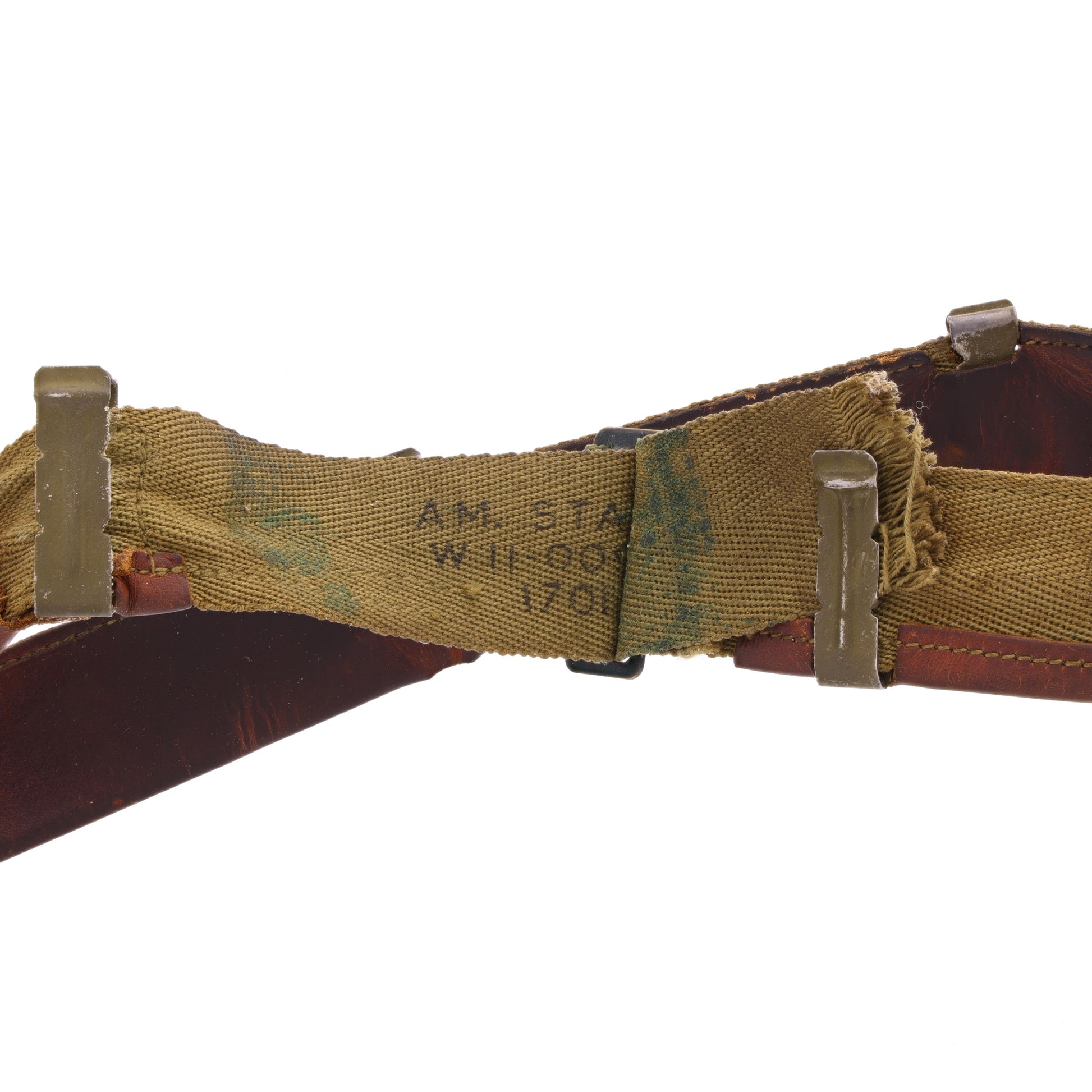 This original WWII U.S. M-1 helmet liner headband was produced by American Stay Co. The buckle is blackened brass, while the third pattern spring clips are green painted steel - a combination introduced on November 5, 1943, and utilized until the end of the war. This would be an ideal headband for a helmet liner with either green painted steel or blackened brass A-washers.