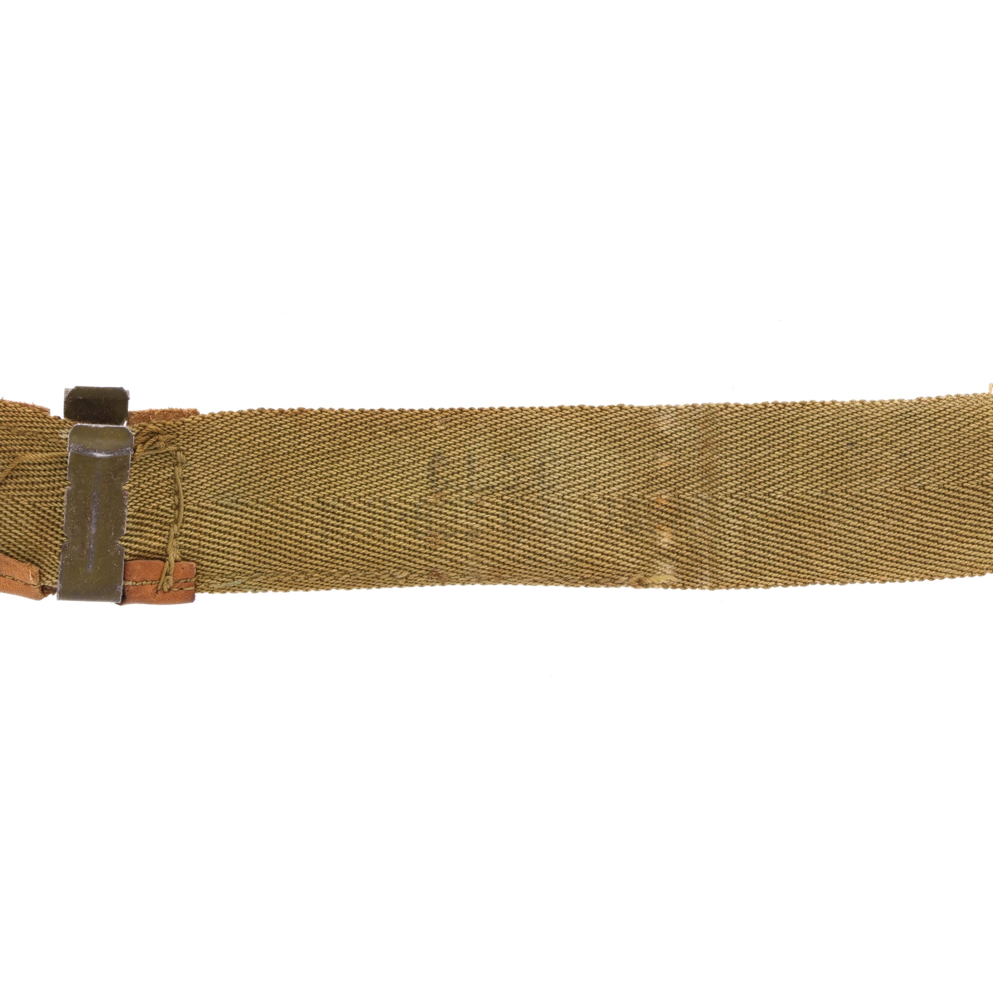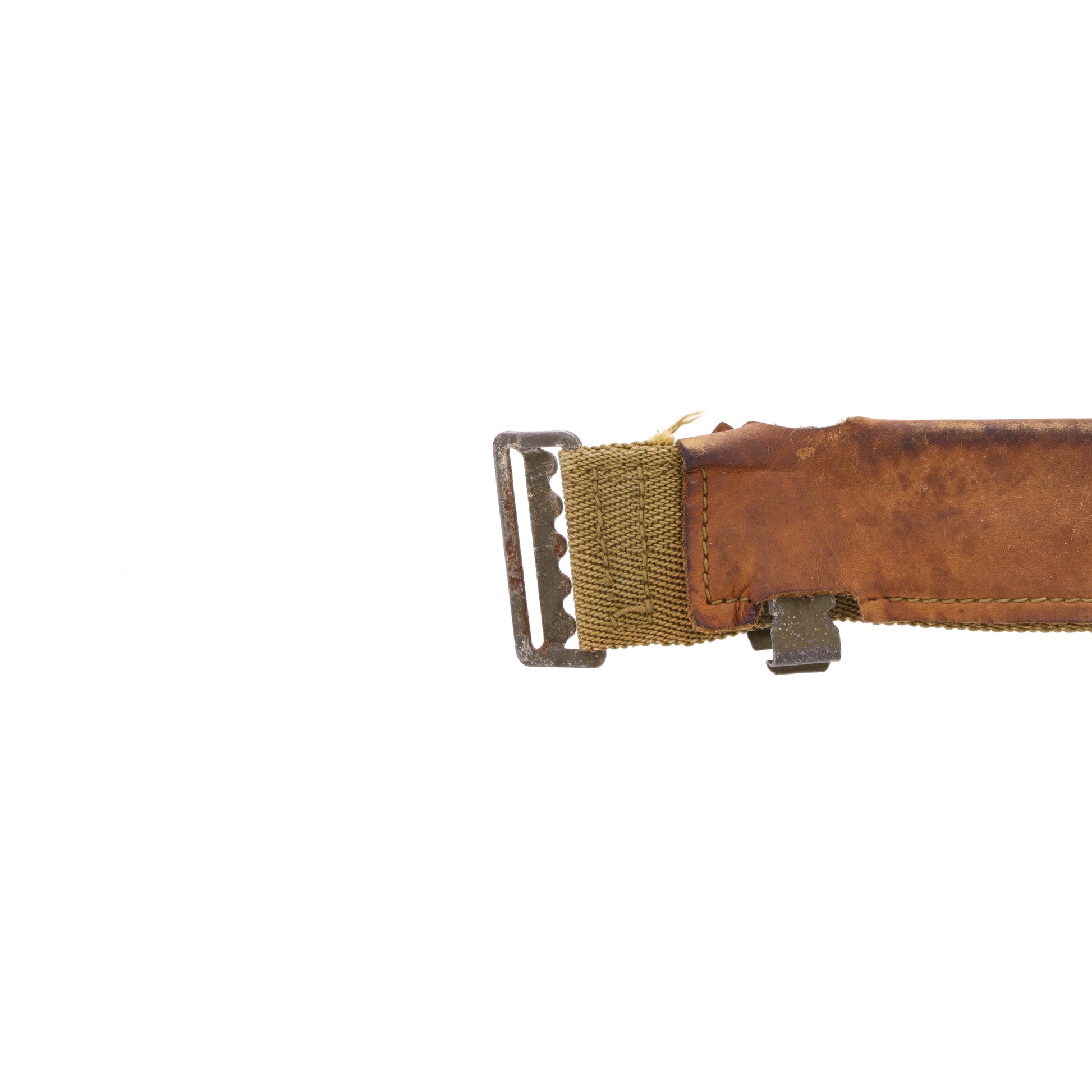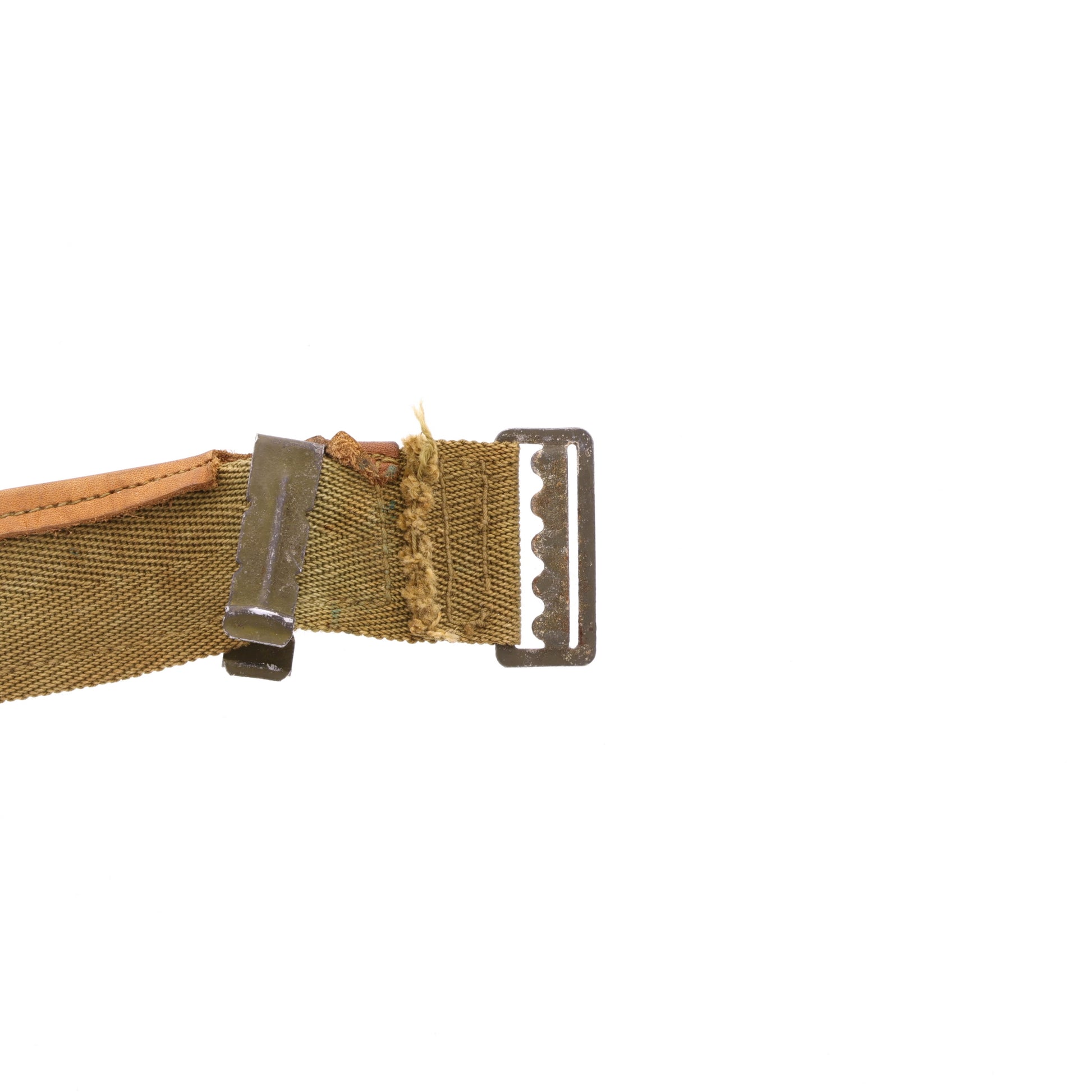 This original WWII U.S. M-1 helmet liner headband was produced by Chris Laganas Shoe Co. The hardware is green painted steel, approximately dating its production from mid-1942 to late-1943. It exhibits third pattern spring clips, which have a fold in the metal's bottom edge. This would be an ideal headband for a helmet liner with either non-painted or green painted steel A-washers.