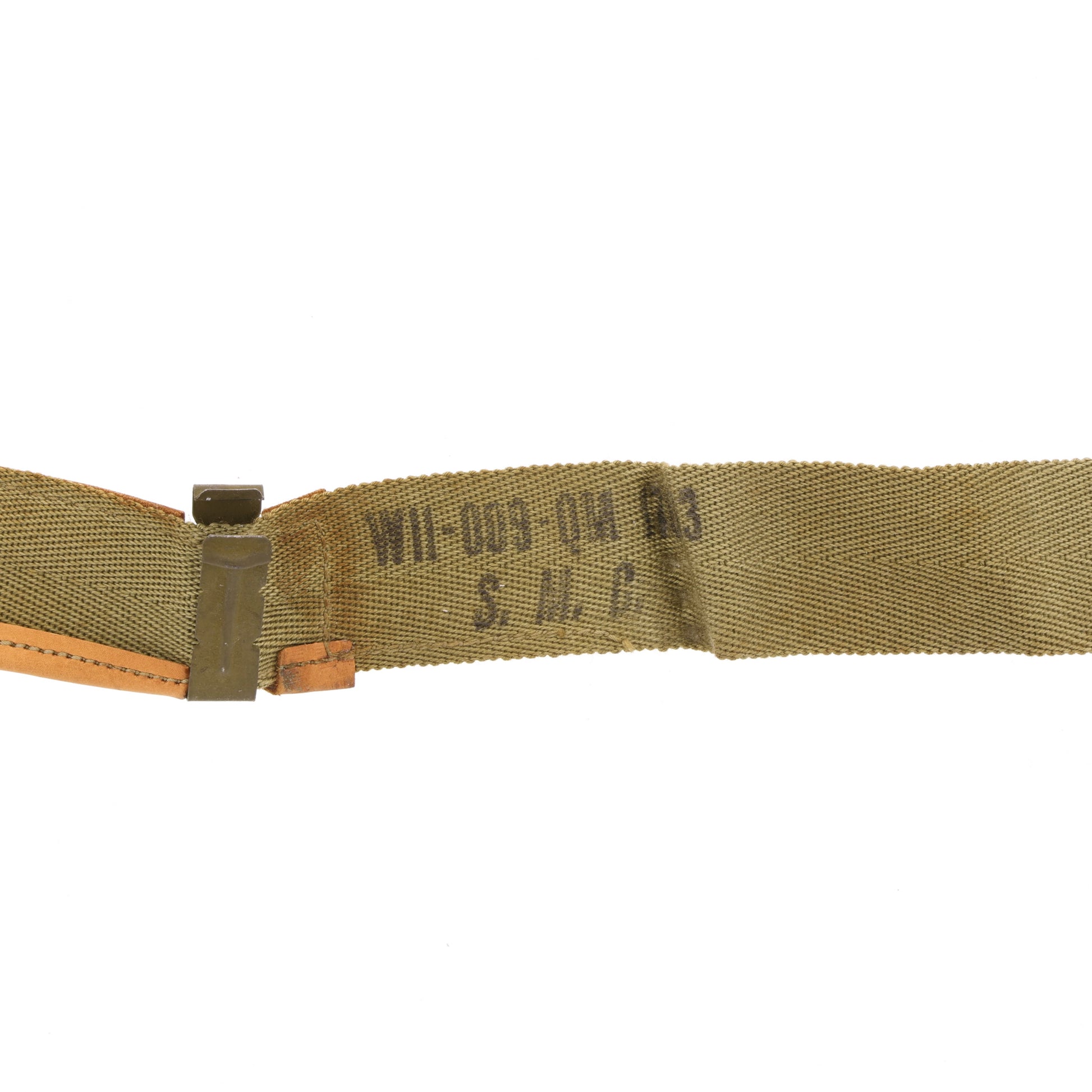 This listing is for a single original WWII U.S. M-1 helmet liner headband; however, five are available. These were all produced by Scholl Manufacturing Co. and bare the contract code of "W11-009-QM 17003". The hardware is green painted steel, approximately dating their production from mid-1942 to late-1943. They exhibit third pattern spring clips, which have a fold in the metal's bottom edge. These would be ideal headbands for helmet liners with either non-painted or green painted steel A-washers.